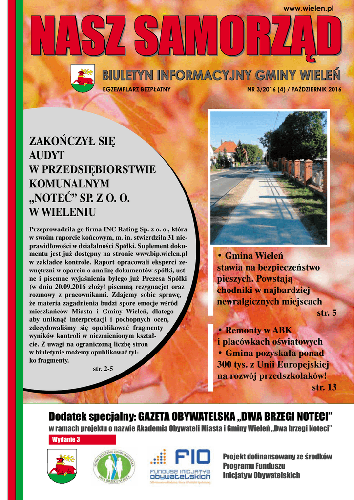 NASZ SAMORZĄD www.wielen.pl BIULETYN INFORMACYJNY GMINY WIELE¡ EGZEMPLARZ BEZPŁATNY NR 3/2016 (4) / PAèDZIERNIK 2016 ZAKOŃCZYŁ SIĘ AUDYT W PRZEDSIĘBIORSTWIE KOMUNALNYM „NOTEĆ” SP. Z O. O. W WIELENIU Przeprowadziła go firma INC Rating Sp. z o. o., która w swoim raporcie końcowym, m. in. stwierdziła 31 nieprawidłowości w działalności Spółki. Suplement dokumentu jest już dostępny na stronie www.bip.wielen.pl w zakładce kontrole. Raport opracowali eksperci zewnętrzni w oparciu o analizę dokumentów spółki, ustne i pisemne wyjaśnienia byłego już Prezesa Spółki (w dniu 20.09.2016 złożył pisemną rezygnacje) oraz rozmowy z pracownikami. Zdajemy sobie sprawę, że materia zagadnienia budzi spore emocje wśród mieszkańców Miasta i Gminy Wieleń, dlatego aby uniknąć interpretacji i pochopnych ocen, zdecydowaliśmy się opublikować fragmenty wyników kontroli w niezmienionym kształcie. Z uwagi na ograniczoną liczbę stron w biuletynie możemy opublikować tylko fragmenty. str. 2-5 • Gmina Wieleń stawia na bezpieczeństwo pieszych. Powstają chodniki w najbardziej newralgicznych miejscach str. 5 • Remonty w ABK i placówkach oświatowych • Gmina pozyskała ponad 300 tys. z Unii Europejskiej na rozwój przedszkolaków! str. 13 Dodatek specjalny: GAZETA OBYWATELSKA „DWA BRZEGI NOTECI” w ramach projektu o nazwie Akademia Obywateli Miasta i Gminy Wieleń „Dwa brzegi Noteci” Wydanie 3 Projekt dofinansowany ze środków Programu Funduszu Inicjatyw Obywatelskich Biuletyn Informacyjny Gminy Wieleń Elżbieta Rybarczyk Burmistrz Wielenia Wszystkim nam zależy na tym, aby nasza gmina, a tym sa- mym instytucje działające w jej strukturach, były dobrze zarządzane, a także rzetelnie i gospodarnie pracowały na rzecz naszych mieszkańców. Bez gospodarności nie ma rozwoju, bez rozwoju nie ma pracy. Musimy o tym pamiętać. Zarządzanie gminą rozpoczęłam od sukcesywnego budowania sprawnego i kompetentnego zespołu, który jest gwarancją i motorem zmian. Od samego początku, na bieżąco, informujemy Państwa o wszystkich decyzjach za pośrednictwem mediów oraz podczas zebrań wiejskich, osiedlowych czy innych spotkań z mieszkańcami. Pracujemy w oparciu o rzetelnie opracowane dokumenty i analizy. Materiałem wyjściowym do podejmowania przemyślanych i odpowiedzialnych decyzji był przeprowadzony w zeszłym roku „bilans otwarcia” budżetu Gminy Wieleń, który został już przedstawiony opinii publicznej. Ten dokument „Potencjał pracowników pokazał nam słabe punkty, które mają najbardziej Spółki jest dobry, ale negatywny wpływ na (i tak bardzo napiętą) sytuację przez złe zarządzanie finansową w gminie. Ponad 36 mln zadłużenia, które nie był dobrze rozpisane jest do spłaty do 2028 roku – to najważniejwykorzystywany” sze, ale nie jest to jedyne obciążenie budżetu. Bilans wyraźnie pokazał nam obszary, które generują największe straty w budżecie Gminy Wieleń. O tym również Państwa informowaliśmy. Największym problemem, z jakim zmierzyliśmy się ostatnio, było źle zarządzane Przedsiębiorstwo Komunalne „Noteć”, co w efekcie przynosiło straty finansowe dla gminy. Jestem w pełni świadoma odpowiedzialności za spółkę, w której mamy 100 % udziału, dlatego uczestniczyłam w posiedzeniach Rady Nadzorczej. Podczas posiedzeń rzadko poruszano sprawy dotyczące właściwego funkcjonowania spółki, a zwłaszcza możliwości jej rozwoju. Moje rozczarowanie stylem pracy byłej Rady Nadzorczej oraz Prezesa PK „Noteć”, a także podejściem do wcześniejszego nadzoru nad spółką ze strony Gminy – było ogromne! Ze sprawozdań składanych przez spółkę wynikało, że generuje ona duże straty. Rozmowy o szukaniu sposobów naprawy sytuacji były wyraźnie ignorowane, zarówno przez ówczesną Radę Nadzorczą, jak i kierownictwo Spółki. Z kolei w Gminie brakowało osoby wyznaczonej ustawowo do prowadzenia spraw związanych z nadzorem właścicielskim. Zauważyliśmy również wiele nieprawidłowości organizacyjnych. W takiej sytuacji podjęłam decyzję o zmianach na stanowiskach, dotyczyło to Rady Nadzorczej oraz obsługi prawnej. Wspólnie z nowymi osobami podejmowaliśmy próby racjonalizacji i dogłębnego badania sytuacji spółki. Z nowymi członkami Rady Nadzorczej podjęliśmy również decyzję o wprowadzeniu audytu. Bardzo szczegółowy materiał pokazał nam nieprawidłowości, które doprowadziły spółkę do tak złej sytuacji finansowej. Okazuje się, że przez wiele lat jedyną formą rzekomego „ratowania spółki” było dofinansowywanie w wymaganej wysokości przez Radę Miejską z budżetu gminy. Taka forma ciągłego wspierania spółki (bez ograniczeń) doprowadziła w konsekwencji do zaniedbań i braku zaangażowania w jej rozwój. Przez lata nie podjęto próby wprowadzenia nowych rozwiązań, a tym samym dostosowania się do rynku. Spółka (jako przedsiębiorstwo) mogła świadczyć szereg usług, jednak w świadomy sposób z tego rezygnowała, co powodowało stały regres. Wprowadzanie zmian, w szczególności tych, które dotykają ludzi, musi być przemyślane i poprzedzone analizami. Jeśli po przeprowadzeniu analiz nie ma już wątpliwości, co do konieczności wdrożenia zmian, to należy podjąć takie działania. Tak stało się w przypadku Przedsiębiorstwa Komunalnego „Noteć”. Pamiętam słowa osoby kontrolującej spółkę, która podczas podsumowania audytu powiedziała: „Pani Burmistrz, tym strach zarządzać”. Rzeczywiście, z analizy wynika, że w firmie panuje kompletny chaos organizacyjny, brakuje podstawowej dokumentacji, a przepływy finansowe są realizowane w sposób nieprawidłowy. Problemem jest również brak planowania oraz strategicznego podejścia do zarządzania. Od 2015 roku Gmina podejmowała decyzje mające na celu przywrócenie stabilności w spółce. Świadczą o tym zmiany kadrowe, począwszy od wprowadzenia zmian w