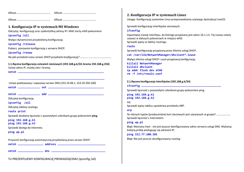 Album …………………………………….… Album …………………………………….… Album …………………………………….… Album …………………………………….… 1. Konfiguracja IP w systemach MS Windows Odczytaj konfigurację oraz zyidentyfikuj adresy IP i MAC karty eth0 poleceniem ipconfig /all Wyłącz dynamicznie przydzieloną konfigurację. ipconfig /release Pobierz ponownie konfigurację z serwera DHCP. ipconfig /renew Na jaki przedział czasu serwer DHCP przydziela konfigurację? ........................................... 1.1.Ręczna konfiguracja ustawień sieciowych (192.168.g.k/24; brama 192.168.g.254) Ustaw adres IP, maskę sieci i bramę. netsh ……………………………………………………………………………………………………………………………………………… 2. Konfiguracja IP w systemach Linux Uwaga: Konfigurację systemów Linux przeprowadzamy używając dystrybucji LiveCD. Sprawdź konfigurację interfejsów sieciowych. ifconfig Zapamiętaj nazwę interfejsu, do którego przypisany jest adres 10.1.1.k. Tej nazwy należy używać w dalszych poleceniach w miejsce eth0. Sprawdź wpisy w tablicy routingu. route Sprawdź konfigurację przypisaną przez klienta usługi DHCP. cat /var/lib/NetworkManager/dhclient*.lease Wyłącz klienta usługi DHCP i usuń przypisaną konfigurację. killall NetworkManager killall dhclient ip addr flush dev eth0 rm -f /etc/resolv.conf ……………………………………………………………………………………………………………………………………………… Ustaw podstawowy i zapasowy serwer DNS (153.19.48.1, 153.19.250.100) netsh …………………………………… set …………………………………………………………………………………………… netsh …………………………………… add …………………………………………………………………………………………… Odczytaj konfigurację ipconfig /all 2.1.Ręczna konfiguracja interfejsów (192.168.g.k/24) ifconfig …………………………………………………………………………………………………………………………………… Sprawdź łączność z pozostałymi członkami grupy poleceniem ping. ping 192.168.g.k1 ping 192.168.g.k2 Odczytaj tablicę routingu route print itd. Sprawdź wpisy tablicy sąsiedztwa protokołu ARP. arp Sprawdź działanie łączności z pozostałymi członkami grupy poleceniem ping. ping 192.168.g.k1 ping 192.168.g.k2 Ile różnych typów (producentów) kart sieciowych jest używanych w grupie? ………………… Sprawdź łączność z Internetem. ping wp.pl Sprawdź dostęp do Internetu ping wp.pl Błąd: Nieznany host - nie jest jeszcze skonfigurowany adres serwera usługi DNS. Wykonaj kolejną próbę posługując się adresem IP. ping 212.77.100.101 Przywróć konfigurację automatyczną przydzielaną przez serwer DHCP netsh ………………………………………… address ……………………………………………………………………………… Błąd: Nie jest jeszcze skonfigurowany routing. netsh ………………………………………… dns ………………………………………………………………………………………… TU PREZENTUJEMY KONFIGURACJĘ PROWADZĄCEMU (ipconfig /all) 2.2.Ręczna konfiguracja routingu (brama 192.168.g.254) Sprawdź łączność z bramą. ping 192.168.g.254 Ustaw domyślną bramę (uwaga: proszę użyć składni ze słowem default) route …………………………………………………………………………………………………………………………………… Czytając numerycznie tablicę routing route –n można zauważyć, że domyślna brama to brama do sieci 0.0.0.0 przy masce 0.0.0.0 Poprawna jest zatem też składnia: route add -net 0.0.0.0 netmask 0.0.0.0 gw 192.168.g.254 Sprawdź łączność ze światem: ping 212.77.100.101 Ustaw konfigurację domyślnej bramy na adres 10.1.0.1. ip route ……………………………………………………………………………………………………………………………… ip route show Sprawdź poprawność działania sieci. 2.6.Trasy datagramów traceroute wp.pl 2.3.Konfiguracja DNSów Adresy serwerów DNS są przechowywane w pliku konfiguracyjnym /etc/resolv.conf w kolejnych liniach poprzedzone napisem nameserver np. nameserver 153.19.48.1 Przed konfiguracją proszę sprawdzić, który z poniższych DNSów odpowiada najszybciej i wybrać go jako podstawowy (pierwszy w pliku): 10.1.0.1 153.19.250.100 8.8.8.8 Przykład: time nslookup wp.pl 10.1.0.1 Który z serwerów DNS odpowiada najszybciej? Tu warto porównać wynik działania polecenia ifconfig i jeżeli nie wszystkie parametry (adres, maska, broadcast) konfiguracji są poprawne to powtórz poprawnie konfigurację interfejsu poleceniem ip. Sprawdź łączność z pozostałymi członkami grupy i odczytaj wpisy w tablicy arp ip neigh show ………………………………………………………… 2.4.Wpływ awarii podstawowego serwera DNS na szybkość pracy Internetu 1. Otwórz dowolny portal w przeglądarce obserwując szybkość ładowania strony np. onet.pl, wp.pl albo interia.pl. 2. Zasymuluj awarię podstawowego serwera DNS poprzez zmianę pierwszego wpisu nameserver w pliku /etc/resolv.conf np. na nameserver 153.19.48.173. Drugi wpis w pliku powinien wskazywać na sprawny zapasowy serwer DNS. 3. Ponownie otwórz stronę z pkt.1 obserwując szybkość ładowania strony Jaki jest przybliżony czas pełnego załadowania strony np. wp.pl? ………………………………………… Uwaga: Tu może być potrzebna cierpliwość. 4. Napraw konfigurację DNS i sprawdź poprawność działania sieci. 2.5.Konfiguracja interfejsu za pomocą pakietu ip (10.1.1.k/16) ip link set eth0 do