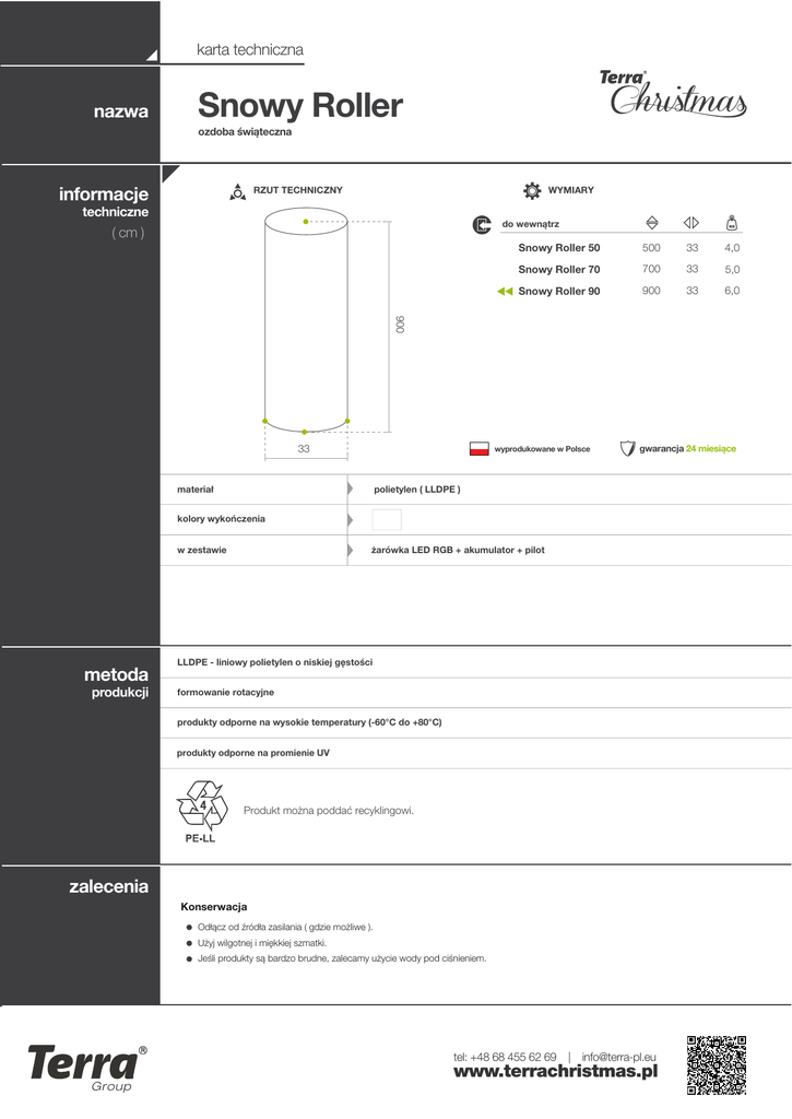karta techniczna nazwa Snowy Roller ozdoba świąteczna informacje RZUT TECHNICZNY WYMIARY techniczne do wewnątrz ( cm ) Snowy Roller 50 500 33 4,0 Snowy Roller 70 700 33 5,0 Snowy Roller 90 900 33 6,0 900 33 wyprodukowane w Polsce materiał gwarancja 24 miesiące polietylen ( LLDPE ) kolory wykończenia w zestawie metoda produkcji żarówka LED RGB + akumulator + pilot LLDPE - liniowy polietylen o niskiej gęstości formowanie rotacyjne produkty odporne na wysokie temperatury (-60°C do +80°C) produkty odporne na promienie UV Produkt można poddać recyklingowi. zalecenia Konserwacja Odłącz od źródła zasilania ( gdzie możliwe ). Użyj wilgotnej i miękkiej szmatki. Jeśli produkty są bardzo brudne, zalecamy użycie wody pod ciśnieniem. tel: +48 68 455 62 69 | [email protected] Group www.terrachristmas.pl