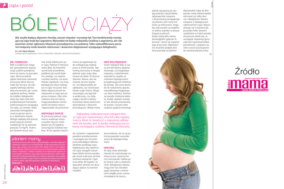 REKLAMA ciąża i poród Bóle w ciąży Ból, zwykle będący objawem choroby, zawsze niepokoi i wywołuje lęk. Tym bardziej kiedy rozwijająca się ciąża może być zagrożona. Wprawdzie nie każdy rodzaj bólu świadczy o zagrożeniu, ale i tak powinien zostać zgłoszony lekarzowi prowadzącemu czy położnej. Tylko wykwalifikowany personel medyczny może bowiem różnicować i skutecznie diagnozować występujące dolegliwości. Dr n. med. Tadeusz Oleszczuk Ginekolog położnik współpracujący z Centrum Zdrowia Kobiet w Warszawie, www.centrumzdrowiakobiet.pl mię, kiedy kobieta jest już w ciąży. Podczas 9 miesięcy watro dbać, by kontrolne wyniki były prawidłowe, podobnie jak wynik badania cytologii, czy stopnia czystości pochwy. Leczenie stanów zapalnych, czy innej patologii jest dużo trudniejsze w ciąży niż przed. Ilość leków dopuszczonych do stosowania w ciąży jest po prostu mniejsza. Zbyt silne i bolesne skurcze macicy mogą powodować zmniejszenie ukrwienia macicy i doprowadzić do poronienia. macicy przygotowuje się do czekającej go ciężkiej pracy w chwili porodu. Taki trening skurczowy w drugiej połowie ciąży może obejmować do około 10 skurczy dziennie. Ważne, aby nie stawały się one regularne i nie doprowadziły do zgładzania, czy rozwierania kanału szyjki macicy. Długo utrzymujący się tępy ból w podbrzuszu, czy dołączający się ból w okolicy krzyżowej należy koniecznie skonsultować z lekarzem prowadzącym. Wtedy mamy Niepokojące skurcze W pierwszej połowie ciąży macica wykonuje niewyczuwalne skurcze, które dopiero po 20 tygodniu zaczynają być bardziej nasilone. W ten sposób mięsień Najbardziej niebezpiecznym rodzajem bólu w ciąży jest nieprzerwany, silny ból całej napiętej macicy. Może to świadczyć o zagrożeniu odklejeniem się łożyska. Jest to bardzo niebezpieczna sytuacja wymagająca szybkiej interwencji lekarskiej. zdaniem mamy dobra–mama.pl Generalnie pierwsza jak i druga ciąża przebiegła u mnie bez większych problemów. Jedynie co mi przeszkadzało, to tak mniej więcej od 6 miesiąca ciąży, okropne skurcze łydek, które łapały mnie w nocy. Wyłam wtedy jak kojot. Jak dla mnie było to gorsze niż bóle porodowe. Łykałam żelazo z magnezem i miałam wrażenie, że w nieznacznym stopniu mi to pomagało. Pod koniec ciąży ciężar brzuszka dał znać o sobie, kręgosłup bolał i wtedy zdecydowałam się na basen. Zapisałam się na zajęcia w wodzie dla kobiet w ciąży. Polecam wszystkim przyszłym mamusiom! Cudowny relaks, ulga dla kręgosłupa i poród jest o wiele lżejszy. Katarzyna C. 24 do czynienia z zagrożeniem porodem przedwczesnym i wymagane jest leczenie przeciwdziałające takiemu obrotowi przebiegu ciąży. Najlepiej jest aby zakończenie ciąży nastąpiło stosunkowo blisko terminu porodu, jaki został wyliczony od dnia ostatniej miesiączki. Ciąża trwa około 40 tygodni i to dojrzałość dziecka ma decydujący wpływ na moment narodzin. doprowadzić ciążę do dnia porodu, kiedy kobieta będzie odczuwać już tylko skurcze i dolegliwości bólowe związane z fizjologicznym zakończeniem ciąży. Natura okazuje się tu łaskawa dla przyszłej matki, bowiem wydzielana w trakcie porodu oksytocyna działa tak, że występuje niepamięć (przynajmniej częściowa) bólów porodowych, a pojawia się silne uczucie przywiązania do nowonarodzonej istoty. Kiedy boli kręgosłup Innym rodzajem bólu w ciąży jest ból okolicy spojenia łonowego, czy kręgosłupa związany z rozluźnieniem więzadeł w związku ze zmianami fizjologicznymi przygotowującymi miednicę do porodu. Tak samo dochodzi do rozluźnienia aparatu więzadłowego kręgosłupa, czy kości miednicy. Zmienia się sposób chodzenia kobiety, środek ciężkości zostaje w tym okresie przeniesiony do przodu. Czasami takie rozejście spojenia łonowego bywa bolesne, ale na szczęście po porodzie wszystko wraca do fizjologicznego stanu. Inne bóle W ciąży może dochodzić również do częściowego uciśnięcia przez ciężarną macicę moczowodu i bólów po tej stronie ciała w okolicach nerki. Dolegliwości bólowe mogą mieć też charakter zgagi związanej z uniesieniem żołądka przez wzrost rozwijającej się macicy. Źródło magazyn inspirowany dzieckiem www.dobra-mama.pl WWW.RACHWALSKA.COM Ból podbrzusza Bóle w podbrzuszu mogą być spowodowane (najczęściej) szybkim powiększaniem się macicy na początku ciąży. Warto je jednak zgłosić lekarzowi, ponieważ przyczyną takich skurczy może być toczący się stan zapalny dolnego odcinka dróg moczowych, jak i samo zapalenie pochwy. Niekiedy źródłem dolegliwości może być zbyt mała ilość produkowanych hormonów podtrzymujących rozwijającą się ciążę, czy anemia. Niska zawartość hemoglobiny stwarza gorsze warunki w dotlenianiu tkanek, dlatego najlepiej jeśli jeszcze przed ciążą jej wartość ustabilizuje się na poziomie powyżej 13 mg/%. Trudno jest bowiem leczyć ane- Jednak najczęściej (w drugiej połowie ciąży) kobiety zgłaszają bóle związane z aktywnością rozwijającego się dziecka. Jeśli ruchy malucha są intensywne, mogą być odczuwalne szczególnie w okolicy wątroby w pozycji leżącej na plecach. Każdy rodzaj bólu należy bezwzględnie zgłaszać lekarzowi i starać się wyjaśnić jego przyczynę. Odpowiednio wcześnie podjęte działania pozwolą szczęśliwie