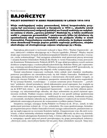KOMENTARZE HISTORYCZNE PIOTR CICHORACKI BAJOŃCZYCY POLSCY OCHOTNICY W ARMII FRANCUSKIEJ W LATACH 1914–1915 Wizja nadciągającej wojny powszechnej, której bezpośrednią przyczyną był czerwcowy zamach w Sarajewie w 1914 r., obudziła wśród kilkunastotysięcznej emigracji polskiej we Francji nadzieję na radykalne zmiany w stanie „sprawy polskiej”. Nadzieja ta, a także możliwość walki z „naporem germańskim”, zmotywowały kilku jej działaczy do spontanicznej akcji wzywania Polaków do podjęcia służby w armii francuskiej. Pomysłodawcy wychodzili z założenia, że będąca uosobieniem demokracji Francja poprze polskie aspiracje polityczne, niejako abstrahując od strategicznego sojuszu wiążącego ją z Rosją. Największą aktywność w tej kwestii wykazał w lipcu 1914 r. Wacław Gąsiorowski – pisarz, założyciel i redaktor ukazującego się w Paryżu tygodnika „Polonia”. Między innymi dzięki jego staraniom Związek Zachodnioeuropejskich Sokołów powziął uchwałę o wszczęciu „ruchu wolontarskiego”. Nad zaciągiem ochotników miał sprawować pieczę utworzony 1 sierpnia Komitet Ochotników Polskich dla Służby w Armii Francuskiej zwany powszechnie Komitetem Wolontariuszów Polskich (KWP). W jego skład początkowo weszli zarówno działacze sympatyzujący z ruchem piłsudczykowskim (np. Bolesław Motz), jak i reprezentujący orientację narodową (Gąsiorowski). Późniejsze przekształcenia KWP spowodowały, że w jego działalności dominującą rolę odegrały osoby sympatyzujące z endecją. Niemal natychmiast rozpoczęto werbunek, który jednak miał charakter nieoficjalny, ponieważ początkowo nie ustosunkowywały się doń władze francuskie. Dodatkowo niesprzyjającą okolicznością była ich decyzja o internowaniu obywateli państw wrogich, co dotyczyło również Polaków – posiadaczy paszportów niemieckich lub austro-węgierskich. W tej sytuacji Komitet, wystawiający – z czasem uznawane przez Francuzów – „certyfikaty” polskości, chronił posiadaczy takich dokumentów przed represjami, bez względu na obywatelstwo osób nimi się posługujących. Spowodowało to, że motywacje zgłaszających się do KWP były różne i – jak wspominał Gąsiorowski – często nie były efektem patriotycznego, czy antyniemieckiego odruchu, ale chęci uchronienia się przed ciężarem ograniczenia swobody. Poddani rosyjscy niekiedy chcieli w ten sposób uniknąć spodziewanej – choć ostatecznie nieprzeprowadzonej – mobilizacji do armii carskiej. Ambasada rosyjska, co zrozumiałe, niechętnie odnosiła się do polskich inicjatyw wojskowych na terenie Francji, jakkolwiek zmierzających przecież do wzmocnienia wysiłków państw Ententy. Inicjatorzy zaciągu, szacujący liczbę Polaków we Francji na ok. 20 tys., uznali, że taka społeczność powinna wyłonić ok. 1.5 tys. ochotników. Do czasu spodziewanego, formalnego uregulowania przez władze francuskie kwestii zaciągu cudzoziemców, postanowiono zająć się napływającymi na wezwanie Komitetu ludźmi. Zorganizowano więc dla nich wyżywienie, a także namiastkę szkolenia wojskowego. Zbiórki odbywały się dwa razy dziennie. Po kilku dniach udostępniono Komitetowi halę, w której odbywały się zajęcia. Gąsiorowski w następujący sposób opisywał powoli powiększającą się grupę potencjalnych żołnierzy: „Dziwnym zaiste, niezwykłym bardzo był ten pstry tłum ochotników naszych. Tutaj inży- 24 1 W. Gąsiorowski, 1910–1915. Historia Armii Polskiej we Francji, Warszawa 1931, s. 145. W. Lipiński, Bajończycy i Armia Polska we Francji, Warszawa 1929, s. 5. 3 W. Gąsiorowski, op., cit., s. 173. 4 Ibidem, s. 241. 2 25 KOMENTARZE HISTORYCZNE nier, który wyjechał do Francji organizować towarzystwo akcyjne do eksploatacji źródeł naftowych, tutaj artysta, tam literat początkujący, a tu rzemieślnik, robociarz szczery, tutaj do paranteli z magnatami przyznający się jegomość, ówdzie »chodzik« paryski i student uniwersytetu i kupczyk, skromny parobek rolny i urodzony burżuj. […] Jedna cecha łączyła wszystkich tych ochotników. Na imię jej była wielka bieda. Ubóstwo raptowne. Wykolejenie. Stracenia gruntu pod nogami”1. Zróżnicowanie dotyczyło także poglądów politycznych ochotników. Zapewne – biorąc pod uwagę proweniencję najważniejszych postaci KWP – przeważali zwolennicy ruchu narodowego, ale byli także członkowie Związku Strzeleckiego. W okresie międzywojennym wyjaśniano to jako efekt „pogłoski, iż Związek Strzelecki wydał dyspozycje wstępowania do wojska francuskiego, skoro nie można się przedrzeć do Legionów Józefa Piłsudskiego”2. W KWP liczono na to, że Francuzi zajmą się sprawą ochotników po zakończeniu swojej mobilizacji. Wyraźny zwrot w podejściu opinii francuskiej do sprawy polskiej nastąpił po ogłoszeniu w sierpnia 1914 r. przez naczelnego wodza armii rosyjskiej – wielkiego księcia Mikołaja – odezwy do Polaków. Spotkała się ona z entuzjastycznym poparciem na łamach prasy, przypominając tym samym o sprawie polskiej. Sytuacja ochotników formalnie zmieniła się 21 sierpnia, kiedy oficjalnie zezwolono cudzoziemcom na wstępowanie do formacji Legii Cudzoziemskiej armii francuskiej. Do tego czasu na apel Komitetu zgłosiło się około pięciuset ochotników. Dzień później zostali oni poddani badaniom lekarskim. Do służby zakwalifikowano około stu osiemdziesięciu ludzi. Gąsiorowski tak wspominał wyjście tej grupy z Pałacu Inwalidów, gdzie przeprowadzono selekcję medyczną: „[…] wymarsz […] tego pierwszego oddziału polskich ochotników był imponujący. Na czele szedł Szujski [syn wybitnego przedstawiciela krakowskiej szkoły historycznej Józefa Szujskiego – P.C.] ze sztandarem polskim, który sobie zaimprowizował. Publiczność na ulicach zdejmowała nakrycia głowy, warty salutowały bohaterskich straceńców, za jakich uważano ich wówczas”3. Wyj