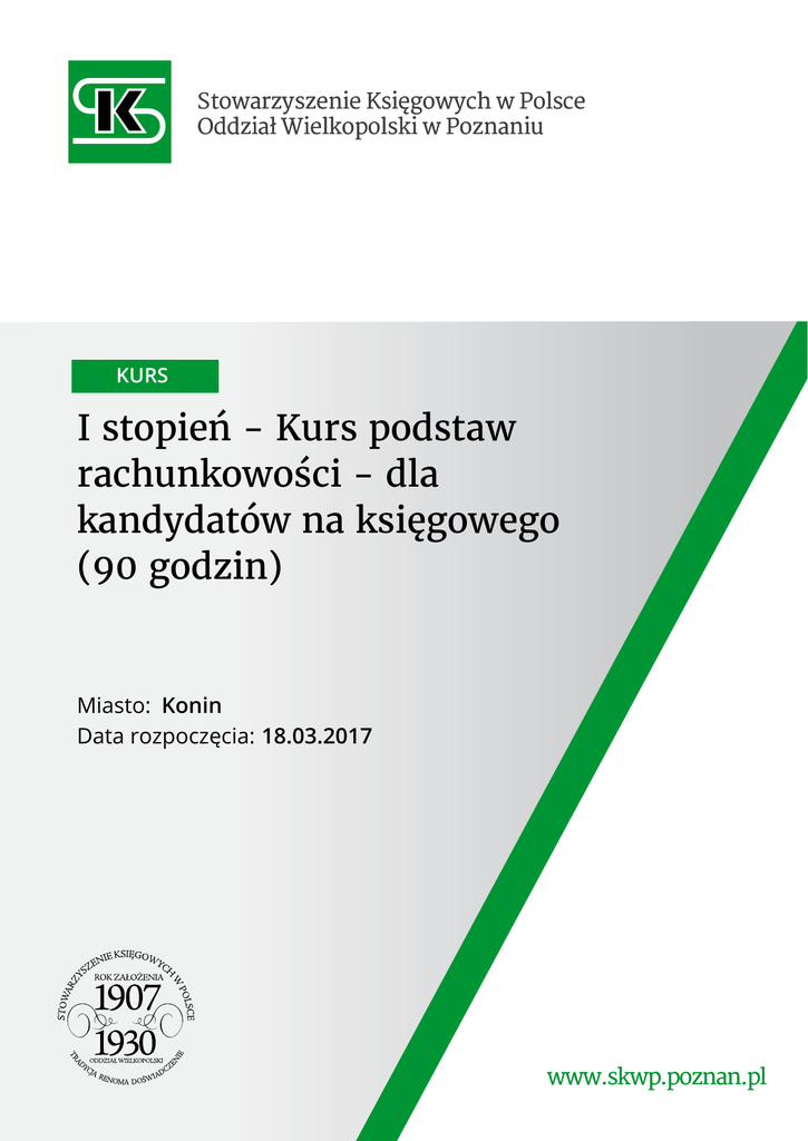 Stowarzyszenie Księgowych w Polsce Oddział Wielkopolski w Poznaniu KURS I stopień - Kurs podstaw rachunkowości - dla kandydatów na księgowego (90 godzin) Miasto: Konin Data rozpoczęcia: 18.03.2017 www.skwp.poznan.pl Stowarzyszenie Księgowych w Polsce Oddział Wielkopolski w Poznaniu Zapytaj o szkolenie tel. 61 863 04 80 fax. 61 863 04 96 [email protected] Pracujemy w godz. 8.00 - 16.00 Nie znalazłeś oferty dla siebie? poinformuj nas jakiego szkolenia szukasz: I stopień - Kurs podstaw rachunkowości - dla kandydatów na księgowego (90 godzin) [email protected] CEL: Celem kształcenia jest przygotowanie kandydata do pracy w zawodzie księgowego, który został ujęty w klasyfikacji zawodów i specjalności wprowadzonej rozporządzeniem Ministra Pracy i Polityki Społecznej z dnia 7 sierpnia 2014 roku Dz. U. poz. 1145. (kod zawodu 331301) oraz uzyskanie certyfikatu I stopnia w czterostopniowym procesie certyfikacji zawodu księgowego prowadzonym przez Stowarzyszenie Księgowych w Polsce. Słuchaczami Kursu podstaw rachunkowości - dla kandydatów na księgowego mogą być osoby posiadające co najmniej wykształcenie średnie. PROGRAM: I. Podstawy rachunkowości finansowej z elementami etyki zawodowej (72 godz. zajęć dydaktycznych). - Organizacja działalności gospodarczej - wiadomości wstępne. - Pojęcia wstępne z rachunkowości. - Charakterystyka aktywów i pasywów. - Operacje gospodarcze. - Dowody księgowe. - Księgi rachunkowe. - Ewidencja podstawowych operacji bilansowych. - Ewidencja podstawowych operacji wynikowych. - Zasady ustalania wyniku finansowego. - Uproszczone sprawozdanie finansowe. - Zadanie kompleksowe (od bilansu otwarcia do bilansu zamknięcia i rachunku zysków i strat). - Podstawy etyki w działalności gospodarczej i zawodowej. - Wykorzystanie programów komputerowych w prowadzeniu ksiąg rachunkowych. II. Wybrane zagadnienia publicznoprawne (18 godz. zajęć dydaktycznych). - System podatkowy w Polsce i Ordynacja podatkowa. - VAT - ogólne zasady podatku. - Podatki dochodowe - formy opodatkowania działalności gospodarczej. - Ewidencja podatkowa i zasady prowadzenia ksiąg podatkowych. Stowarzyszenie Księgowych w Polsce Oddział Wielkopolski w Poznaniu ul. Ziębicka 18 60-164 Poznań tel. 61 8630-480 fax. 61 8630 496 [email protected] [email protected] Nr konta PKO BP SA I O/M 42 1020 4027 0000 1102 0031 0219 www.skwp.poznan.pl 2/3 Stowarzyszenie Księgowych w Polsce Oddział Wielkopolski w Poznaniu Zapytaj o szkolenie tel. 61 863 04 80 fax. 61 863 04 96 [email protected] Pracujemy w godz. 8.00 - 16.00 Nie znalazłeś oferty dla siebie? poinformuj nas jakiego szkolenia szukasz: [email protected] - Ogólne zasady naliczania podatków i opłat obciążających przedsiębiorstwa. - Podstawy rozliczeń z Zakładem Ubezpieczeń Społecznych. ORGANIZACJA: Kurs jest organizowany w dwóch trybach - do wyboru przez uczestnika: - zajęcia w soboty i niedziele, co 2 tygodnie, w godz. od 8.00 do 13.00 (przez 3 i pół miesiąca) lub - zajęcia dwa dni w tygodniu /poniedziałek i środa lub wtorek i czwartek/ w godz. od 16.30 do 19.45 (przez 3 miesiące). DODATKOWE INFORMACJE: Uczestnicy otrzymują: - materiały szkoleniowe, - gorące napoje - kawa, herbata, itp. Formą zaliczenia kursu jest obecność na przynajmniej 60% godzin lekcyjnych, zaliczenie prac kontrolnych i pozytywny wynik z egzaminu pisemnego. Osoba, która na egzaminie uzyskała co najmniej 30% punktów możliwych do osiągnięcia otrzymuje zaświadczenie o ukończeniu kursu zgodne ze wzorem zamieszczonym w załączniku nr 5 do Rozporządzenia MEN z dnia 11 stycznia 2012 r. w sprawie kształcenia ustawicznego w formach pozaszkolnych. Osoba, która na egzaminie uzyskała co najmniej 60% punktów możliwych do osiągnięcia z całego egzaminu i nie mniej niż 40% z każdego modułu tematycznego oraz spełnia warunki określone w Załączniku nr 1 do Uchwały nr 732/111/2009 Zarządu Głównego SKwP z dnia 20 lipca 2009 r. otrzymuje dodatkowo certyfikat księgowego - potwierdzenie kwalifikacji zawodowych w obrębie zawodu księgowego (331301). W trakcie kursu lub po zakończeniu istnieje możliwość wzięcia udziału w dodatkowym kursie komputerowym, prowadzonym w formie warsztatów, zapoznającym słuchaczy z prowadzeniem ewidencji księgowej przy pomocy komputera - więcej >> Kurs jest objęty akredytacją Wielkopolskiego Kuratora Oświaty (Decyzja nr 110.2.987.2014 z dnia 03.12.2014r.) Stowarzyszenie Księgowych w Polsce Oddział Wielkopolski w Poznaniu ul. Ziębicka 18 60-164 Poznań tel. 61 8630-480 fax. 61 8630 496 [email protected] [email protected] Nr konta PKO BP SA I O/M 42 1020 4027 0000 1102 0031 0219 www.skwp.poznan.pl 3/3