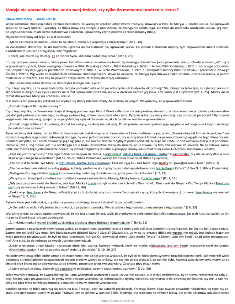 Maryja nie uprawiała seksu aż do swej śmierci, czy tylko do momentu urodzenia Jezusa? Dziewictwo Maryi — matki Jezusa Wiele odłamów chrześcijaństwa zarzuca katolikom, że wierzą w przekaz ustny zwany Tradycją, mówiący o tym, że Maryja — matka Jezusa nie uprawiała seksu aż do swej śmierci. Twierdzą, że Biblia mówi coś innego, a mianowicie, że Maryja nie robiła tego, ale tylko do momentu urodzenia Jezusa. Wg nich, po Jego urodzeniu, miała liczne potomstwo z Józefem. Sprawdźmy czy to prawda i przeanalizujmy Biblię. Najpierw zacznijmy od tego, że jest napisane: „Maria zaś rzekła do anioła: „Jakże to się stanie, skoro nie współżyję z mężczyzną?” [Łk 1, 34] co ewidentnie stwierdza, że do momentu ujrzenia anioła Gabriela nie uprawiała seksu. Co jednak z okresem między tym objawieniem anioła Gabriela, a urodzeniem Jezusa? To wyjaśnia inny fragment: [Józef] „nie zbliżał się do Niej, aż porodziła Syna, któremu nadał imię Jezus.” [Mt 1, 25] I tu się zaczyna pewien niuans, który prawi katolikom wiele zarzutów na temat Jej dalszego dziewictwa (nie uprawiania seksu). Chodzi o słowo „aż” użyte w powyższym cytacie, które występuje również w Biblii Brzeskiej z 1563 r., Biblii Gdańskiej z 1632 r. i Nowej Biblii Gdańskiej z 2011 r. lub o jego odpowiednik „dopóki” występujący w przekładzie dosłownym z 2002 r., w Biblii Warszawskiej z 1975 r., Uwspółcześnionej Biblii Gdańskiej i przekładzie Nowego Świata z 1997 r. Wg wielu pozakatolickich odłamów chrześcijańskich, słowo to oznacza, że Maryja była dziewicą tylko do dnia urodzenia Jezusa, a potem miała dzieci z Józefem. Czy oby na pewno? Przypuśćmy, że mówię do mojej koleżanki: „Nie uprawiałaś seksu dopóki nie skończyłaś 8-mego roku życia.” Czy z tego wynika, że ta moja koleżanka zaczęła uprawiać seks w 9-tym roku życia lub kiedykolwiek później? Nie. Oznajmia tylko tyle, że żyła bez seksu do skończenia 8-mego roku życia i milczy na temat uprawiania przez nią seksu w dalszym okresie jej życia. Tak samo jest z cytatem [Mt 1, 25]. Milczy on na temat dziewictwa Maryi po urodzeniu Jezusa. Jeśli komuś ten powyższy przykład nie wydaje się dobry lub zrozumiały, to posłużę się innym. Przypuśćmy, że wypowiadam zdanie: „Tomek obejrzał film aż do połowy.” Czy z tego wynika, że Tomek nie obejrzał drugiej połowy tego filmu? Wiele odłamów chrześcijaństwa stwierdzi, że taka konstrukcja zdania z użyciem słów „aż do” jest potwierdzeniem tego, że druga połowa tego filmu nie została obejrzana. Pytanie tylko, czy mają oni rację, czy może coś przeoczyli? By rozwiać wątpliwości kto ma rację, spójrzmy na przykładowy opis okoliczności w jakich to zdanie zostało wypowiedziane: „Tomek obejrzał film aż do połowy, bo był tak nużący, że dalej nie dał rady. Dzień później wznowił jednak jego oglądanie od miejsca w którym skończył, bo zależało mu na tym.” Teraz widzimy dokładnie, że ten film do końca jednak został obejrzany. Samo zdanie które mieliśmy na początku: „Tomek obejrzał film aż do połowy.” nie dostarcza wystarczająco dużo informacji do tego, by móc jednoznacznie ocenić, czy w przyszłości Tomek na pewno dokończył oglądanie tego filmu czy nie. Podałem przykład, że Tomek dokończył jego oglądanie, ale równie dobrze mógłbym podać przykład, że tego nie zrobił. Z dziewictwem Maryi jest podobnie. Użycie w [Mt 1, 25] słowa „aż” nie rozstrzyga ani o braku dziewictwa Maryi do śmierci, ani o trwaniu w tym dziewictwie do śmierci. Na podstawie samej Biblii, nie można tego jednoznacznie ocenić. Są jednak fragmenty w Biblii sugerujące jakoby Jezus miał tu na Ziemi 4-ch braci i minimum 2 siostry: „Czyż nie jest to syn cieśli? Czy jego matka nie nazywa się Maria, a jego bracia: Jakub i Józef, i Szymon, i Judas? A jego siostry, czy nie są wszystkie u nas? Skąd więc u niego to wszystko?” [Mt 13, 55-56; Biblia Poznańska, wersja katolicka nowsza niż Biblia Tysiąclecia] „Czy nie jest to cieśla, syn Maryi, a brat Jakuba, Józefa, Judy i Szymona? Czyż nie żyją tu u nas także Jego siostry?» I powątpiewali o Nim.” [Mk 6, 3] „Czy nie wolno nam zabrać ze sobą siostry, kobiety, podobnie jak czynią to pozostali apostołowie oraz bracia Pana i Kefas?” [1 Kor 9, 5; Biblia Poznańska] „Następnie On, Jego Matka, bracia i uczniowie Jego udali się do Kafarnaum, gdzie pozostali kilka dni.” [J 2, 12] „Wszyscy oni trwali jednomyślnie na modlitwie razem z niewiastami, Maryją, Matką Jezusa, i braćmi Jego.” [Dz 1, 14] „Gdy jeszcze przemawiał do tłumów, oto Jego Matka i bracia stanęli na dworze i chcieli z Nim mówić. Ktoś rzekł do Niego: «Oto Twoja Matka i Twoi bracia stoją na dworze i chcą mówić z Tobą»” [Mt 12, 46] „Rzekli więc Jego bracia do Niego: «Wyjdź stąd i idź do Judei, aby i uczniowie Twoi ujrzeli czyny, których dokonujesz. (…) nawet Jego bracia nie wierzyli w Niego.” [J 7, 3-5] Pytanie teraz jest tylko takie, czy oby na pewno to byli jego bracia i siostry? Jezus mówił bowiem: „A On rzekł do nich: «Wy jesteście z niskości, a Ja jestem z wysoka. Wy jesteście z tego świata, Ja nie jestem z tego świata.” [J 8, 23] Wyraźnie widać, że Jezus wprost powiedział, że nie jest z tego świata, czyli, że przebywa w ciele człowieka tylko tymczasowo. Do tych ludzi co sądzili, że On ma tu na Ziemi braci i siostry powiedział: „(…) «Moją matką i moimi braćmi są ci, którzy słuchają słowa Bożego i wypełniają je».” [Łk 8, 21] Zatem wprost z powyższych słów Jezusa widać, że wspominani wcześniej bracia i siostry nie byli Jego ziemskim rodzeństwem, bo On nie był z tego świata. Zatem kim oni byli? Czy mogli być biologicznymi dziećmi Maryi i Józefa? Okazuje się, że w na to pytanie Biblia nic wprost nie mówi. Jest jednak fragment który pozwala przyp