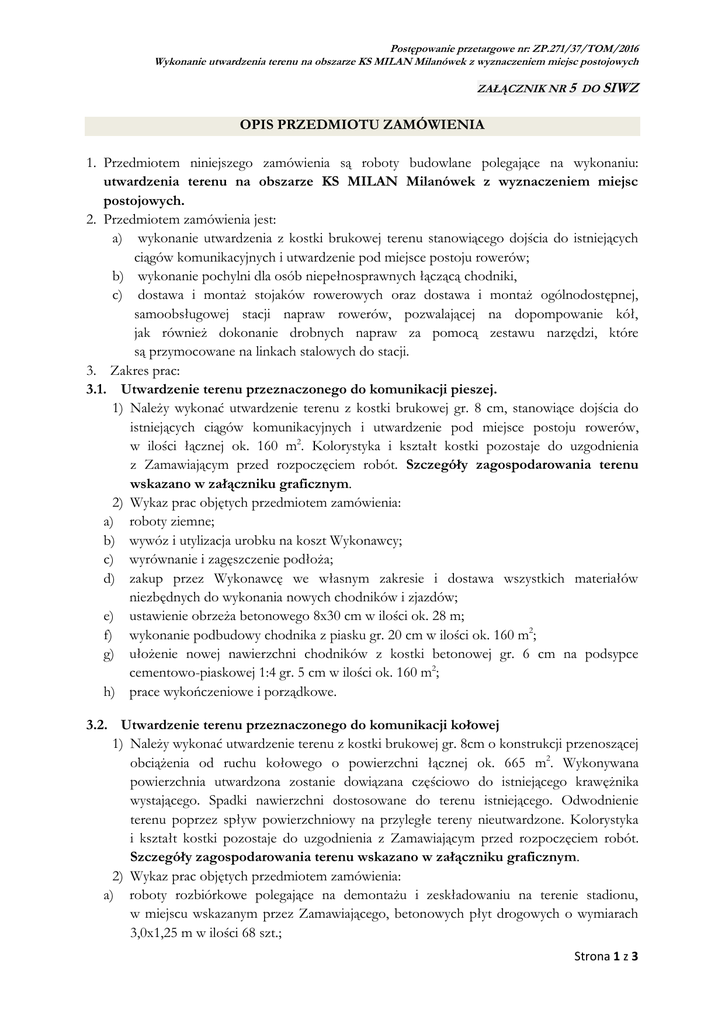 Postępowanie przetargowe nr: ZP.271/37/TOM/2016 Wykonanie utwardzenia terenu na obszarze KS MILAN Milanówek z wyznaczeniem miejsc postojowych ZAŁĄCZNIK NR 5 DO SIWZ OPIS PRZEDMIOTU ZAMÓWIENIA 1. Przedmiotem niniejszego zamówienia są roboty budowlane polegające na wykonaniu: utwardzenia terenu na obszarze KS MILAN Milanówek z wyznaczeniem miejsc postojowych. 2. Przedmiotem zamówienia jest: a) wykonanie utwardzenia z kostki brukowej terenu stanowiącego dojścia do istniejących ciągów komunikacyjnych i utwardzenie pod miejsce postoju rowerów; b) wykonanie pochylni dla osób niepełnosprawnych łączącą chodniki, c) dostawa i montaż stojaków rowerowych oraz dostawa i montaż ogólnodostępnej, samoobsługowej stacji napraw rowerów, pozwalającej na dopompowanie kół, jak również dokonanie drobnych napraw za pomocą zestawu narzędzi, które są przymocowane na linkach stalowych do stacji. 3. Zakres prac: 3.1. Utwardzenie terenu przeznaczonego do komunikacji pieszej. 1) Należy wykonać utwardzenie terenu z kostki brukowej gr. 8 cm, stanowiące dojścia do istniejących ciągów komunikacyjnych i utwardzenie pod miejsce postoju rowerów, w ilości łącznej ok. 160 m2. Kolorystyka i kształt kostki pozostaje do uzgodnienia z Zamawiającym przed rozpoczęciem robót. Szczegóły zagospodarowania terenu wskazano w załączniku graficznym. 2) Wykaz prac objętych przedmiotem zamówienia: a) roboty ziemne; b) wywóz i utylizacja urobku na koszt Wykonawcy; c) wyrównanie i zagęszczenie podłoża; d) zakup przez Wykonawcę we własnym zakresie i dostawa wszystkich materiałów niezbędnych do wykonania nowych chodników i zjazdów; e) ustawienie obrzeża betonowego 8x30 cm w ilości ok. 28 m; f) wykonanie podbudowy chodnika z piasku gr. 20 cm w ilości ok. 160 m2; g) ułożenie nowej nawierzchni chodników z kostki betonowej gr. 6 cm na podsypce cementowo-piaskowej 1:4 gr. 5 cm w ilości ok. 160 m2; h) prace wykończeniowe i porządkowe. 3.2. Utwardzenie terenu przeznaczonego do komunikacji kołowej 1) Należy wykonać utwardzenie terenu z kostki brukowej gr. 8cm o konstrukcji przenoszącej obciążenia od ruchu kołowego o powierzchni łącznej ok. 665 m2. Wykonywana powierzchnia utwardzona zostanie dowiązana częściowo do istniejącego krawężnika wystającego. Spadki nawierzchni dostosowane do terenu istniejącego. Odwodnienie terenu poprzez spływ powierzchniowy na przyległe tereny nieutwardzone. Kolorystyka i kształt kostki pozostaje do uzgodnienia z Zamawiającym przed rozpoczęciem robót. Szczegóły zagospodarowania terenu wskazano w załączniku graficznym. 2) Wykaz prac objętych przedmiotem zamówienia: a) roboty rozbiórkowe polegające na demontażu i zeskładowaniu na terenie stadionu, w miejscu wskazanym przez Zamawiającego, betonowych płyt drogowych o wymiarach 3,0x1,25 m w ilości 68 szt.; Strona 1 z 3 Postępowanie przetargowe nr: ZP.271/37/TOM/2016 Wykonanie utwardzenia terenu na obszarze KS MILAN Milanówek z wyznaczeniem miejsc postojowych b) c) d) e) roboty ziemne; wywóz i utylizacja urobku na koszt Wykonawcy; wyrównanie i zagęszczenie podłoża; zakup przez Wykonawcę we własnym zakresie i dostawa wszystkich materiałów niezbędnych do wykonania nowych chodników i zjazdów; f) ustawienie krawężnika betonowego 15x30 cm wystającego i wtopionego na ławie betonowej z betonu C12/15 gr. min. 10 cm z oporem szer. min. 15 cm w ilości ok. 76 m; g) wykonanie warstwy odsączającej z piasku gr. 10 cm w ilości ok. 665 m2; h) wykonanie podbudowy z kruszywa łamanego 0/31,5 gr. 20 cm po zagęszczeniu, w ilości ok. 665 m2; i) wykonanie nawierzchni w kostki betonowej gr. 8 cm na podsypce cementowo-piaskowej 1:4 gr. 5 cm w ilości ok. 665 m2; j) prace wykończeniowe i porządkowe. 3.3. 1) 2) a) b) c) d) e) f) g) h) i) j) k) 3.4. Wykonanie pochylni dla niepełnosprawnych Należy wykonać pochylnię dla osób niepełnosprawnych o nawierzchni z kostki brukowej, bezfazowej, o powierzchni ok. 20 m2, łączącą chodniki o różnicy poziomów ok. 1,10 m. Kolorystyka i kształt kostki pozostaje do uzgodnienia z Zamawiającym przed rozpoczęciem robót. Szczegóły zagospodarowania terenu wskazano w załączniku graficznym. Wykaz prac objętych przedmiotem zamówienia: demontaż 2 przęseł prefabrykowanego ogrodzenia betonowego; roboty ziemne (wykopy i nasypy); wywóz i utylizacja urobku na koszt Wykonawcy; wyrównanie i zagęszczenie podłoża; zakup przez Wykonawcę we własnym zakresie i dostawa wszystkich materiałów niezbędnych do wykonania nowych chodników i zjazdów; szerokość pochylni w świetle – 100 cm obustronne obramowanie krawężnikami betonowymi szer. 20 cm lub palisadami betonowymi z zachowaniem światła 12 cm; wykonanie pochylni w dwóch 9-metrowych odcinkach o pochyleniu podłużnym 6 % oddzielonymi spocznikiem długości 1,40 m; wykonanie obustronnej balustrady posiadającej podwójne poręcze na wys. 75 cm i 90 cm. Rozstaw poręczy 100 – 110 cm. Poręcze muszą zostać wydłużone o 30 cm na odcinku rozpoczynającym i kończącym pochylnię; wykonanie nawierzchni pochylni z kostki brukowej bezfazowej gr. 6 cm na podsypce cementowo-piaskowej 1:4 gr. 5 cm; wykonanie podbudowy chodnika z piasku gr. 20 cm; Dostawa i montaż elementów małej architektury 1) Dostawa i montaż stojaków rowerowych na typu U w rozmiarze 80x80 cm, w ilości 40 szt. Stojaki zabezpieczone antykorozyjną - ocynkowaną powłoką lub ze stali nierdzewnej. Sposób montażu poprzez przykręcenie do podłoża lub wbetonowanie. 2) Dostawa i montaż ogólnodostępnej, samoobsługowej stacji napraw rowerów, pozwalającej na dopompowanie kół, jak również dokonanie drobnych napraw za pomocą Strona 2 z 3 Postępowanie przetargowe nr: ZP.271/37/TOM/2016 Wykonanie utwardzenia terenu na obszarze KS MILAN Milanówek z wyznaczeniem miejsc postojowych zestawu narzędzi, które są przymocowane na linkach stalowych do stacji. Zestaw musi być odporny na działanie 