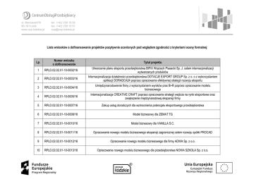 ul. Moniuszki7/9 90-101 Łódź www.cop.lodzkie.pl tel. /+42/ 230 15 50 fax /+42/ 230 15 51 [email protected] Lista wniosków o dofinansowanie projektów pozytywnie ocenionych pod względem zgodności z kryteriami oceny formalnej Lp. Numer wniosku o dofinansowanie Tytuł projektu Utworzenie planu eksportu przedsiębiorstwa BIFIX Wojciech Piasecki Sp. J. celem internacjonalizacji wytwarzanych produktów Internacjonalizacja działalności przedsiębiorstwa DOTACJE EXPORT GROUP Sp. z o. o z wykorzystaniem aplikacji DORADCA24 poprzez opracowanie efektywnej strategii rozwoju eksportu 1 RPLD.02.02.01-10-0002/16 2 RPLD.02.02.01-10-0003/16 3 RPLD.02.02.01-10-0004/16 Umiędzynarodowienie firmy z wykorzystaniem wyników prac B+R poprzez opracowanie modelu biznesowego 4 RPLD.02.02.01-10-0005/16 Internacjonalizacja CREATIVE CRAFT poprzez opracowanie strategii wejścia na rynki eksportowe oraz zwiększenie międzynarodowej ekspansji firmy 5 RPLD.02.02.01-10-0007/16 Zakup usług doradczych dla wzmocnienia potencjału eksportowego przedsiębiorstwa 6 RPLD.02.02.01-10-0008/16 Model biznesowy dla ZEMAT TG 7 RPLD.02.02.01-10-0010/16 Model biznesowy dla VANILLA S.C. 8 RPLD.02.02.01-10-0011/16 Opracowanie nowego modelu biznesowego ekspansji zagranicznej celem rozwoju spółki PROCAD 9 RPLD.02.02.01-10-0012/16 Opracowanie nowego modelu biznesowego dla firmy ADWA Sp. z o.o. 10 RPLD.02.02.01-10-0013/16 Opracowanie nowego modelu biznesowego dla przedsiębiorstwa NOWA SZKOŁA Sp. z o.o. 11 RPLD.02.02.01-10-0014/16 Opracowanie strategii eksportowej dla firmy KONRAD Sp. J. 12 RPLD.02.02.01-10-0015/16 Internacjonalizacja działalności przedsiębiorstwa poprzez opracowanie modelu biznesowego zmierzającego do internacjonalizacji działalności 13 RPLD.02.02.01-10-0016/16 Rozwój działań eksportowych przedsiębiorstwa ORION EXHAUST PARTS poprzez opracowanie kompleksowej strategii internacjonalizacji 14 RPLD.02.02.01-10-0017/16 Opracowanie nowego modelu biznesowego dla firmy GroMar, zmierzającego do jego internacjonalizacji 15 RPLD.02.02.01-10-0018/16 Internacjonalizacja firmy FIORE poprzez zakup nowego modelu biznesowego 16 RPLD.02.02.01-10-0019/16 Opracowanie nowego modelu biznesowego określającego rozszerzenie działalności o sprzedaż eksportową 17 RPLD.02.02.01-10-0020/16 Opracowanie planu rozwoju eksportu dla firmy AGRECOL w celu wejścia na nowe rynki zbytu 18 RPLD.02.02.01-10-0021/16 Opracowanie strategii podboju rynków zagranicznych instrumentem rozwoju firmy 19 RPLD.02.02.01-10-0023/16 Opracowanie strategii biznesowej firmy SULIMAR w kierunku rozpoczęcia eksportu prozdrowotnego napoju funkcjonalnego 20 RPLD.02.02.01-10-0024/16 Stworzenie nowego modelu biznesowego umiędzynarodowienia firmy MIKOMAX Sp. z o.o. Sp. k. 21 RPLD.02.02.01-10-0026/16 Nabycie usługi doradczej mającej na celu opracowanie nowego modelu biznesowego firmy dla rozpoczęcia jej działalności eksportowej 22 RPLD.02.02.01-10-0027/16 Rozwój spółki poprzez eksport – przygotowanie nowego modelu biznesowego 23 RPLD.02.02.01-10-0029/16 Opracowanie nowego modelu biznesowego firmy WZORCOWNIA Agnieszka Dębecka-Murzyniak 24 RPLD.02.02.01-10-0031/16 Opracowanie nowego modelu biznesowego internacjonalizacji przedsiębiorstwa SAGITTARIUS zmierzającego do wejścia na rynki Europy Zachodniej i Ameryki Północnej z narzędziem dla systemów nawigacji GPS Zielona Fala 25 RPLD.02.02.01-10-0032/16 Opracowanie planu ekspansji na rynki zagraniczne podstawą dalszego rozwoju formy HIGIENIX 26 RPLD.02.02.01-10-0033/16 Model biznesowy dla TW Consulting 27 RPLD.02.02.01-10-0034/16 Nowe horyzonty dla BUSINESS IN RUSSIA 28 RPLD.02.02.01-10-0035/16 Perspektywy rozwoju MARY GIBBUCCI 29 RPLD.02.02.01-10-0036/16 Opracowanie nowego modelu biznesowego wskazującego możliwości rozszerzenia działalności firmy LINGA na nowe, zagraniczne rynki zbytu 30 RPLD.02.02.01-10-0037/16 Opracowanie strategii rozwoju eksportu w celu internacjonalizacji firmy ARES Bracia Maciołek RPLD.02.02.01-10-0038/16 Poszerzenie i dywersyfikacja ekspansji zagranicznej przedsiębiorstwa PPHU FEMI poprzez opracowanie modelu biznesowego zmierzającego do internacjonalizacji działalności 32 RPLD.02.02.01-10-0039/16 Internacjonalizacja Master Pharm poprzez opracowanie strategii wejścia na rynki eksportowe oraz zwiększenie międzynarodowej ekspansji firmy 33 RPLD.02.02.01-10-0040/16 Opracowanie nowego modelu biznesowego wskazującego możliwości rozszerzenia działalności eksportowej na nowe zagraniczne rynki zbytu 34 RPLD.02.02.01-10-0041/16 Rozwój działalności eksportowej poprzez opracowanie nowego modelu biznesowego prowadzącego do internacjonalizacji przedsiębiorstwa 35 RPLD.02.02.01-10-0042/16 Opracowanie nowego modelu biznesowego w celu internacjonalizacji przedsiębiorstwa oraz rozpoczęcia działalności eksportowej 36 RPLD.02.02.01-10-0044/16 Opracowanie modelu biznesowego szansą na rozwój eksportu na nowe rynki zagraniczne 37 RPLD.02.02.01-10-0045/16 Opracowanie modelu biznesowego szansą na rozwój eksportu firmy KĘDZIOREK Joanna Kędziorek 38 RPLD.02.02.01-10-0047/16 Opracowanie nowego modelu biznesowego dla firmy Technologie Galwaniczne Sp. z o.o. 39 RPLD.02.02.01-10-0048/16 Opracowanie nowego modelu biznesowego dla przedsiębiorstwa GABRIELLA 31 40 RPLD.02.02.01-10-0049/16 Opracowanie nowego modelu biznesowego dla przedsiębiorstwa BASS BLEU 41 RPLD.02.02.01-10-0050/16 Opracowanie nowego modelu biznesowego dla przedsiębiorstwa ANMA Sp. z o.o. Sp. k. 42 RPLD.02.02.01-10-0051/16 Opracowanie strategii eksportowej firmy ARSA w celu internacjonalizacji przedsiębiorstwa 43 RPLD.02.02.01-10-0052/16 44 RPLD.02.02.01-10-0053/16 45 RPLD.02.02.01-10-0054/16 46 RPLD.02.02.01-10-0055/16 47 RPLD.02.02.01-10-0056/16 Rozpoczęcie ekspansji zagranicznej przez KAPELLA Sp. z o.o. poprzez zakup usługi doradczej 48 RPLD.02.02.01-10-0057/16 Opracowanie modelu biznesowego szansą na rozwój eksportu i poszerzenie portfela klientów dla firmy Zakład Pracy Chronionej TEXPOL 