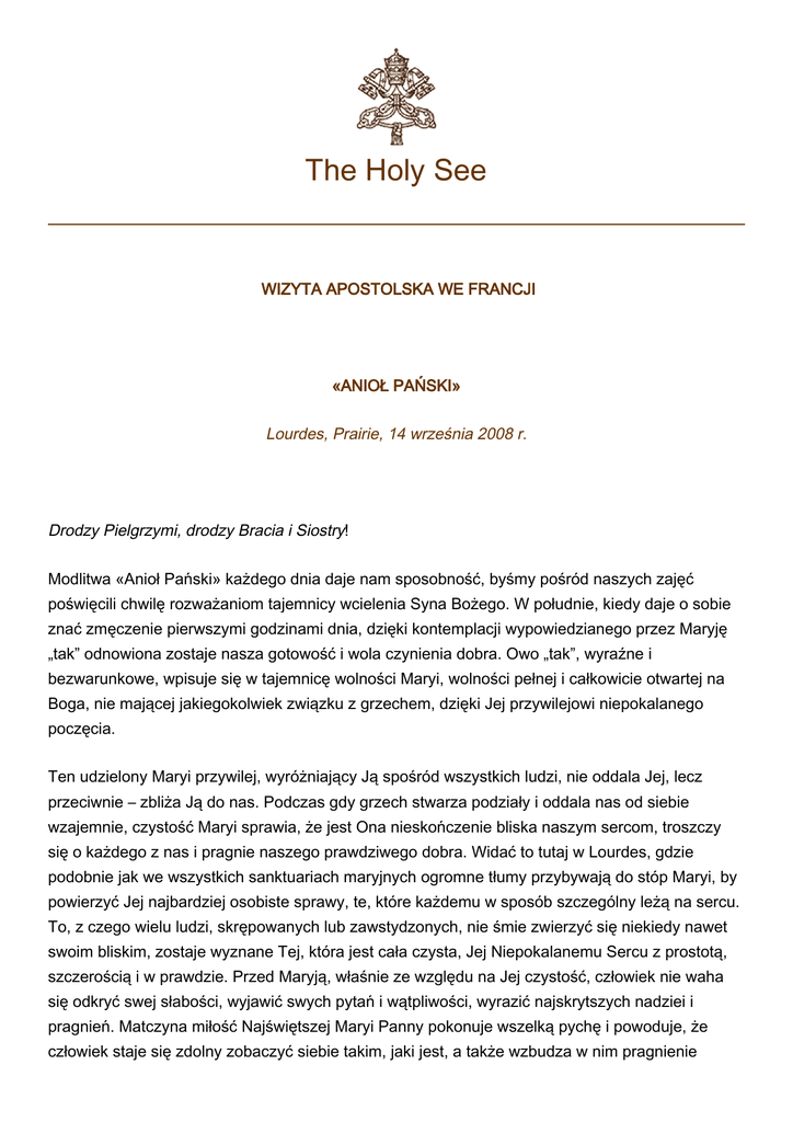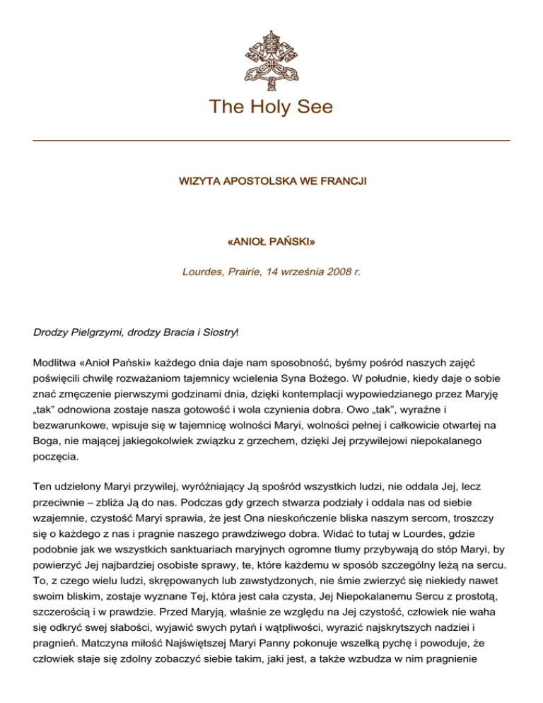 The Holy See WIZYTA APOSTOLSKA WE FRANCJI «ANIOŁ PAŃSKI» Lourdes, Prairie, 14 września 2008 r. Drodzy Pielgrzymi, drodzy Bracia i Siostry! Modlitwa «Anioł Pański» każdego dnia daje nam sposobność, byśmy pośród naszych zajęć poświęcili chwilę rozważaniom tajemnicy wcielenia Syna Bożego. W południe, kiedy daje o sobie znać zmęczenie pierwszymi godzinami dnia, dzięki kontemplacji wypowiedzianego przez Maryję „tak” odnowiona zostaje nasza gotowość i wola czynienia dobra. Owo „tak”, wyraźne i bezwarunkowe, wpisuje się w tajemnicę wolności Maryi, wolności pełnej i całkowicie otwartej na Boga, nie mającej jakiegokolwiek związku z grzechem, dzięki Jej przywilejowi niepokalanego poczęcia. Ten udzielony Maryi przywilej, wyróżniający Ją spośród wszystkich ludzi, nie oddala Jej, lecz przeciwnie – zbliża Ją do nas. Podczas gdy grzech stwarza podziały i oddala nas od siebie wzajemnie, czystość Maryi sprawia, że jest Ona nieskończenie bliska naszym sercom, troszczy się o każdego z nas i pragnie naszego prawdziwego dobra. Widać to tutaj w Lourdes, gdzie podobnie jak we wszystkich sanktuariach maryjnych ogromne tłumy przybywają do stóp Maryi, by powierzyć Jej najbardziej osobiste sprawy, te, które każdemu w sposób szczególny leżą na sercu. To, z czego wielu ludzi, skrępowanych lub zawstydzonych, nie śmie zwierzyć się niekiedy nawet swoim bliskim, zostaje wyznane Tej, która jest cała czysta, Jej Niepokalanemu Sercu z prostotą, szczerością i w prawdzie. Przed Maryją, właśnie ze względu na Jej czystość, człowiek nie waha się odkryć swej słabości, wyjawić swych pytań i wątpliwości, wyrazić najskrytszych nadziei i pragnień. Matczyna miłość Najświętszej Maryi Panny pokonuje wszelką pychę i powoduje, że człowiek staje się zdolny zobaczyć siebie takim, jaki jest, a także wzbudza w nim pragnienie 2 nawrócenia, by oddać chwałę Bogu. Maryja ukazuje nam zatem właściwy sposób zbliżania się do Boga. Uczy nas zbliżać się do Niego w prawdzie i z prostotą. Dzięki Niej odkrywamy, że wiara chrześcijańska nie jest ciężarem, lecz że jest niczym skrzydło, dzięki któremu możemy wznosić się wyżej, by schronić się w ramionach Boga. Życie i wiara ludzi wierzących pokazuje, że łaska niepokalanego poczęcia, której dostąpiła Maryja, nie jest tylko łaską osobistą, lecz że jest łaską dla wszystkich, daną całemu ludowi Bożemu. W Maryi Kościół może już kontemplować to, czym ma się stawać. Każdy wierzący może już teraz kontemplować doskonałe wypełnienie swojego osobistego powołania. Oby każdy z was trwał zawsze w postawie dziękczynienia Bogu za to, co ze swego zbawczego planu zechciał objawić przez tajemnicę Maryi. W tę tajemnicę jesteśmy włączeni w najpiękniejszy sposób, ponieważ z wysokości krzyża, który w dniu dzisiejszym czcimy i wielbimy, sam Jezus objawia nam, że Jego Matka jest naszą Matką. Jako synowie i córki Maryi korzystamy z wszystkich łask, którymi Ona została obdarzona, a niezrównana godność, jaką nadaje Maryi niepokalane poczęcie, opromienia nas, Jej dzieci. Tutaj, blisko groty, w poczuciu szczególnej jedności ze wszystkimi pielgrzymującymi do sanktuariów maryjnych oraz ze wszystkimi chorymi na duszy i na ciele, szukającymi pokrzepienia, błogosławimy Boga za obecność Maryi pośród Jego ludu i z wiarą zwracamy się do Niej w modlitwie: „Święta Maryjo, która 150 lat temu ukazałaś się tutaj małej Bernadetcie, ‘Jesteś nadziei żywiącym napojem’ (Dante, Raj, XXXIII, 12, przeł. Edward Porębowicz). Jako pielgrzymi z ufnością przychodzimy ze wszystkich stron świata, by raz jeszcze zaczerpnąć wiary, pokrzepić się i napełnić radością, miłością, nadzieją i pokojem u źródła Twego Niepokalanego Serca. ‘Monstra Te esse Matrem’. O Maryjo, okaż, że jesteś Matką dla wszystkich! I daj nam Chrystusa, nadzieję świata! Amen”. I wish to greet all the English-speakers present. I pray that your participation in our pilgrimage here to Lourdes, in this anniversary year of the apparitions, will renew your relationship with Mary Mother of the Church and assist you to come to understand more fully her trust in God and her love of the Son. I extend my greetings to the members of your families at home: may our immaculate Mother continue to protect us all offering consolation especially to the sick and the suffering! [Desidero salutare tutti gli anglofoni presenti. Prego affinché la partecipazione a questo pellegrinaggio qui, a Lourdes, nell'anniversario delle apparizioni, rinnovi il vostro rapporto con 3 Maria, Madre della Chiesa, e vi aiuti a comprendere più pienamente la sua fiducia in Dio e il suo amore per il Figlio. Estendo i miei saluti ai membri delle vostre famiglie a casa: che la nostra Madre immacolata continui a proteggere tutti noi offrendo conforto e consolazione in particolare ai malati e ai sofferenti!] Von Herzen grüße ich die Pilger deutscher Sprache hier in Lourdes, besonders die Kranken, sowie alle, die über Rundfunk und Fernsehen mit uns verbunden sind. Maria ist unsere Mutter. Mit ihrer mütterlichen Fürsorge ist sie uns nahe. Dies dürfen wir immer wieder erfahren, gerade auch an diesem Wallfahrtsort. Als ihre Kinder wollen wir Maria unser Leben anvertrauen – Freuden und Sorgen, Krankheit und Leid, all unsere Anliegen. Denn wir wissen: Maria führt uns sicher zu ihrem Sohn Jesus Christus, dem Quell der Hoffnung und des Heils. Der Herr schenke euch und euren Lieben die Fülle seiner Gnade. [Con tutto il cuore saluto i pellegrini di lingua tedesca qui, a Lourdes, in particolare i malati, così come quanti sono uniti a noi attraverso la radio e la televisione. Maria è nostra madre. Ci è vicina con la sua sollecitudine materna. Lo possiamo sperimentare sempre, anche in questo luogo di pellegrinaggio. Come suoi figli desideriamo affidare a Maria la nostra vita, le gioi