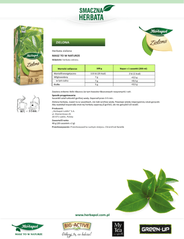 ZIELONA Herbata zielona MASZ TO W NATURZE Składniki: herbata zielona. Wartości odżywcze Wartość energetyczna 100 g Napar z 1 saszetki (200 ml) 115 kJ (25 kcal) 2 kJ (1 kcal) Węglowodany 7g w tym cukry 7g <0,5 g 5g <0,5 g Białko <0,5 g Zawiera znikome ilości tłuszczu (w tym kwasów tłuszczowych nasyconych) i soli. Sposób przygotowania: Saszetkę zalać szklanką gorącej wody. Zaparzać przez 3-5 min. Zielona herbata, nawet ta w saszetkach, nie lubi wrzącej wody. Powstaje wtedy nieprzyjemny smak goryczki. Aby wydobyć wspaniały smak tej herbaty zaparzaj ją gorącą, ale nie gotującą się wodą. Producent: ,,Herbapol-Lublin” S.A. ul. Diamentowa 25 20-471 Lublin, Polska Zawartość netto 40 g (20 saszetek x 2 g) Przechowywanie: Przechowywać w suchym miejscu. Chronić od światła. www.herbapol.com.pl