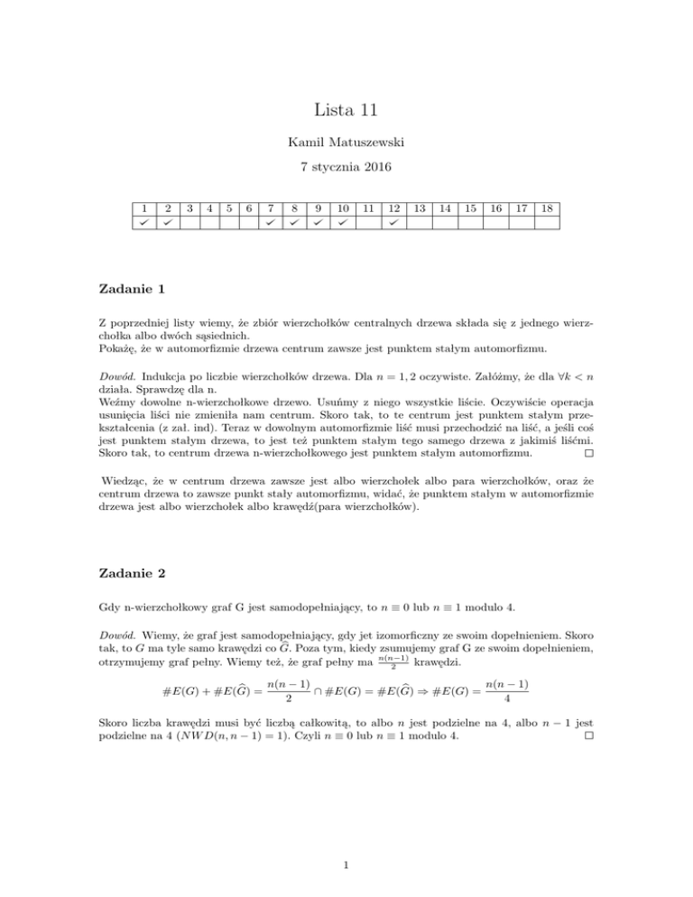 usunięcia liści nie zmieniła nam centrum. Skoro tak, to te centrum jest punktem stałym przekształcenia (z zał. ind). Teraz w dowolnym automorfizmie liść musi przechodzić na liść, a jeśli coś