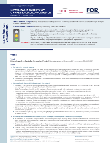 Zielona Księga i Konsultacje UE NOWELIZACJA DYREKTYWY O KWALIFIKACJACH ZAWODOWYCH Analiza z dnia 15 sierpnia 2011 r. TEMAT ZIELONEJ KSIĘGI: Komisja chce uprościć procedurę uznawania kwalifikacji zawodowych w zawodach o regulowanym dostępie NAJWAŻNIEJSZE ZAGADNIENIA (zawodach regulowanych). STRONY ZAANGAŻOWANE: Pracodawcy i pracownicy, osoby samo zatrudnione. ZA: ∙ Europejska Legitymacja Zawodowa ułatwi świadczenie usług i podejmowanie pracy za granicą, przez co przyczyni się do zwiększenia wzrostu gospodarczego i poziomu zatrudnienia. ∙ W kraju pochodzenia pracownika sprawdzenie, czy warunki uznania kwalifikacji zawodowych zostały spełnione, będzie łatwiejsze. ∙ Wspólne platformy, na których Państwa Członkowskie będą mogły publikować swe wymagania w zakresie uznawania kwalifikacji zwiększą pewność prawną i przejrzystość tego procesu PRZECIW: ∙ W przypadku, gdy warunkiem przystąpienia do szkoleń zawodowych jest dłuższy czas nauki w szkole, powinno brać się pod uwagę okres nauki zrealizowany w ramach dwutorowego systemu edukacji. TREŚĆ Tytuł Zielona Księga: Nowelizacja Dyrektywy o Kwalifikacjach Zawodowych z dnia 22 czerwca 2011 r., sygnatura COM(2011) 367. Treść ›› Tło i aktualna sytuacja prawna • Komisja zamierza zmienić dyrektywę dotyczącą uznawania kwalifikacji zawodowych (dyrektywa 2005/36/EC), której celem jest zagwarantowanie, by kwalifikacje uzyskane w jednym Kraju Członkowskim były uznawane we wszystkich pozostałych. • Aktualnie dyrektywa dotyczy jedynie zawodów regulowanych, czyli takich, które mogą być wykonywane – w ramach zatrudnienia lub samozatrudnienia – tylko wtedy, gdy pracownik posiada kwalifikacje zawodowe określone w odpowiednich ustawach lub przepisach administracyjnych. • Komisja chce znowelizować dyrektywę – zaprosiła zainteresowanych, by w ramach procedury konsultacji nadsyłali opinie dotyczące planów nowelizacji. ›› Wprowadzenie „Europejskiej Legitymacji Zawodowej” • Komisja chce wprowadzić Europejską Legitymację Zawodową, którą będą mogli posługiwać się pracownicy, chcący wykonywać zawody regulowane w innych Państwach Członkowskich. • Każde Państwo Członkowskie będzie musiało wskazać centralny urząd, który zajmie się wydawaniem legitymacji. • Stosowny urząd w ojczystym Kraju Członkowskim pracownika będzie miał za zadanie sprawdzić i potwierdzić, że: • wszystkie przedstawione kwalifikacje i inne niezbędne dokumenty są autentyczne; • kwalifikacje zawodowe uzyskane w kraju pochodzenia pracownika odpowiadają minimalnym wymogom przyjętym w UE, • kwalifikacje zawodowe uzyskane w kraju pochodzenia odpowiadają wymaganiom obowiązującym w goszczącym Państwie Członkowskim („zasada kraju pochodzenia”), chyba że istnieją ogólnounijne minimalne wymagania w danym zakresie. • kwestia innych wymagań, wykraczających poza zwykłe kwalifikacje zawodowe – np. zawarcia ubezpieczenia od odpowiedzialności zawodowej - ma być obserwowana przez Komisję. • Europejska Legitymacja Zawodowa może również zastąpić wymóg – obowiązujący dotychczas w przypadku czasowego świadczenia usług – uprzedniego złożenia deklaracji odpowiednim organom w goszczącym Państwie Członkowskim. • Odmowa wydania Europejskiej Legitymacji Zawodowej będzie możliwa, jeśli pracownik ma zakaz wykonywania zawodu w swoim kraju ojczystym. • Zdaniem Komisji, w sytuacji, gdy dostawcy usług będą mogli udowodnić swoje kwalifikacje, poprawi się również poziom ochrony konsumentów. ›› Automatyczne uznawanie minimalnych unijnych wymagań zawodowych w zawodach regulowanych • W zawodach, w przypadku których istnieją minimalne ogólnounijne wymogi dotyczące okresu kształcenia, szkolenia zawodowe przebyte w jednym z Państw Członkowskich automatycznie upoważniają do wykonywania zawodu w dowolnym innym Państwie Członkowskim. • Dyrektywa w sprawie kwalifikacji zawodowych zawiera minimalne wymagania w zakresie kwalifikacji w odniesieniu do lekarzy, dentystów i weterynarzy, pielęgniarek, położnych, farmaceutów i architektów. • Zdaniem Komisji, ten system automatycznego uznawania kwalifikacji stwarza sporo problemów, którymi Komisja chciałaby się zająć: • jeśli pracownicy chcą wykonywać swój zawód w innym Państwie Członkowskim tylko czasowo, muszą udowodnić, że nie są objęci zakazem wykonywania tego zawodu w swoim kraju pochodzenia. Jeśli jednak chcą na stałe zamieszkać w innym Kraju Członkowskim, taka procedura nie jest konieczna. Komisja sugeruje, by była ona wymagana w każdej sytuacji. Autorzy: Klaus-Dieter Sohn i Alexander Seibold | e-mail: [email protected] CEP | Kaiser-Joseph-Straße 266, 79098 Freiburg | Niemcy | tel. +49 (0)761 38693-105 | www.cep.eu Polska wersja analizy powstała dzięki Fundacji FOR FOR | Al. Szucha 2/4 lok. 20, 00-582 Warszawa | Polska | tel. +48 22 427 40 10 | www.for.org.pl Tłumaczenie: Krzysztof Szwałek Zrzeczenie się/Disclaimer: www.cep.eu/en/footer/legal-notice 1 Zielona Księga i Konsultacje UE NOWELIZACJA DYREKTYWY O KWALIFIKACJACH ZAWODOWYCH Analiza z dnia 15 sierpnia 2011 r. • w przypadku niektórych zawodów okres szkoleń wyrażony jest w latach lub godzinach szkoleniowych – brakuje wyjaśnienia, czy są to dwie możliwe opcje do wyboru [czy też trzeba te wymogi stosować łącznie – przyp. tłum]. Komisja proponuje łączne stosowanie obu tych minimalnych wymogów. • programy studiów i szkoleń stale się zmieniają. Programy studiów zmieniają się dodatkowo w ramach Procesu Bolońskiego. Absolwenci nowych lub zmienionych programów studiów mogą napotkać problemy, przenosząc się do innego Państwa Członkowskiego – program ich nauki może być tam nowością. Wprowadzając możliwość informowania o obowiązujących wymogach, Komisja chciałaby zagwarantować, że inne Państwa Członkowskie są w porę powiadomione o wszystkich t