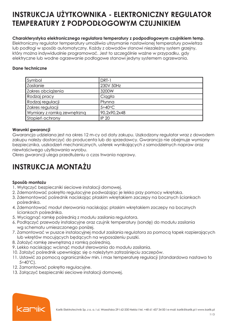 INSTRUKCJA UŻYTKOWNIKA - ELEKTRONICZNY REGULATOR TEMPERATURY Z PODPODŁOGOWYM CZUJNIKIEM Charakterystyka elektronicznego regulatora temperatury z podpodłogowym czujnikiem temp. Elektroniczny regulator temperatury umożliwia utrzymanie nastawionej temperatury powietrza lub podłogi w sposób automatyczny. Każdy z obwodów stanowi niezależny system grzejny, który można indywidualnie programować. Jest to szczególnie ważne w przypadku, gdy elektryczne lub wodne ogrzewanie podłogowe stanowi jedyny systemem ogrzewania. Dane techniczne Symbol Zasilanie Zakres obciążenia Rodzaj pracy Rodzaj regulacji Zakres regulacji Wymiary z ramką zewnętrzną Stopień ochrony DRT-1 230V 50Hz 3200W Ciągła Płynna 5÷40oC 90,2x90,2x48 IP 20 Warunki gwarancji Gwarancja udzielana jest na okres 12 m-cy od daty zakupu. Uszkodzony regulator wraz z dowodem zakupu należy dostarczyć do producenta lub do sprzedawcy. Gwarancja nie obejmuje wymiany bezpiecznika, uszkodzeń mechanicznych, usterek wynikających z samodzielnych napraw oraz niewłaściwego użytkowania wyrobu. Okres gwarancji ulega przedłużeniu o czas trwania naprawy. INSTRUKCJA MONTAŻU Sposób montażu 1. Wyłączyć bezpieczniki sieciowe instalacji domowej. 2. Zdemontować pokrętło regulacyjne podważając je lekko przy pomocy wkrętaka. 3. Zdemontować pośrednik naciskając płaskim wkrętakiem zaczepy na bocznych ściankach pośrednika. 4. Zdemontować moduł sterowania naciskając płaskim wkrętakiem zaczepy na bocznych ściankach pośrednika. 5. Wyciągnąć ramkę pośrednią z modułu zasilania regulatora. 6. Podłączyć przewody instalacyjne oraz czujnik temperatury (sondę) do modułu zasilania wg schematu umieszczonego poniżej. 7. Zamontować w puszce instalacyjnej moduł zasilania regulatora za pomocą łapek rozpierających lub wkrętów mocujących będących na wyposażeniu puszki. 8. Założyć ramkę zewnętrzną z ramką pośrednią. 9. Lekko naciskając wcisnąć moduł sterowania do modułu zasilania. 10. Założyć pośrednik upewniając się o należytym zatrzaśnięciu zaczepów. 11. Ustawić za pomocą ograniczników min. i max temperaturę regulacji (standardowa nastawa to o 5÷40 C). 12. Zamontować pokrętło regulacyjne. 13. Załączyć bezpieczniki sieciowe instalacji domowej. Karlik Elektrotechnik Sp. z o. o. I ul. Wrzesińska 29 I 62-330 Nekla I tel. +48 61 437 34 00 I e-mail: [email protected] I www.karlik.pl 1I3 INSTRUKCJA UŻYTKOWNIKA - ELEKTRONICZNY REGULATOR TEMPERATURY Z PODPODŁOGOWYM CZUJNIKIEM Dodatkowe funkcje 1. Funkcja utrzymywania minimalnej temperatury w pomieszczeniu: Pomimo faktu, że regulator jest wyłączony (tryb OFF) nppodczas dłuższej nieobecności domowników, nadal dokonuje on pomiaru temperatury w pomieszczeniu, a w przypadku kiedy spadnie ona poniżej temperatury minimalnej równej 5oC to załącza się automatycznie ogrzewanie. 2. Sygnalizacja uszkodzenia lub odłączenia czujnika temperatury: Jeżeli dioda sygnalizacyjna zaczyna świecić światłem pulsującym z częstotliwością f - 10/s oznacza to, że nastąpiło zwarcie pomiędzy dwoma przewodami czujnika. Jeżeli częstotliwość pulsowania diody wynosi f - 1/s oznacza to, że nastąpiło odłączenie jednego z przewodów czujnika od zacisku instalacyjnego. Schemat elektryczny podłączenia regulatora temperatury L N DRT-1 L N L’ N C T Wymagane akcesoria do elektronicznego regulatora temperatury z podpodłogowym czujnikiem Do kompletu z elektronicznym regulatorem temperatury DRT-1 należy dokupić ramkę zewnętrzną pojedynczą ...DR-1 lub wielokrotną ...DR-2 ÷ ...DR-5 dostępną w różnych wariantach kolorystycznych z tworzywa, drewna naturalnego lub o efekcie szkła. Uwaga! Instalacja musi zostać wykonana przez osobę o odpowiednich kwalifikacjach przy wyłączonym napięciu oraz musi odpowiadać krajowym normom bezpieczeństwa. Karlik Elektrotechnik Sp. z o. o. I ul. Wrzesińska 29 I 62-330 Nekla I tel. +48 61 437 34 00 I e-mail: [email protected] I www.karlik.pl 2I3 INSTRUKCJA UŻYTKOWNIKA - ELEKTRONICZNY REGULATOR TEMPERATURY Z PODPODŁOGOWYM CZUJNIKIEM Elektroniczny regulator temperatury z podpodłogowym czujnikiem temperatury elementy składowe pokrętło ograniczniki pośrednik regulatora moduł sterowania ramka pośrednia serii DECO ramka zewnętrzna serii DECO moduł zasilania podpodłogowy czujnik temperatury (sonda) Karlik Elektrotechnik Sp. z o. o. I ul. Wrzesińska 29 I 62-330 Nekla I tel. +48 61 437 34 00 I e-mail: [email protected] I www.karlik.pl 3I3