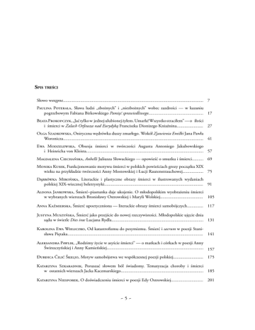 Spis treści Słowo wstępne.......................................................................................................................... 7 Paulina Poterała, Sława ludzi „zbożnych” i „niezbożnych” wobec zazdrości — w kazaniu pogrzebowym Fabiana Birkowskiego Pamięć sprawiedliwego................................................ 17 Beata Prokopczyk, „Jać tylko w jednej ulubionej żyłem. Umarła! Wszystko straciłem” — o iłości i śmierci w Żalach Orfeusza nad Eurydyką Franciszka Dionizego Kniaźnina....................... 27 Olga Szadkowska, Oniryczna wędrówka duszy zmarłego. Wokół Zjawienia Emilki Jana Pawła Woronicza.......................................................................................................................... 41 Ewa Modzelewska, Obsesja śmierci w twórczości Augusta Antoniego Jakubowskiego i Heinricha von Kleista...................................................................................................... 57 Magdalena Ciechańska, Anhelli Juliusza Słowackiego — opowieść o smutku i śmierci.......... 69 Monika Kusek, Funkcjonowanie motywu śmierci w polskich powieściach grozy początku XIX wieku na przykładzie twórczości Anny Mostowskiej i Łucji Rautenstrauchowej.................. 75 Dąbrówka Mirońska, Literackie i plastyczne obrazy śmierci w ilustrowanych wydaniach polskiej XIX-wiecznej beletrystyki...................................................................................... 91 Aldona Jankowska, Śmierć–piastunka daje ukojenie. O młodopolskim wyobrażeniu śmierci w wybranych wierszach Bronisławy Ostrowskiej i Maryli Wolskiej..................................... 105 Anna Kaźmierska, Śmierć upoetyczniona — literackie obrazy śmierci samobójczych.............. 117 Justyna Muszyńska, Śmierć jako przejście do nowej rzeczywistości. Młodopolskie ujęcie dnia sądu w świetle Dies irae Lucjana Rydla................................................................................ 131 Karolina Ewa Wieliczko, Od katastrofizmu do pesymizmu. Śmierć i sacrum w poezji Stanisława Piętaka...................................................................................................................... 141 Aleksandra Pawlik, „Rodzimy życie w asyście śmierci” — o matkach i córkach w poezji Anny Świrszczyńskiej i Anny Kamieńskiej.................................................................................... 157 Đurđica Čilić Škeljo, Motyw samobójstwa we współczesnej poezji polskiej.......................... 175 Katarzyna Szkaradnik, Poruszać słowem ból świadomy. Tematyzacja choroby i śmierci w ostatnich wierszach Jacka Kaczmarskiego........................................................................ 185 Katarzyna Niesporek, O doświadczeniu śmierci w poezji Edy Ostrowskiej............................ 201 ~~ Mateusz Żebrowski, Czas, magia oraz danse macabre, czyli metafory śmierci w Pani Mabb Susanny Clarke.................................................................................................................. 215 Michał Sadowski, Śmierć jako oczyszczenie duszy w twórczości Sarah Kane.......................... 227 Julita Gamoń, Człowiek odchodzi, pamięć pozostaje. Eufemizmy i synonimy śmierci w inskrypcjach nagrobnych na cmentarzach w Gorcach..................................................... 235 Bibliografia............................................................................................................................... 245 Indeks osób.............................................................................................................................. 257 Indeks postaci........................................................................................................................... 263 Spis ilustracji............................................................................................................................ ~~ 265