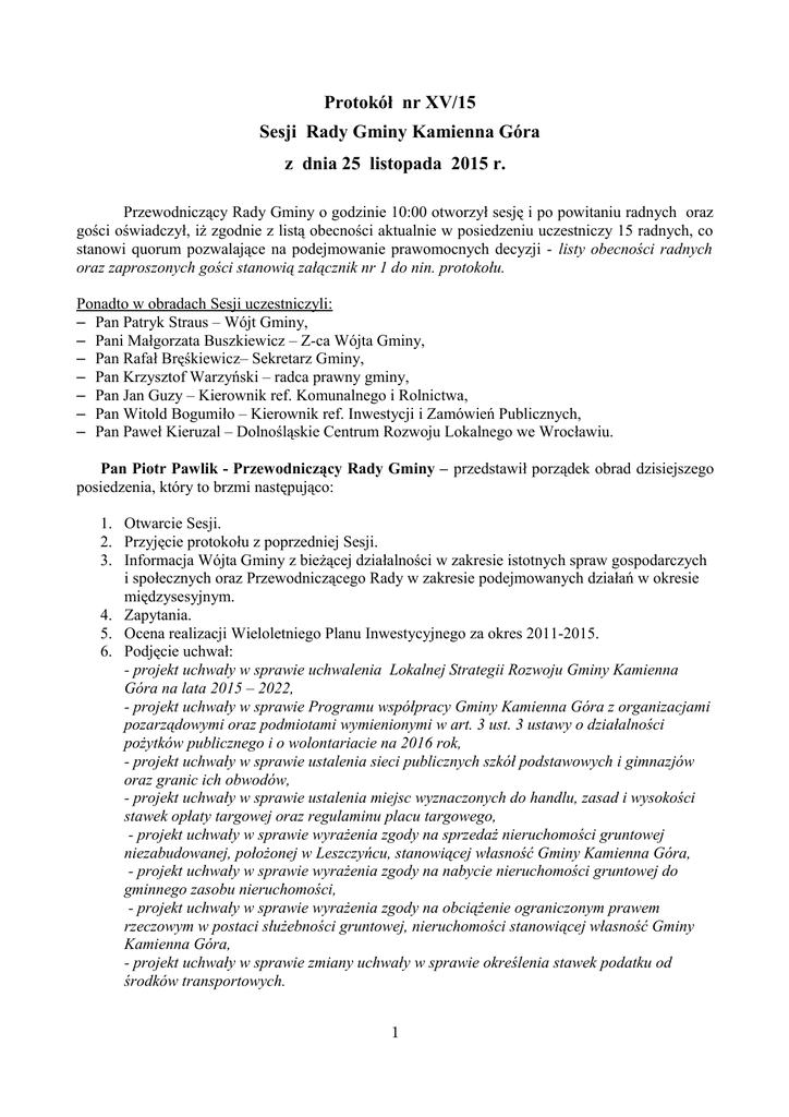 Protokół nr XV/15 Sesji Rady Gminy Kamienna Góra z dnia 25 listopada 2015 r. Przewodniczący Rady Gminy o godzinie 10:00 otworzył sesję i po powitaniu radnych oraz gości oświadczył, iż zgodnie z listą obecności aktualnie w posiedzeniu uczestniczy 15 radnych, co stanowi quorum pozwalające na podejmowanie prawomocnych decyzji - listy obecności radnych oraz zaproszonych gości stanowią załącznik nr 1 do nin. protokołu. Ponadto w obradach Sesji uczestniczyli: – Pan Patryk Straus – Wójt Gminy, – Pani Małgorzata Buszkiewicz – Z-ca Wójta Gminy, – Pan Rafał Bręśkiewicz– Sekretarz Gminy, – Pan Krzysztof Warzyński – radca prawny gminy, – Pan Jan Guzy – Kierownik ref. Komunalnego i Rolnictwa, – Pan Witold Bogumiło – Kierownik ref. Inwestycji i Zamówień Publicznych, – Pan Paweł Kieruzal – Dolnośląskie Centrum Rozwoju Lokalnego we Wrocławiu. Pan Piotr Pawlik - Przewodniczący Rady Gminy – przedstawił porządek obrad dzisiejszego posiedzenia, który to brzmi następująco: 1. Otwarcie Sesji. 2. Przyjęcie protokołu z poprzedniej Sesji. 3. Informacja Wójta Gminy z bieżącej działalności w zakresie istotnych spraw gospodarczych i społecznych oraz Przewodniczącego Rady w zakresie podejmowanych działań w okresie międzysesyjnym. 4. Zapytania. 5. Ocena realizacji Wieloletniego Planu Inwestycyjnego za okres 2011-2015. 6. Podjęcie uchwał: - projekt uchwały w sprawie uchwalenia Lokalnej Strategii Rozwoju Gminy Kamienna Góra na lata 2015 – 2022, - projekt uchwały w sprawie Programu współpracy Gminy Kamienna Góra z organizacjami pozarządowymi oraz podmiotami wymienionymi w art. 3 ust. 3 ustawy o działalności pożytków publicznego i o wolontariacie na 2016 rok, - projekt uchwały w sprawie ustalenia sieci publicznych szkół podstawowych i gimnazjów oraz granic ich obwodów, - projekt uchwały w sprawie ustalenia miejsc wyznaczonych do handlu, zasad i wysokości stawek opłaty targowej oraz regulaminu placu targowego, - projekt uchwały w sprawie wyrażenia zgody na sprzedaż nieruchomości gruntowej niezabudowanej, położonej w Leszczyńcu, stanowiącej własność Gminy Kamienna Góra, - projekt uchwały w sprawie wyrażenia zgody na nabycie nieruchomości gruntowej do gminnego zasobu nieruchomości, - projekt uchwały w sprawie wyrażenia zgody na obciążenie ograniczonym prawem rzeczowym w postaci służebności gruntowej, nieruchomości stanowiącej własność Gminy Kamienna Góra, - projekt uchwały w sprawie zmiany uchwały w sprawie określenia stawek podatku od środków transportowych. 1 7. Wnioski i zapytania. 8. Sprawy różne. Przewodniczący Rady Gminy – zwrócił się z pytaniem, czy ktoś z radnych chciałby wnieść inne poprawki do porządku obrad dzisiejszej Sesji? Wniosków i uwag nie zgłoszono. Porządek obrad XV Sesji Rady Gminy został przez Radę Gminy przyjęty - głosowało 15 radnych: wystąpiło 15 głosów „za”, głosy „przeciw” oraz „wstrzymuję się” nie wystąpiły. Ad. 1 Otwarcie Sesji – opisano na wstępie. Ad. 2 Przyjęcie protokołu z poprzedniej Sesji. Przewodniczący Rady Gminy zapytał, czy ktoś z radnych chciałby wnieść poprawki do protokołu z poprzedniej Sesji? Wobec braku zgłoszonych uwag, Rada Gminy przyjęła protokół Sesji XIV/15 z dnia 28 października 2015 r. (głosowało 15 radnych: wystąpiło 15 głosów „za”, głosy „przeciw” oraz „wstrzymuję się” nie wystąpiły). Ad. 3 Informacja Wójta Gminy z bieżącej działalności w zakresie istotnych spraw gospodarczych i społecznych oraz Przewodniczącego Rady w zakresie podejmowanych działań w okresie międzysesyjnym. Informacje o pracy Wójta Gminy w okresie od poprzedniej sesji do dnia dzisiejszego przedstawił Pan Patryk Straus – Wójt Gminy - załącznik nr 2. Pan Piotr Pawlik - Przewodniczący Rady Gminy – przedstawił informacje z działalności Przewodniczącego Rady Gminy w okresie międzysesyjnym - załącznik nr 3. Pytania: Pan Stanisław Wondołowski – zapytał, pod jakie cele będzie ewentualnie pozyskany budynek po byłej szkole w Ogorzelcu? oraz czy brakuje pracowników w gminie, skoro musimy ogłaszać nabór ds. płac? Pan Patryk Straus – Wójt Gminy – w odpowiedzi przypomniał, iż na wolne stanowisko pracy ds. płac ogłoszony został zgodnie z wymogiem ustawowym nabór, w wyniku którego konkurs wygrała jedna z kandydatek. Z Panią tą podpisana została umowa na okres próbny, po którym to nie została ona przedłużona. W związku z brakiem przedłużenie wskazanej umowy, ponownie ogłoszono nabór na wolne stanowisko urzędnicze. W zakresie pierwszego pytania, radni pracującym w Komisji Społecznej oponującej wnioski mieszkaniowe wiedzą z jakimi problemami boryka się gminy przy podziale mieszkań. Problem stanowi brak wolnych mieszkań do przydziału. Propozycja dotyczy wstępnego obejrzenia budynku i jego stanu technicznego. Na szczegóły jest za wcześnie. Pan Stanisław Wondołowski – dopowiedział, iż ustalali na naradach, że nie będziemy remontowych starych budynków, tylko będziemy zmierzać do budowy nowych. 2 Pan Patryk Straus – Wójt Gminy – podkreślił, iż jest to jedynie propozycja spotkania celem lustracji budynku. O ewentualnych planowanych decyzjach radni będą informowani. Pan Jan Łepski – przypomniał o dyskusji na ostatniej Komisji Finansowo – Gospodarczej w zakresie inwestycji w Krzeszowie na placu klasztornym. Radny wyraził swój niepokój tym zadaniem pytając, czy gmina nie ma innych pilniejszych zadań czy planów? teren ten jest własnością sióstr klasztoru, a po inwestycji i wyłożeniu gminnych pieniędzy zostanie nam po 5 – ciu latach zabrany. Pan Patryk Straus – Wójt Gminy – porządkując temat, wywołany wniosek dotyczy zagospodarowania terenu który będzie w użyczeniu pod potrzeby realizacji projektu. Dofinansowanie 85 % kosztów projektu. W przypadku skutecznego pozyskania środków unijnych