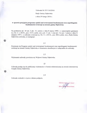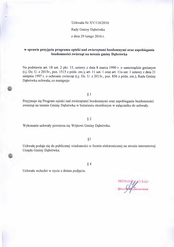 U chw ała N r X V /1 16/2016 R ady G m iny D ąbrów ka z dnia 29 lutego 2016 r. w sprawie przyjęcia programu opieki nad zwierzętami bezdomnymi oraz zapobiegania bezdomności zwierząt na terenie gminy Dąbrówka N a podstaw ie art. 18 ust. 2 pkt. 15, ustaw y z dnia 8 m arca 1990 r. o sam orządzie gm innym (t.j. Dz. U. z 2015r., poz. 1515 z późn. zm .), art. 11 ust. 1 oraz art. 1 l a ust. 1 ustaw y z dnia 21 sierpnia 1997 r. o ochronie zw ierząt (t.j. Dz. U. z 2013r., poz. 856 z późn. zm .), R ada G m iny D ąbrów ka uchw ala, co następuje: §1 P rzyjm uje się P ro g ram opieki nad zw ierzętam i bezdom nym i oraz zap o b ieg an ie bezdom ności zw ierząt na terenie G m iny D ąbrów ka w brzm ieniu określonym w załączn ik u do uchw ały. §2 W ykonanie u chw ały p o w ierza się W ójtow i G m iny D ąbrów ka. §3 U chw ałę p o d aje się do publicznej w iadom ości w form ie elektronicznej n a stronie internetow ej U rzędu G m iny D ąbrów ka. §4 U chw ała w chodzi w życie z dniem podjęcia. Załącznik do uchwały Rady Gminy Dąbrówka Nr X V /116/2016 z dnia 29 lutego 2016 r. Program opieki nad zwierzętami bezdomnymi oraz zapobiegania bezdomności zwierząt na terenie Gminy Dąbrówka w 2016 roku Wprowadzenie Podstawą prawną podjęcia przez Radę Gminy Dąbrówka uchwały w sprawie „Programu opieki nad zwierzętami bezdomnymi oraz zapobieganiu bezdomności zwierząt na terenie gminy Dąbrówka" zwanego dalej programem jest art. 1 la ustawy z dnia 21 sierpnia 1997 roku o ochronie zwierząt (tekst jednolity Dz. U z 2013, poz. 856) Projekt programu zgodnie z art. 1 la, ust. 7 pkt. 1,2 i 3 przed przyjęciem przez Radę Gminy podlega przekazaniu do zaopiniowania przez: 1) właściwego Powiatowego Lekarza Weterynarii w Warszawie, ul. Gagarina 15, 00-753 Warszawa 2) Towarzystwo Opieki nad Zwierzętami w Polsce Zarząd Główny w Warszawie, ul. Noakowskiego 4 00-666 Warszawa 3) dzierżawców lub zarządców obwodów łowieckich, działających na obszarze Gminy: - Koło Łowieckie „Przepiórka”, Skr. Pocztowa 37, 05-250 Radzymin - Koło Łowieckie „Uroczysko”, ul. Drużynowa 1, 02-590 Warszawa - Koło Łowieckie „Dinosaurus”, ul. Wojska Polskiego 27, 05-254 Kuligów Programem objęte są wszystkie zwierzęta domowe, w szczególności psy i koty w tym koty wolno żyjące i zwierzęta gospodarskie. Większość działań określonych w programie dotyczy psów i kotów, ponieważ skala bezdomności tych zwierząt jest najw iększa. Bezdomność zwierząt jest zjawiskiem społecznym, którego głównymi przyczynami są: - niekontrolowane rozmnażanie, - porzucanie zwierząt przez właścicieli, - ucieczki zwierząt, - łatwość pozyskiwania zwierząt, - brak edukacji i wiedzy społeczeństwa w zakresie metod zapobiegania bezdomności, ze szczególnym uwzględnieniem sterylizacji i kastracji. Elektroniczne znakowanie /czipowanie/ zwierząt to jedna z głównych metod zapobiegania bezdomności zwierząt, dlatego też zwierzęta bezdomne trafiające do schronisk są znakowane, pozwala na szybkie odnajdywanie właścicieli zagubionych zwierząt. co Sterylizacja i kastracja zwierząt bezdomnych oraz domowych to najskuteczniejszą metoda unikania niekontrolowanej rozrodczości zwierząt. Koty wolno żyjące, bytujące głównie przy zagrodach. Obecność ich zapobiega rozprzestrzenianiu się gryzoni /myszy i szczurów/. Koty te nie są zwierzętami bezdomnymi, dlatego nie należy ich wyłapywać i wywozić, lecz stwarzać warunki bytowania w miejscach ich dotychczasowego schronienia. Realizacja wszystkich zadań, określonych w programie zmierza do ograniczenia liczby bezdomnych zwierząt trafiających pod opiekę Schroniska dla Bezdomnych Zwierząt. Postanowienia ogólne § 1. Ilekroć w uchwale jest mowa o: 1) Urzędzie, należy przez to rozumieć Urząd Gminy Dąbrówka, który wykonuje zadania; 2) Schronisku, należy przez to rozumieć Schronisko dla Bezdomnych Zwierząt spełniające warunki określone w rozporządzeniu Ministra Rolnictwa i Rozwoju Wsi z dnia 23 czerwca 2004 r. w sprawie szczegółowych wymagań weterynaryjnych dla prowadzenia schronisk dla zwierząt, z którym Urząd Gminy zawarł umowę na odłów i utrzymywanie psów w schronisku; 3) Zwierzętach bezdomnych, należy przez to rozumieć zwierzęta domowe lub gospodarskie, które uciekły, zabłąkały się lub zostały porzucone przez człowieka, a nie ma możliwości ustalenia ich właściciela lub innej osoby, pod której opieką trwale dotąd pozostawały; 4) Zwierzętach domowych, należy rozumieć zwierzęta tradycyjnie przebywające wraz z człowiekiem w jego domu lub odpowiednim pomieszczeniu; 5) Zwierzęta gospodarskie, należy przez to rozumieć zwierzęta hodowane w gospodarstwach rolnych; 6) Kotach wolno żyjących, należy prze to rozumieć koty urodzone lub żyjące na wolności (żyjące w otoczeniu człowieka w stanie dzikim). § 2. 1. Koordynatorem Programu jest Wójt Gminy Dąbrówka 2. Realizatorem Programu są: 1) Wójt Gminy Dąbrówka; 2) Schronisko dla Bezdomnych Zwierząt Dworakowski Zygmunt we wsi Radysy 13, 12-23 Biała Piska; 3) osoby prawne i fizyczne działające na rzecz zapewnienia opieki bezdomnym zwierzętom. Cel i zadania programu § 3. 1. Celem Programu jest zapobieganie bezdomności zwierząt na terenie gminy Dąbrówka oraz opieka nad zwierzętami bezdomnymi. 2. Zadania priorytetowe Programu to: 1) elektroniczne znakowanie /czipowanie/ zwierząt, w szczególności psów i kotów; 2) ograniczanie populacji bezdomnych zwierząt poprzez sterylizację i kastrację zwierząt domowych, w szczególności psów i kotów; 3) zapewnienie opieki bezdomnym zwierzętom z terenu Gminy Dąbrówka; 4) poszukiwanie nowych właścicieli dla bezdomnych zwierząt; 5) odławianie bezdomnych zwierząt; 6) zapewnienie całodobowej opieki weterynaryjnej w przypadkach zdarzeń drogowych z udziałem zwierząt; 7) edukacja mieszkańców gminy Dąbrówka w zakresie opieki nad zw