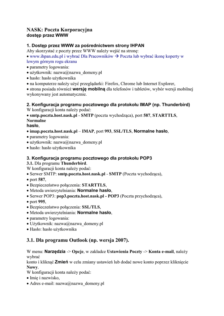 NASK: Poczta Korporacyjna dostęp przez WWW 1. Dostęp przez WWW za pośrednictwem strony IHPAN Aby skorzystać z poczty przez WWW należy wejść na stronę: www.ihpan.edu.pl i wybrać Dla Pracowników Poczta lub wybrać ikonę koperty w lewym górnym rogu ekranu parametry logowania: użytkownik: nazwa@nazwa_domeny.pl hasło: hasło użytkownika na komputerze należy użyć przeglądarki: Firefox, Chrome lub Internet Explorer, strona posiada również wersję mobilną dla telefonów i tabletów, wybór wersji mobilnej wykonywany jest automatycznie. 2. Konfiguracja programu pocztowego dla protokołu IMAP (np. Thunderbird) W konfiguracji konta należy podać: smtp.poczta.host.nask.pl - SMTP (poczta wychodząca), port 587, STARTTLS, Normalne hasło, imap.poczta.host.nask.pl – IMAP, port 993, SSL/TLS, Normalne hasło, parametry logowania: użytkownik: nazwa@nazwa_domeny.pl hasło: hasło użytkownika 3. Konfiguracja programu pocztowego dla protokołu POP3 3.1. Dla programu Thunderbird. W konfiguracji konta należy podać: Serwer SMTP: smtp.poczta.host.nask.pl - SMTP (Poczta wychodząca), port 587, Bezpieczeństwo połączenia: STARTTLS, Metoda uwierzytelniania: Normalne hasło, Serwer POP3: pop3.poczta.host.nask.pl - POP3 (Poczta przychodząca), port 995, Bezpieczeństwo połączenia: SSL/TLS, Metoda uwierzytelniania: Normalne hasło, parametry logowania: Użytkownik: nazwa@nazwa_domeny.pl Hasło: hasło użytkownika 3.1. Dla programu Outlook (np. wersja 2007). W menu: Narzędzia -> Opcje, w zakładce Ustawienia Poczty -> Konta e-mail, należy wybrać konto i kliknąć Zmień w celu zmiany ustawień lub dodać nowe konto poprzez kliknięcie Nowy. W konfiguracji konta należy podać: Imię i nazwisko, Adres e-mail: nazwa@nazwa_domeny.pl Typ konta: POP3 Serwer poczty przychodzącej: pop3.poczta.host.nask.pl Serwer poczty wychodzącej (SMTP): smtp.poczta.host.nask.pl Nazwa użytkownika: nazwa@nazwa_domeny.pl Hasło, zaznaczyć Zapamiętaj hasło Następnie kliknąć Więcej ustawień W zakładce Serwer wychodzący zaznaczyć: Serwer wychodzący (SMTP) wymaga uwierzytelniania oraz wybrać Użyj tych samych ustawień, co mój serwer poczty przychodzącej W zakładce Zaawansowane: zaznaczyć: Ten serwer wymaga szyfrowanego połączenia (SSL), w polu Serwer przychodzący (POP3) podać wartość numeru portu 995, w polu Serwer wychodzący (SMTP) podać wartość numeru portu 587, w polu Użyj połączenia szyfrowanego następującego typu wybrać Automatyczne, na koniec potwierdzić OK. Po powrocie do poprzedniego okna ustawień kliknąć Testuj ustawienia konta Jeśli sprawdzenie przeszło poprawnie, kliknąć Dalej i następnie Zakończ. Zamknąć panel ustawień konta klikając na Zamknij oraz panel Opcji klikając OK. 4. Konfiguracja programu pocztowego dla protokołu MAPI (Outlook + Zimbra Connector) Do konta typu Professional można podłączyć program Outlook przez protokół MAPI, który synchronizuje z serwerem Zimbra pocztę, kalendarze, kontakty i książkę adresową. Outlook wymaga instalacji dodatkowej wtyczki Zimbra Connector for Microsoft Outlook. Można ją pobrać w wersjach 32 bitowej i 64 bitowej ze strony: https://www.poczta.host.nask.pl/downloads/index.html po podaniu nazwy użytkownika i hasła do konta. Podręcznik instalacji Zimbra Connector for Outlook dla użytkownika znajduje się pod adresem: https://files.zimbra.com/website/docs/8.6/ZCS_Connector_for_Outlook_User_Guide_8.6.0. pdf Przed instalacją Zimbra Connector for Outlook należy wyłączyć program Outlook. Instalator stworzy nowy profil Outlook, poprzedni profil zostanie zachowany. Pierwszy test instalacji Zimbra Connector for Outlook zalecamy przeprowadzić na komputerze, gdzie normalnie Outlook nie jest wykorzystywany. W konfiguracji połączenia należy podać: mapi.poczta.host.nask.pl – serwer MAPI (Outlook + Zimbra Connector), należy zaznaczyć: „Użyj bezpiecznego połączenia” parametry logowania: użytkownik: nazwa@nazwa_domeny.pl hasło: hasło użytkownika w konfiguracji ustawień międzynarodowych należy ustawić kodowanie UTF-8, do udostępniania kalendarzy, folderów, kontaktów oraz zakładania filtrów należy używać interfejsu WWW (punkt 1). 5. Konfiguracja urządzenia mobilnego przez protokół ActiveSync Do konta typu Professional można podłączyć się z urządzenia mobilnego, telefonu lub tabletu poprzez protokół ActiveSync, który synchronizuje z serwerem Zimbra pocztę, kalendarze, kontakty i książkę adresową. W konfiguracji połączenia należy podać: mobile.poczta.host.nask.pl – serwer ActiveSync (np. w Android należy dodać konto Exchange i podać wymienioną nazwę serwera), parametry logowania: użytkownik: nazwa@nazwa_domeny.pl hasło: hasło użytkownika