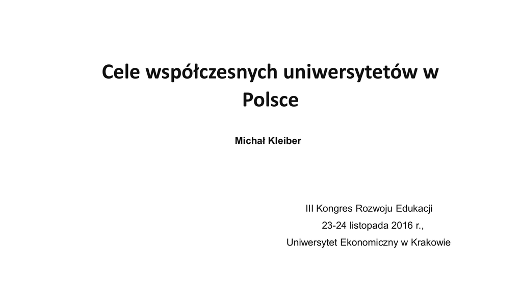 Cele współczesnych uniwersytetów w Polsce Michał Kleiber III Kongres Rozwoju Edukacji 23-24 listopada 2016 r., Uniwersytet Ekonomiczny w Krakowie Uniwersytet to kluczowy element w procesie tworzenia się społeczeństwa wiedzy – będącego realną ideą, a nie tylko medialnie nadużywanym sloganem !!! „Europa potrzebuje silnych i twórczych uniwersytetów jako głównych aktorów kształtujących europejskie społeczeństwo wiedzy przez promocję jakości i doskonałości w nauczaniu, badaniach naukowych i działalności innowacyjnej oraz przez umożliwienie szerokiego dostępu do studiów i rozwój oferty kształcenia ustawicznego” EUA 2005 Społeczne znaczenie „nowego” uniwersytetu – większe niż kiedykolwiek dotychczas! W społeczeństwach coraz liczniejszych krajów zdobywanie i upowszechnianie wiedzy traktowane jest coraz poważniej. Wiedza i umiejętności zyskują na znaczeniu nie z uwagi na technokratyczną modę lub polityczną poprawność, lecz ze względu na kształtowanie się odmienionej społecznej mentalności, wręcz „nowego społeczeństwa”, świadomego wyzwań, którym wszyscy musimy stawiać dzisiaj czoła. Co robić aby nie zawieść nadziei z tym związanych? Relacje międzyludzkie ulegają w dzisiejszych czasach gruntownej przebudowie, włączając coraz szersze grono obywateli w gęstniejące „społeczeństwo sieci” – ułatwiające współdziałanie, ale często też skupiające uwagę na tym, co chwilowe i ulotne. Często role twórcy wiedzy i jej użytkownika, eksperta i obserwatora wydarzeń ulegają przemieszaniu. Nowa społeczna świadomość – obok dążenia do osobistego sukcesu charakteryzuje się m.in. coraz większą wagą przywiązywaną do realizacji specyficznych wartości – życia w zgodzie z naturą, zwalczania wszelkich form społecznego wykluczenia, szeroko rozumianej solidarności. Zmiany w wyniku kształtowania się uniwersytetu powszechnego (mass university) – mniej więcej od roku 1970 Gwałtowny wzrost liczby studentów Zwiększone oczekiwania społeczne Globalizacja i konkurencja Profesjonalna administracja Tendencja do kontroli i zmniejszania wydatków budżetowych Odchodzenie od tradycyjnego paradygmatu uniwersytetu – jedności miejsca i czasu (na kampusie) Mega-cel istnienia uczelni to tworzenie trwałych podstaw społeczno-gospodarczego rozwoju kraju na drodze upowszechniania racjonalnego oglądu świata, tworzenia i szerokiego upowszechniania nowoczesnej wiedzy, możliwości rozwoju kreatywnych talentów obywateli przekładających się na osiągnięcia w zakresie szeroko rozumianej kultury i innowacyjności, zapobiegania wszelkim formom wykluczenia społecznego, zapewniania bezpieczeństwa obywateli, dbałości o silną pozycje Polski w świecie. Realizacja tego mega-celu następuje tradycyjne poprzez dążenie do doskonałości w trzech obszarach: - dydaktyka - badania - działalność na rzecz innowacyjności gospodarki W rankingu uczelni akademickich miesięcznika Perspektywy uwzględniającego kryteria podzielone na Prestiż, Potencjał Naukowy i Efektywność Naukowa, Warunki Kształcenia, Umiędzynarodowienie, Innowacyjność - dydaktyka (36%) - badania (49%) - innowacje i wdrożenia (15%) Umiejętności podstawowe – stawianie czoła codziennym wyzwaniom Pozyskiwania potrzebnej wiedzy Świadomość kulturowa Korzystanie z osiągnięć teleinformatyki Nowoczesne Kompetencje – stawianie czoła złożonym wyzwaniom Myślenie krytyczne i zdolność rozwiązywania problemów Kreatywność Sprawność komunikacyjna Umiejętność pracy w zespole Cechy charakterologiczne – stawianie czoła nieznanym wyzwaniom Ciekawość i chęć uzupełniania wiedzy Inicjatywa Wytrwałość Zdolności adaptacyjne Wrażliwość społeczna Zdolności przywódcze dydaktyka badania innowacje i wdrożenia - odziaływanie na otoczenie – uczelnia jako otwarte centrum życia intelektualnego społeczeństwa - popularyzacja osiągnięć współczesnej nauki - kształcenie ustawiczne i kształcenie na odległość - merytoryczne debaty obywatelskie - nauka i edukacja obywatelska (citizen science) - społeczne współfinansowanie (crowdfunding) - innowacje społeczne - relacje ze światem polityki (soft power, science diplomacy) Kształcenie na odległość - studia tańsze i oferujące kontakt (internetowy!) z najlepszymi wykładowcami - MOOC (Massive Open Online Courses) – wiele milionów słuchaczy - edX (Harvard i MIT): 140 tys. studentów z USA, 70 tys. z Europy, 60 tys. z Indii, 30 tys. z Afryki. Opłaty jedynie za wystawienie dyplomów, program edX do nabycia za 50 tys.$ - GeorgiaTech i AT&T: informatyczne studia magisterskie online za 7 tys.$ przy opłacie za studia w tradycyjnym systemie 25 tys.$ - liczne programy wspierania innowacyjnej przedsiębiorczości w trybie online, np. Laboratorium Innowacji (Harvard), Centrum Kreatywnej Przedsiębiorczości (MIT), Garaż (Northwestern Univ.) Innowacje społeczne Rozwiązania, które odpowiadają na zapotrzebowanie społeczne, ale powodują także trwałą zmianę w funkcjonowaniu całych docelowych grup społecznych. Mówiąc o innowacjach społecznych mamy zgodnie z powyższym po pierwsze na myśli zdolność trafnego rozpoznania konkretnego problemu społecznego i, po wtóre, realizację specjalnego programu, całkowicie oryginalnego bądź zaadaptowanego z innego obszaru życia publicznego, pozwalającego na osiągnięcie w dużej grupie adresatów korzystnych zmian o trwałym charakterze. Przy czym istotną cechą zarówno projektowania jak i realizacji programu powinien być szeroki udział obywateli-interesariuszy danej sprawy – mówimy tu bowiem z naciskiem o innowacjach partycypacyjnych. Jak mierzyć skuteczność takich innowacji? Citizen Science - rosnące znaczenie wciągania do inicjatyw badawczo - edukacyjnych nieprofesjonalnych „badaczy” i osób zainteresowanych zdobywaniem wiedzy - od małych grup do przedsięwzięć w globalnej skali - od zbiera
