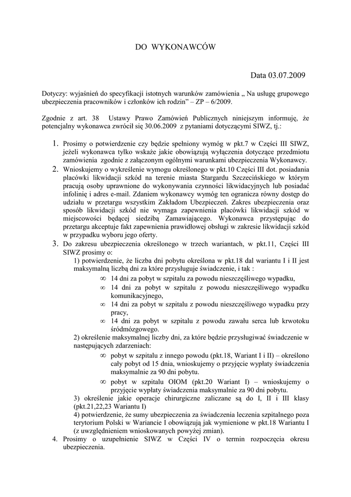 DO WYKONAWCÓW Data 03.07.2009 Dotyczy: wyjaśnień do specyfikacji istotnych warunków zamówienia „ Na usługę grupowego ubezpieczenia pracowników i członków ich rodzin” – ZP – 6/2009. Zgodnie z art. 38 Ustawy Prawo Zamówień Publicznych niniejszym informuję, Ŝe potencjalny wykonawca zwrócił się 30.06.2009 z pytaniami dotyczącymi SIWZ, tj.: 1. Prosimy o potwierdzenie czy będzie spełniony wymóg w pkt.7 w Części III SIWZ, jeŜeli wykonawca tylko wskaŜe jakie obowiązują wyłączenia dotyczące przedmiotu zamówienia zgodnie z załączonym ogólnymi warunkami ubezpieczenia Wykonawcy. 2. Wnioskujemy o wykreślenie wymogu określonego w pkt.10 Części III dot. posiadania placówki likwidacji szkód na terenie miasta Stargardu Szczecińskiego w którym pracują osoby uprawnione do wykonywania czynności likwidacyjnych lub posiadać infolinię i adres e-mail. Zdaniem wykonawcy wymóg ten ogranicza równy dostęp do udziału w przetargu wszystkim Zakładom Ubezpieczeń. Zakres ubezpieczenia oraz sposób likwidacji szkód nie wymaga zapewnienia placówki likwidacji szkód w miejscowości będącej siedzibą Zamawiającego. Wykonawca przystępując do przetargu akceptuje fakt zapewnienia prawidłowej obsługi w zakresie likwidacji szkód w przypadku wyboru jego oferty. 3. Do zakresu ubezpieczenia określonego w trzech wariantach, w pkt.11, Części III SIWZ prosimy o: 1) potwierdzenie, Ŝe liczba dni pobytu określona w pkt.18 dal wariantu I i II jest maksymalną liczbą dni za które przysługuje świadczenie, i tak : • 14 dni za pobyt w szpitalu za powodu nieszczęśliwego wypadku, • 14 dni za pobyt w szpitalu z powodu nieszczęśliwego wypadku komunikacyjnego, • 14 dni za pobyt w szpitalu z powodu nieszczęśliwego wypadku przy pracy, • 14 dni za pobyt w szpitalu z powodu zawału serca lub krwotoku śródmózgowego. 2) określenie maksymalnej liczby dni, za które będzie przysługiwać świadczenie w następujących zdarzeniach: • pobyt w szpitalu z innego powodu (pkt.18, Wariant I i II) – określono cały pobyt od 15 dnia, wnioskujemy o przyjęcie wypłaty świadczenia maksymalnie za 90 dni pobytu. • pobyt w szpitalu OIOM (pkt.20 Wariant I) – wnioskujemy o przyjęcie wypłaty świadczenia maksymalnie za 90 dni pobytu. 3) określenie jakie operacje chirurgiczne zaliczane są do I, II i III klasy (pkt.21,22,23 Wariantu I) 4) potwierdzenie, Ŝe sumy ubezpieczenia za świadczenia leczenia szpitalnego poza terytorium Polski w Wariancie I obowiązują jak wymienione w pkt.18 Wariantu I (z uwzględnieniem wnioskowanych powyŜej zmian). 4. Prosimy o uzupełnienie SIWZ w Części IV o termin rozpoczęcia okresu ubezpieczenia. 5. W nawiązaniu do wykazu dokumentów określonych w Części VI.1. wnioskujemy o: 5.1 określenie oświadczenia dot. „wykazu podmiotów reasekurujących” (pkt.7) jako załącznika fakultatywnego, którego brak nie powoduje wykluczenia z udziału w postępowaniu przetargowym. 5.2 wprowadzenie moŜliwości dla wykonawcy wskazania w złoŜonej ofercie informacji stanowiących tajemnice przedsiębiorstwa i aby wskazane informacje nie podlegały ujawnieniu osobom trzecim poprzez złoŜenie oświadczenia o ich zastrzeŜeniu jako informacji stanowiących tajemnicę przedsiębiorstwa. 6. W związku z zapisem pkt.3 w Części XIV SIWZ prosimy o wyraŜenie zgody na zawieranie polis rocznych na kaŜdy kalendarzowy rok ochrony ubezpieczeniowej – 3 polisy rocznie obejmujące 3 letni okres ubezpieczenia. 7. Prosimy o uzupełnienie SIWZ o dane dotyczące przebiegu szkodowości w okresie ostatnich 3 lat, tj.: wypłacone świadczenia, liczba wypłaconych świadczeń oraz utworzone rezerwy na świadczenia zgłoszone i nie wypłacone. W odpowiedzi na powyŜsze pytania kolejno odpowiadamy: 1. Zamawiający nie ustala wymagań dotyczących sposobu przedstawienia występujących wyłączeń odpowiedzialności Wykonawcy. Wymagane jest aby przedstawiona lista (katalog) wyłączeń był kompletny w stosunku do wszystkich zdarzeń objętych ubezpieczeniem. 2. Zamawiający w pkt.10 Rozdział III określił, Ŝe wymaga posiadania placówki likwidacji szkód „LUB” infolinii i adresu e-mail. 3. 3.1 Jak wskazano w tabeli zdarzeń objętych ubezpieczeniem Zamawiający wymaga wypłaty świadczeń za pełne leczenie szpitalne trwające minimum 4 dni. W wysokości zaleŜnej od wskazanych przypadków róŜnej dla pierwszych 14 dni i kolejnych (tj. od 15 dnia do końca pobytu w szpitalu). 3.2 Za czas pobytu w szpitalu z innego powodu (pkt.8 par.5) oraz pobytu od 15 dnia z przyczyn wskazanych (w pkt.18 par 1- 4) ubezpieczonemu przysługiwać będzie jednakowe dzienne świadczenie. Świadczenie ubezpieczonego za pobyt na OIOM jest świadczeniem jednorazowym, niezaleŜnym od długości jego trwania. 3.3 OPERACJE CHIRURGICZNE KLASY I 1. Rozległa resekcja tkanki mózgowej 2. Wycięcie zmiany tkanki mózgowej 3. Stereotaktyczna ablacja tkanki mózgowej 4. Przeszczep nerwu czaszkowego 5. Wewnątrzczaszkowe przecięcie nerwu czaszkowego 6. Wycięcie zmiany nerwu czaszkowego 7. Operacja naprawcza nerwu czaszkowego 8. Wewnątrzczaszkowa stereotaktyczna dekompresja nerwu czaszkowego 9. Usunięcie zmiany opony mózgu 10. Rekonstrukcja opony twardej 11. DrenaŜ przestrzeni zewnątrzoponowej 12. DrenaŜ przestrzeni podogonowej 13. Częściowe usunięcie rdzenia kręgowego 14. Operacja korzenia nerwu rdzeniowego 15.Wycięcie przysadki mózgowej 16. Operacja szyszynki 17. Całkowita rekonstrukcja sutka 18. Operacja ślimaka 19. Wycięcie gardła 20. Rekonstrukcja krtani 21. Częściowe wycięcie tchawicy 22. Przeszczep płuca 23. Wycięcie płuca 24. Usunięcie zmiany tkanki płucnej metodą otwartą 25. Wycięcie przełyku i Ŝołądka 26. Całkowite wycięcie przełyku 27. Zespolenie omijające przełyku 28. Operacja naprawcza przełyku 29. Całkowite wycięcie Ŝołądka 30. Całkowite wycięcie odbytnicy i okręŜnicy 31. Całkowite wycięcie okręŜnicy 32. Wycięcie odb