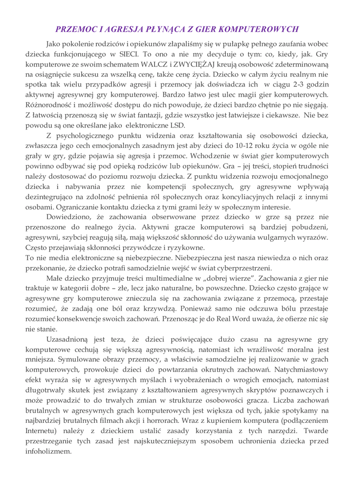 PRZEMOC I AGRESJA PŁYNĄCA Z GIER KOMPUTEROWYCH Jako pokolenie rodziców i opiekunów złapaliśmy się w pułapkę pełnego zaufania wobec dziecka funkcjonującego w SIECI. To ono a nie my decyduje o tym: co, kiedy, jak. Gry komputerowe ze swoim schematem WALCZ i ZWYCIĘŻAJ kreują osobowość zdeterminowaną na osiągnięcie sukcesu za wszelką cenę, także cenę życia. Dziecko w całym życiu realnym nie spotka tak wielu przypadków agresji i przemocy jak doświadcza ich w ciągu 2-3 godzin aktywnej agresywnej gry komputerowej. Bardzo łatwo jest ulec magii gier komputerowych. Różnorodność i możliwość dostępu do nich powoduje, że dzieci bardzo chętnie po nie sięgają. Z łatwością przenoszą się w świat fantazji, gdzie wszystko jest łatwiejsze i ciekawsze. Nie bez powodu są one określane jako elektroniczne LSD. Z psychologicznego punktu widzenia oraz kształtowania się osobowości dziecka, zwłaszcza jego cech emocjonalnych zasadnym jest aby dzieci do 10-12 roku życia w ogóle nie grały w gry, gdzie pojawia się agresja i przemoc. Wchodzenie w świat gier komputerowych powinno odbywać się pod opieką rodziców lub opiekunów. Gra – jej treści, stopień trudności należy dostosować do poziomu rozwoju dziecka. Z punktu widzenia rozwoju emocjonalnego dziecka i nabywania przez nie kompetencji społecznych, gry agresywne wpływają dezintegrująco na zdolność pełnienia ról społecznych oraz koncyliacyjnych relacji z innymi osobami. Ograniczanie kontaktu dziecka z tymi grami leży w społecznym interesie. Dowiedziono, że zachowania obserwowane przez dziecko w grze są przez nie przenoszone do realnego życia. Aktywni gracze komputerowi są bardziej pobudzeni, agresywni, szybciej reagują siłą, mają większość skłonność do używania wulgarnych wyrazów. Często przejawiają skłonności przywódcze i ryzykowne. To nie media elektroniczne są niebezpieczne. Niebezpieczna jest nasza niewiedza o nich oraz przekonanie, że dziecko potrafi samodzielnie wejść w świat cyberprzestrzeni. Małe dziecko przyjmuje treści multimedialne w „dobrej wierze”. Zachowania z gier nie traktuje w kategorii dobre – złe, lecz jako naturalne, bo powszechne. Dziecko często grające w agresywne gry komputerowe znieczula się na zachowania związane z przemocą, przestaje rozumieć, że zadają one ból oraz krzywdzą. Ponieważ samo nie odczuwa bólu przestaje rozumieć konsekwencje swoich zachowań. Przenosząc je do Real Word uważa, że ofierze nic się nie stanie. Uzasadnioną jest teza, że dzieci poświęcające dużo czasu na agresywne gry komputerowe cechują się większą agresywnością, natomiast ich wrażliwość moralna jest mniejsza. Symulowane obrazy przemocy, a właściwie samodzielne jej realizowanie w grach komputerowych, prowokuje dzieci do powtarzania okrutnych zachowań. Natychmiastowy efekt wyraża się w agresywnych myślach i wyobrażeniach o wrogich emocjach, natomiast długotrwały skutek jest związany z kształtowaniem agresywnych skryptów poznawczych i może prowadzić to do trwałych zmian w strukturze osobowości gracza. Liczba zachowań brutalnych w agresywnych grach komputerowych jest większa od tych, jakie spotykamy na najbardziej brutalnych filmach akcji i horrorach. Wraz z kupieniem komputera (podłączeniem Internetu) należy z dzieckiem ustalić zasady korzystania z tych narzędzi. Twarde przestrzeganie tych zasad jest najskuteczniejszym sposobem uchronienia dziecka przed infoholizmem. Najważniejszym skutkiem niekontrolowanego grania jest wyzwalanie agresji i przemocy wśród dzieci i młodzieży. Dziecko poprzez obserwację brutalnych scen uczy się negatywnych zachowań, destygmatyzuje śmierć, która urasta do „zwykłego” odwracalnego aktu. Dzieli świat jedynie na wrogów i sprzymierzeńców. „Zastrzelił matkę i ojca” Amerykański 17-latek zabił matkę i ciężko zranił ojca, rozjuszony zabraniem mu przez rodziców gry komputerowej. Był uzależniony od gier komputerowych, jednakże dokładnie zaplanował zabójstwo rodziców i będzie odpowiadać przed sądem jako dorosły za rozmyślne zabójstwo. Rodzice zabronili chłopakowi grać w grę komputerową, polegającą na likwidowaniu kolejnych przeciwników, co uznali za zbyt brutalne. Daniel włamał się do szafki ojca z bronią, wszedł z karabinem do sypialni rodziców i powiedział: "Zamknijcie oczy, mam dla was niespodziankę". Później zaczął strzelać. Gdy uznał, że oboje nie żyją, uciekł z domu, zabierając ze sobą jedną rzecz: grę komputerową . „Agresywny nastolatek” Wrocławski gimnazjalista uzależniony od gry TIBIA pobił matkę krzesłem, bo wyłączyła mu komputer i zabiła bohatera gry. „Bił matkę i babcię dla zabawy” Nastolatek z Pruszkowa od września nie chodził do szkoły, "bo mu się nie chciało". Zamiast się uczyć, wolał grać w gry komputerowe. Poza tym od roku bił, kopał i poniżał swoją matkę i babcię. W końcu doszło do tragedii. Gdy matka weszła do pokoju i wyłączyła synowi komputer, chłopak rzucił się na kobietę i powalił ją na ziemię. Następnie chwycił za nóż i zadźgałby własną matkę, gdyby nie powstrzymała go... babcia. Starsza pani jakimś cudem wybiła nastolatka z morderczego transu. Po chwili w mieszkaniu pojawili się policjanci, którzy zatrzymali chłopaka. Podczas przesłuchania powiedział, że bił matkę i babkę, bo to... fajna zabawa! Zasady jakimi należy się kierować zezwalając dziecku na granie w gry komputerowe. ZASADA 1 Do czwartego roku życia Twoje dziecko nie powinno w ogóle korzystać z komputera i Internetu. Powinno natomiast spędzać czas z Tobą, drugim rodzicem, dziadkami, innymi dorosłymi i dziećmi na zabawie. ZASADA 2 To w jakie gry komputerowe i sieciowe gra Twoje dziecko powinno zależeć tylko i wyłącznie od Ciebie- to Ty drogi rodzicu powinieneś poznać grę, jej treść, opinie innych dorosłych na jej temat zanim Twoje dziecko