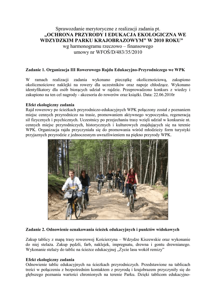 Sprawozdanie merytoryczne z realizacji zadania pt. „OCHRONA PRZYRODY I EDUKACJA EKOLOGICZNA WE WDZYDZKIM PARKU KRAJOBRAZOWYM” W 2010 ROKU” wg harmonogramu rzeczowo – finansowego umowy nr WFOŚ/D/483/35/2010 Zadanie 1. Organizacja III Rowerowego Rajdu Edukacyjno-Przyrodniczego we WPK W ramach realizacji zadania wykonano pieczątkę okolicznościową, zakupiono okolicznościowe naklejki na rowery dla uczestników oraz napoje chłodzące. Wykonano identyfikatory dla osób biorących udział w rajdzie. Przeprowadzono konkurs z wiedzy i zakupiono na ten cel nagrody - akcesoria do rowerów oraz książki. Data: 22.06.2010r Efekt ekologiczny zadania Rajd rowerowy po ścieżkach przyrodniczo-edukacyjnych WPK połączony został z poznaniem miejsc cennych przyrodniczo na trasie, promowaniem aktywnego wypoczynku, regeneracją sił fizycznych i psychicznych. Uczestnicy po przejechaniu trasy wzięli udział w konkursie nt. cennych miejsc przyrodniczych, historycznych i kulturowych znajdujących się na terenie WPK. Organizacja rajdu przyczyniała się do promowania wśród młodzieży form turystyki przyjaznych przyrodzie z jednoczesnym uwrażliwieniem na piękno przyrody WPK. Zadanie 2. Odnowienie oznakowania ścieżek edukacyjnych i punktów widokowych Zakup tablicy z mapą trasy rowerowej Kościerzyna – Wdzydze Kiszewskie oraz wykonanie do niej stelaża. Zakup pędzli, farb, naklejek, impregnatu, drewna i gontu drewnianego. Wykonanie stelaży do tablic na ścieżce edukacyjnej „Życie lasu wokół remizy” Efekt ekologiczny zadania Odnowienie tablic edukacyjnych na ścieżkach przyrodniczych. Przedstawione na tablicach treści w połączeniu z bezpośrednim kontaktem z przyrodą i krajobrazem przyczyniły się do głębszego poznania wartości chronionych na terenie Parku. Dzięki tablicom edukacyjno- informacyjnym osoby odwiedzający obszar parku mogły samodzielnie lub z przewodnikiem zapoznać się z cennymi elementami przyrody i krajobrazu danego obszaru chronionego. Zadanie 3. Remont kładki dydaktycznej na torfowisku „Żôbińsczich Błoto” Zakup drewna do remontu kładki dydaktycznej oraz robocizna (usługi ciesielskie). Efekt ekologiczny zadania Nowa kładka dydaktyczna umieszczona na terenie użytku ekologicznego „Żôbińsczich Błoto” pozwalała uczestnikom warsztatów terenowych na samodzielne poznawanie rzadkiego i cennego siedliska, jakim jest torfowisko przejściowe i wysokie, bez uszkadzania tego chronionego ekosystemu. Umożliwiała ona efektywne prowadzenie zajęć o tematyce związanej z badaniem i ochroną wód, rolą bioróżnorodności, poznawaniem specyficznych organizmów terenów podmokłych, czy form polodowcowych charakterystycznych dla Pomorza. Kładka ułatwiała także monitorowanie zmian zachodzącym na torfowisku, co może zapobiec degradacji torfowiska. Zadanie 4. Organizacja warsztatów, konkursów i wykładów 4.1. Poznaj ichtiofaunę Wdzydzkiego Parku Krajobrazowego „Rybobranie” Zakup nagród rzeczowych i książkowych na konkurs wiedzy o ichtiofaunie WPK. Zakup napoi chłodzących. Materiały, przybory papiernicze, druk kart pracy itp. Da Efekt ekologiczny zadania Warsztaty edukacyjne z ichtiofauny nad wodą kierowane były do młodzieży z terenu powiatu kościerskiego. W ramach warsztatów młodzież miała okazję nauczyć się rozpoznawania gatunków ryb występujących w naszych jeziorach oraz poznanie tematyki związanej z ichtiofauną jezior. Uczestników warsztatów zapoznano z zasadami regulaminu wędkarskiego połowu ryb i metodą „no kiling”. W tym celu WPK nawiązało współpracę z PZW i Państwową Strażą Rybacką Miejsce: Jezioro Drzędno. Przeprowadzono konkurs na temat ichtiofauny jezior WPK (m.in. endemicznej odmiany troci jeziorowej występującej w jeziorach wdzydzkich) utrwalający zdobytą wiedzę. 4.2. Powitanie wiosny na terenie Wdzydzkiego Parku Krajobrazowego pt. ”Jak przyroda budzi się do życia”. (Na stałe wpisane w kalendarz imprez ekologicznych, organizowana przez Park). Zajęcia i warsztaty na różnych stanowiskach ze specjalistami (wynagrodzenie): botanik, chiropterolog, entomolog, ornitolog, biolog, leśnicy. Materiały biurowe, karty pracy dla ucznia, scenariusze zajęć, materiały informacyjne, farby, folia do laminowania. Zakup nagród dla laureatów konkursów. Przewóz uczestników do Schodna. Efekt ekologiczny zadania Udział około 500 uczniów ze szkół podstawowych, gimnazjalnych i opiekunowie. Wszyscy uczestnicy wzięli udział w warsztatach przyrodniczych w terenie, gdzie przedstawiano zagadnienia związane m.in. z: wiosennymi roślinami chronionymi, ornitologią, entomologią, wiosennymi migracjami zwierząt i zagrożeniami, jakie niesie wiosenne wypalanie traw. Zajęcia prowadzili pracownicy WPK, specjaliści i leśnicy, którzy dzięki swoim kompetencjom przyczynili się do poszerzenia i uzupełnienia wiedzy szkolnej poprzez zajęcia w terenie. W celu ugruntowania i usystematyzowania wiedzy na temat wiosny w przyrodzie przeprowadzono konkursy, które przyczyniły się chęci poznania świata roślin i zwierząt. Warsztaty zostały wyróżnione przez Ministerstwo Środowiska w konkursie „Nietypowa lekcja różnorodności biologicznej.” 4.3. III Wdzydzkie Warsztaty Ekologiczne ekologicznych, organizowana przez Park). (Na stałe wpisane w kalendarz imprez Zakup tuszu do drukarki, folia do laminowania, materiały fotograficzne, art. papiernicze itp. Druk materiałów informacyjnych dotyczących warsztatów, badań wód i ich ochrony, kart pracy z uproszczonym kluczem do rozpoznawania org. wodnych. Zakupiono odczynniki chemiczne i sprzęt laboratoryjny potrzebny na warsztatach – badanie wód i siedlisk roślinnych i zwierzęcych. Opłacono specjalistów z dziedziny: entomologii, botaniki, leśnictwa i biochemicznej analizy wody. Zakup przewodników do oznaczania flory i fauny. Zakup potrzebnego sprzętu do przeprowadzenia badań (lupy, pojemniczki do pobierania próbek, si