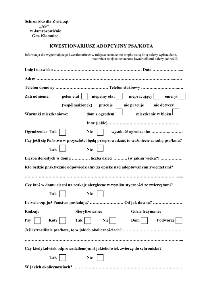 Kwestionariusz adopcyjny psa/kota - Schronisko dla Zwierząt "AS" w