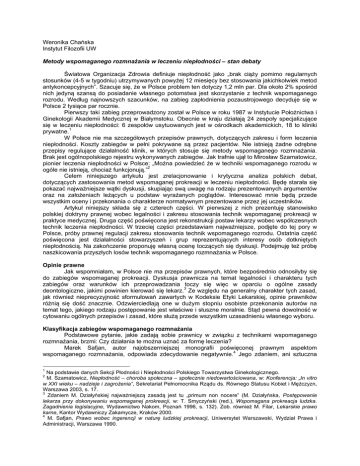 Weronika Chańska Instytut Filozofii UW Metody wspomaganego rozmnażania w leczeniu niepłodności – stan debaty Światowa Organizacja Zdrowia definiuje niepłodność jako „brak ciąży pomimo regularnych stosunków (4-5 w tygodniu) utrzymywanych powyżej 12 miesięcy bez stosowania jakichkolwiek metod antykoncepcyjnych”. Szacuje się, że w Polsce problem ten dotyczy 1,2 mln par. Dla około 2% spośród nich jedyną szansą do posiadanie własnego potomstwa jest skorzystanie z technik wspomaganego rozrodu. Według najnowszych szacunków, na zabieg zapłodnienia pozaustrojowego decyduje się w Polsce 2 tysiące par rocznie. Pierwszy taki zabieg przeprowadzony został w Polsce w roku 1987 w Instytucie Położnictwa i Ginekologii Akademii Medycznej w Białymstoku. Obecnie w kraju działają 24 zespoły specjalizujące się w leczeniu niepłodności: 6 zespołów usytuowanych jest w ośrodkach akademickich, 18 to kliniki prywatne.1 W Polsce nie ma szczegółowych przepisów prawnych, dotyczących zakresu i form leczenia niepłodności. Koszty zabiegów w pełni pokrywane są przez pacjentów. Nie istnieją żadne odrębne przepisy regulujące działalność klinik, w których stosuje się metody wspomaganego rozmnażania. Brak jest ogólnopolskiego rejestru wykonywanych zabiegów. Jak trafnie ujął to Mirosław Szamatowicz, pionier leczenia niepłodności w Polsce: „Można powiedzieć że w techniki wspomaganego rozrodu w ogóle nie istnieją, chociaż funkcjonują.”2 Celem niniejszego artykułu jest zrelacjonowanie i krytyczna analiza polskich debat, dotyczących zastosowania metod wspomaganej prokreacji w leczeniu niepłodności. Będę starała się pokazać najważniejsze wątki dyskusji, skupiając swą uwagę na rodzaju prezentowanych argumentów oraz na założeniach leżących u podstaw wyrażanych poglądów. Interesować mnie będą przede wszystkim oceny i przekonania o charakterze normatywnym prezentowane przez jej uczestników. Artykuł niniejszy składa się z czterech części. W pierwszej z nich prezentuję stanowisko polskiej doktryny prawnej wobec legalności i zakresu stosowania technik wspomaganej prokreacji w praktyce medycznej. Druga część poświęcona jest rekonstrukcji postaw lekarzy wobec współczesnych technik leczenia niepłodności. W trzeciej części przedstawiam najważniejsze, podjęte do tej pory w Polsce, próby prawnej regulacji zakresu stosowania technik wspomaganego rozrodu. Ostatnia część poświęcona jest działalności stowarzyszeń i grup reprezentujących interesy osób dotkniętych niepłodnością. Na zakończenie proponuję własną ocenę toczących się dyskusji. Podejmuję też próbę naszkicowania przyszłych losów technik wspomaganego rozmnażania w Polsce. Opinie prawne Jak wspomniałam, w Polsce nie ma przepisów prawnych, które bezpośrednio odnosiłyby się do zabiegów wspomaganej prokreacji. Dyskusja prawnicza na temat legalności i charakteru tych zabiegów oraz warunków ich przeprowadzania toczy się więc w oparciu o ogólne zasady deontologiczne, jakimi powinien kierować się lekarz.3 Ze względu na generalny charakter tych zasad, jak również nieprecyzyjność sformułowań zawartych w Kodeksie Etyki Lekarskiej, opinie prawników różnią się dość znacznie. Odzwierciedlają one w dużym stopniu osobiste przekonania autorów na temat tego, jakiego rodzaju postępowanie jest właściwe i słuszne moralnie. Stąd pewna dowolność w cytowaniu ogólnych przepisów i zasad, które służą przede wszystkim uzasadnieniu własnego wyboru. Klasyfikacja zabiegów wspomaganego rozmnażania Podstawowe pytanie, jakie zadają sobie prawnicy w związku z technikami wspomaganego rozmnażania, brzmi: Czy działania te można uznać za formę leczenia? Marek Safjan, autor najobszerniejszej monografii poświęconej prawnym aspektom wspomaganego rozmnażania, odpowiada zdecydowanie negatywnie.4 Jego zdaniem, ani sztuczna 1 Na podstawie danych Sekcji Płodności i Niepłodności Polskiego Towarzystwa Ginekologicznego. M. Szamatowicz, Niepłodność – choroba społeczna – społecznie niedowartościowana, w: Konferencja: „In vitro w XXI wieku – nadzieje i zagrożenia”, Sekretariat Pełnomocnika Rządu ds. Równego Statusu Kobiet i Mężczyzn, Warszawa 2003, s. 17. 3 Zdaniem M. Działyńskiej najważniejszą zasadą jest tu „primum non nocere” (M. Działyńska, Postępowanie lekarza przy dokonywaniu wspomaganej prokreacji, w: T. Smyczyński (red.), Wspomagana prokreacja ludzka. Zagadnienia legislacyjne, Wydawnictwo Nakom, Poznań 1996, s. 132). Zob. również M. Filar, Lekarskie prawo karne, Kantor Wydawniczy Zakamycze, Kraków 2000. 4 M. Safjan, Prawo wobec ingerencji w naturę ludzkiej prokreacji, Uniwersytet Warszawski, Wydział Prawa i Administracji, Warszawa 1990. 2 inseminacja, ani zapłodnienie pozaustrojowe nie są formami leczenia. Działania te nie usuwają choroby, a to jest – w opinii autora – kryterium zakwalifikowania danej procedury jako zabiegu leczniczego. Para, która skorzystała z technik wspomaganego rozmnażania w dalszym ciągu pozostaje bezpłodna, tj. niezdolna do samodzielnego poczęcia i wydania na świat potomka. Safjan krytycznie odnosi się do poglądów, iż wspomagana prokreacja ma cel terapeutyczny. „Chodziłoby tu – pisze autor – o sformułowanie swego rodzaju paliatywu terapii bezpłodności (bo przecież nie jest to leczenie jej przyczyn)”.5 Pogląd zaliczający techniki wspomaganego rozmnażania do zabiegów leczniczych, Safjan określa mianem „ideologii terapeutycznej”.6 Nieco odmienne stanowisko prezentuje Marian Filar.7 Jego zdaniem, klasyfikacja zabiegów wspomaganego rozmnażania uzależniona jest od celu, jakiemu działania te służą. Jeśli techniki te wykorzystywane są jako leczenie niepłodności, to mają charakter czynności leczniczych i podlegają odpowiednim przepisom dotyczącym tego rodzaju działań. Przez „czynność leczniczą” Filar