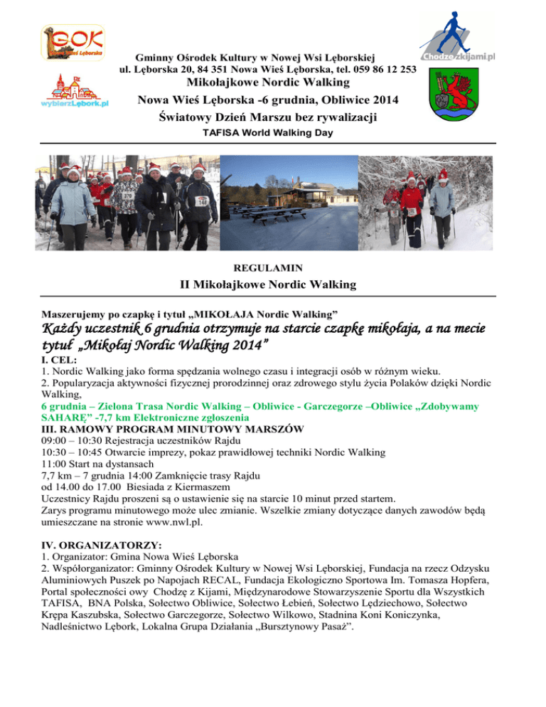 Gminny Ośrodek Kultury w Nowej Wsi Lęborskiej ul. Lęborska 20, 84 351 Nowa Wieś Lęborska, tel. 059 86 12 253 Mikołajkowe Nordic Walking Nowa Wieś Lęborska -6 grudnia, Obliwice 2014 Światowy Dzień Marszu bez rywalizacji TAFISA World Walking Day REGULAMIN II Mikołajkowe Nordic Walking Maszerujemy po czapkę i tytuł „MIKOŁAJA Nordic Walking” Każdy uczestnik 6 grudnia otrzymuje na starcie czapkę mikołaja, a na mecie tytuł „Mikołaj Nordic Walking 2014” I. CEL: 1. Nordic Walking jako forma spędzania wolnego czasu i integracji osób w różnym wieku. 2. Popularyzacja aktywności fizycznej prorodzinnej oraz zdrowego stylu życia Polaków dzięki Nordic Walking, 6 grudnia – Zielona Trasa Nordic Walking – Obliwice - Garczegorze –Obliwice „Zdobywamy SAHARĘ” -7,7 km Elektroniczne zgłoszenia III. RAMOWY PROGRAM MINUTOWY MARSZÓW 09:00 – 10:30 Rejestracja uczestników Rajdu 10:30 – 10:45 Otwarcie imprezy, pokaz prawidłowej techniki Nordic Walking 11:00 Start na dystansach 7,7 km – 7 grudnia 14:00 Zamknięcie trasy Rajdu od 14.00 do 17.00 Biesiada z Kiermaszem Uczestnicy Rajdu proszeni są o ustawienie się na starcie 10 minut przed startem. Zarys programu minutowego może ulec zmianie. Wszelkie zmiany dotyczące danych zawodów będą umieszczane na stronie www.nwl.pl. IV. ORGANIZATORZY: 1. Organizator: Gmina Nowa Wieś Lęborska 2. Współorganizator: Gminny Ośrodek Kultury w Nowej Wsi Lęborskiej, Fundacja na rzecz Odzysku Aluminiowych Puszek po Napojach RECAL, Fundacja Ekologiczno Sportowa Im. Tomasza Hopfera, Portal społeczności owy Chodzę z Kijami, Międzynarodowe Stowarzyszenie Sportu dla Wszystkich TAFISA, BNA Polska, Sołectwo Obliwice, Sołectwo Łebień, Sołectwo Lędziechowo, Sołectwo Krępa Kaszubska, Sołectwo Garczegorze, Sołectwo Wilkowo, Stadnina Koni Koniczynka, Nadleśnictwo Lębork, Lokalna Grupa Działania „Bursztynowy Pasaż”. V. DYSTANS 1. Uczestnicy idą na dystansie: 7,7 km. VI. ZGŁOSZENIA DO MARSZÓW BEZ OPŁATY STARTOWEJ 1. Rejestracja osobista w Biurze Rajdu Stanica Turystyczna Obliwice w dniu Rajdu: 9.00 -10.30. 6 grudnia – Zielona Trasa Nordic Walking – Obliwice - Garczegorze –Obliwice „Zdobywamy SAHARĘ” -7,7 km Elektroniczne zgłoszenia: na Chodzę z kijami 2. Uczestnicy Rajdów dokonując rejestracji i startując w zawodach oświadczają, że biorą w nich udział na własną odpowiedzialność wyrażają zgodę na wykorzystanie wizerunku do celów promocji na zdjęciach i filmach wykonanych podczas imprez. 3. Rejestracja traktowana jest jako przyjęcie warunków Regulaminu 4. Uczestnictwo w imprezie jest nieodpłatne 5. Uczestnik Rajdu otrzyma nieodpłatnie numer startowy + 4 agrafki, ważny przez trzy imprezy. 6. Uczestnik Rajdu otrzymają posiłek regeneracyjny w postaci parowanego lub pieczonego ziemniaka oraz napoje na trasach Nordic Walking w Stanicach Turystycznych. 6. Weryfikacja zawodników oraz wydawanie numerów startowych będą odbywały się w Biurze Rajdu w dniu imprezy. VII. ZASADY UCZESTNICTWA I TECHNIKA MARSZU 1. Podczas imprezy obowiązują przepisy zawodów Polskiej Federacji Nordic Walking. 2. Idziemy bez pomiaru czasu dla własnej satysfakcji. 3. Osoby niepełnosprawne startujące na dłuższych dystansach są klasyfikowane z innymi kategoriami. 4. Wszyscy uczestnicy muszą zostać zweryfikowani (z dowodem tożsamości ze zdjęciem, a osoby niepełnosprawne również z orzeczeniem o niepełnosprawności) w Biurze Rajdu. 5. Osoby startujące w Rajdzie zobowiązane są posiadać zaświadczenie od lekarza o braku przeciwwskazań do wysiłku fizycznego oraz podpisać w biurze zawodów stosowne oświadczenie o braku przeciwwskazań do wysiłku fizycznego w zawodach NW. W szczególnych przypadkach wymagających badania medycznego decyzja obsługi medycznej zawodów przed i w czasie zawodów jest ostateczna. 6. W zawodach mogą brać udział obywatele wszystkich krajów świata. 7. Każdy uczestnik zobowiązany jest posiadać strój sportowy stosowny do warunków pogodowych. Zaleca się posiadanie własnych kijów do NW. Posiadanie kijów składanych wymaga od uczestnika zwrócenia uwagi na dokładne dokręcenie części składowych kija, jak również uwzględnienie podczas treningu, rozgrzewki oraz zawodów faktu, iż kij składany jest mniej wytrzymały niż kij jednoczęściowy. 8. Podczas marszu wszyscy uczestnicy muszą mieć numery startowe przymocowane do koszulek sportowych na klatce piersiowej. Zasłanianie numeru startowego w części lub w całości lub jego modyfikacja jest zabroniona pod karą dyskwalifikacji. Nie można używać własnych numerów startowych. 9 Zawodnicy zobowiązani są zwrócić szczególną uwagę na bezpieczeństwo podczas rozgrzewki, aby nie uderzyć lub nie ukłuć kijkiem współćwiczącego. VIII. NAGRODY 1. Ogłoszenie wyników, przyznanie i odbiór okolicznościowych upominków odbędzie się w dniu zawodów. IX. TRASA 1. Na trasie znajduje się punkt pomocy medycznej. W przypadku kontuzji uczestnika, powiadamiana jest obsługa trasy, która przekazuje informacje do punktu pomocy medycznej. 2. Plan trasy i lista startowa będzie znajdować się w biurze zawodów. 3. Trasa będzie oznaczona specjalnymi znacznikami. 4. Punkty odświeżania będą wyposażone w wodę . X. SZATNIE I DEPOZYT 1. Istnieje możliwość skorzystania z depozytu za okazaniem numeru startowego. 2. Organizator nie ponosi odpowiedzialności za zdeponowane przez zawodnika rzeczy. Depozyt można odebrać tylko na podstawie numeru startowego. W przypadku zgubienia przez zawodnika numeru startowego, Organizator jest zwolniony z odpowiedzialności za przekazanie depozytu innej osobie. 3. Za pozostawione bez opieki rzeczy organizator nie ponosi odpowiedzialności. 4. Przed i po zawodach uczestnicy będą mieli możliwość skorzystania z przebieralni ( np. namiot bądź inne pomieszczenie) XII. UBEZPIECZENIE 1. Organizator posiada ubezpieczenie OC zawodów. 2. Organizator nie zapewni