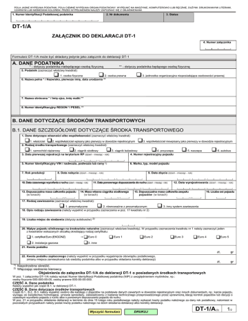 POLA JASNE WYPEŁNIA PODATNIK, POLA CIEMNE WYPEŁNIA ORGAN PODATKOWY. WYPEŁNIĆ NA MASZYNIE, KOMPUTEROWO LUB RĘCZNIE, DUŻYMI. DRUKOWANYMI LITERAMI, CZARNYM LUB NIEBIESKIM KOLOREM. PRZED WYPEŁNIENIEM NALEŻY ZAPOZNAĆ SIĘ Z OBJAŚNIENIAMI. 1. Numer Identyfikacji Podatkowej podatnika 2. Nr dokumentu 3. Status DT-1/A ZAŁĄCZNIK DO DEKLARACJI DT-1 4. Numer załącznika Formularz DT-1/A może być składany jedynie jako załącznik do deklaracji DT-1 A. DANE PODATNIKA * - dotyczy podatnika niebędącego osobą fizyczną ** - dotyczy podatnika będącego osobą fizyczną 5. Podatnik (zaznaczyć właściwy kwadrat): 1. osoba fizyczna 2. osoba prawna 6. Nazwa pełna * / Nazwisko, pierwsze imię, data urodzenia ** 3. jednostka organizacyjna nieposiadająca osobowości prawnej 7. Nazwa skrócona * / Imię ojca, imię matki ** 8. Numer identyfikacyjny REGON */ PESEL ** B. DANE DOTYCZĄCE ŚRODKÓW TRANSPORTOWYCH B.1. DANE SZCZEGÓŁOWE DOTYCZĄCE ŚRODKA TRANSPORTOWEGO 1. Dane dotyczące własności albo współwłasności (zaznaczyć właściwy kwadrat): 1. właściciel 2. współwłaściciel wpisany jako pierwszy w dowodzie rejestracyjnym 2. Rodzaj środka transportowego (zaznaczyć właściwy kwadrat): 3. współwłaściciel niewpisany jako pierwszy w dowodzie rejestracyjnym 1. samochód ciężarowy 2. ciągnik siodłowy 3. ciągnik balastowy 4. przyczepa 4. Numer rejestracyjny pojazdu 3. Data pierwszej rejestracji na terytorium RP (dzień - miesiąc - rok) 5. Numer Identyfikacyjny VIN / nadwozia, podwozia lub ramy 1) 7. Rok produkcji 13. Dopuszczalna masa całkowita pojazdu (w tonach) , 6. autobus 6. Marka, typ, model pojazdu 8. Data nabycia (dzień - miesiąc - rok) 10. Data czasowego wycofania z ruchu (dzień - miesiąc - rok) 5. naczepa 9. Data zbycia (dzień - miesiąc - rok) 11. Data ponownego dopuszczenia do ruchu (dzień - miesiąc - rok) 14. Masa własna ciągnika siodłowego (w tonach) , 12. Data wyrejestrowania (dzień - miesiąc - rok) 15. Dopuszczalna masa całkowita zespołu pojazdów (w tonach) 16. Liczba osi pojazdu , 17. Rodzaj zawieszenia (zaznaczyć właściwy kwadrat): 1. pneumatyczne 2. równoważne z pneumatycznym 18. Opis rodzaju zawieszenia (należy wypełnić w przypadku zaznaczenia w poz. 17 kwadratu nr 2) 3. inny system zawieszenia 19. Liczba miejsc do siedzenia (dotyczy autobusów) 2) 20. Wpływ pojazdu silnikowego na środowisko naturalne (zaznaczyć właściwe kwadraty). W przypadku zaznaczenia kwadratu nr 1 należy zaznaczyć jeden z kwadratów wskazanych strzałką określający rodzaj certyfikatu: 1. certyfikat Euro (EKGONZ) Euro 0 2. instalacja gazowa 3. inne Euro 1 Euro 2 Euro 3 Euro 4 Euro 5 21. Kwota podatku 22. Kwota podatku zapłaconego (należy wypełnić w przypadku wygaśnięcia obowiązku podatkowego, zmiany miejsca zamieszkania lub siedziby podatnika albo w przypadku składania korekty deklaracji) 1) 2) zł, gr zł, gr Niepotrzebne skreślić. Włączając siedzenie kierowcy. Objaśnienia do załącznika DT-1/A do deklaracji DT-1 o posiadanych środkach transportowych W poz. 1 załącznika DT-1/A należy wpisać Numer Identyfikacji Podatkowej podatnika (NIP) z uwzględnieniem myślników, np.: osoby fizyczne 000-000-00-00, osoby prawne 000-00-00-000. CZĘŚĆ A. Dane podatnika Należy wypełnić jak część B.1. w deklaracji DT-1. CZĘŚĆ B. Dane dotyczące środków transportowych Część B.1., B.2., B.3. należy wypełnić osobno dla każdego z pojazdów na podstawie danych zawartych w dowodzie rejestracyjnym oraz innych dokumentach, np.: karcie pojazdu, wyciągu ze świadectwa homologacji, umowie sprzedaży, zaświadczeniu z badania technicznego przeprowadzonego przez uprawnioną stację kontroli pojazdów lub decyzji o czasowym wycofaniu pojazdu z ruchu albo o ponownym dopuszczeniu pojazdu do ruchu. W poz. 21 w przypadku składania deklaracji w terminie do dnia 15 lutego roku podatkowego należy wykazać kwoty podatku należnego za dany rok podatkowy, natomiast w pozostałych przypadkach należy podać kwoty podatku należnego na dzień składania deklaracji albo korekty deklaracji. Wyczyść formularz DRUKUJ DT-1/A (3) 1/2 POLA JASNE WYPEŁNIA PODATNIK, POLA CIEMNE WYPEŁNIA ORGAN PODATKOWY. WYPEŁNIĆ NA MASZYNIE, KOMPUTEROWO LUB RĘCZNIE, DUŻYMI, DRUKOWANYMI LITERAMI, CZARNYM LUB NIEBIESKIM KOLOREM. PRZED WYPEŁNIENIEM NALEŻY ZAPOZNAĆ SIĘ Z OBJAŚNIENIAMI. B.2. DANE SZCZEGÓŁOWE DOTYCZĄCE ŚRODKA TRANSPORTOWEGO 1. Dane dotyczące własności albo współwłasności (zaznaczyć właściwy kwadrat): 1. właściciel 2. współwłaściciel wpisany jako pierwszy w dowodzie rejestracyjnym 2. Rodzaj środka transportowego (zaznaczyć właściwy kwadrat): 3. współwłaściciel niewpisany jako pierwszy w dowodzie rejestracyjnym 1. samochód ciężarowy 2. ciągnik siodłowy 3. ciągnik balastowy 4. przyczepa 3. Data pierwszej rejestracji na terytorium RP (dzień - miesiąc - rok) 4. Numer rejestracyjny pojazdu 5. Numer Identyfikacyjny VIN / nadwozia, podwozia lub ramy 1) 10. Data czasowego wycofania z ruchu (dzień - miesiąc - rok) 13. Dopuszczalna masa całkowita pojazdu (w tonach) , 6. autobus 6. Marka, typ, model pojazdu 8. Data nabycia (dzień - miesiąc - rok) 7. Rok produkcji 5. naczepa 9. Data zbycia (dzień - miesiąc - rok) 11. Data ponownego dopuszczenia do ruchu (dzień - miesiąc - rok) 14. Masa własna ciągnika siodłowego (w tonach) 12. Data wyrejestrowania (dzień - miesiąc - rok) 15. Dopuszczalna masa całkowita zespołu pojazdów (w tonach) , 16. Liczba osi pojazdu , 17. Rodzaj zawieszenia (zaznaczyć właściwy kwadrat): 1. pneumatyczne 2. równoważne z pneumatycznym 18. Opis rodzaju zawieszenia (należy wypełnić w przypadku zaznaczenia w poz. 17 kwadratu nr 2) 3. inny system zawieszenia 19. Liczba miejsc do siedzenia (dotyczy autobusów) 2) 20. Wpływ pojazdu silnikowego na środowisko naturalne (zaznaczyć właściwe kwadraty). W przypadku zaznaczenia kwadratu nr 1 należy zaznaczyć jeden z kwadratów wskazanych