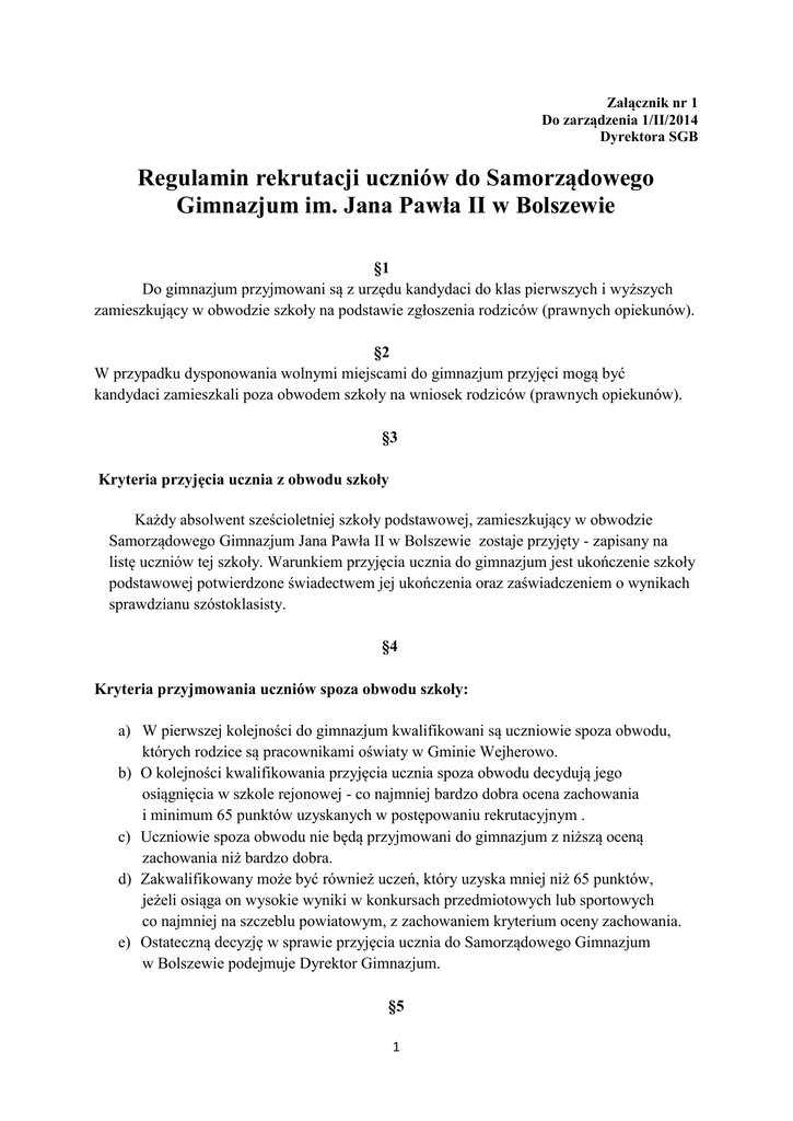 Załącznik nr 1 Do zarządzenia 1/II/2014 Dyrektora SGB Regulamin rekrutacji uczniów do Samorządowego Gimnazjum im. Jana Pawła II w Bolszewie §1 Do gimnazjum przyjmowani są z urzędu kandydaci do klas pierwszych i wyższych zamieszkujący w obwodzie szkoły na podstawie zgłoszenia rodziców (prawnych opiekunów). §2 W przypadku dysponowania wolnymi miejscami do gimnazjum przyjęci mogą być kandydaci zamieszkali poza obwodem szkoły na wniosek rodziców (prawnych opiekunów). §3 Kryteria przyjęcia ucznia z obwodu szkoły Każdy absolwent sześcioletniej szkoły podstawowej, zamieszkujący w obwodzie Samorządowego Gimnazjum Jana Pawła II w Bolszewie zostaje przyjęty - zapisany na listę uczniów tej szkoły. Warunkiem przyjęcia ucznia do gimnazjum jest ukończenie szkoły podstawowej potwierdzone świadectwem jej ukończenia oraz zaświadczeniem o wynikach sprawdzianu szóstoklasisty. §4 Kryteria przyjmowania uczniów spoza obwodu szkoły: a) W pierwszej kolejności do gimnazjum kwalifikowani są uczniowie spoza obwodu, których rodzice są pracownikami oświaty w Gminie Wejherowo. b) O kolejności kwalifikowania przyjęcia ucznia spoza obwodu decydują jego osiągnięcia w szkole rejonowej - co najmniej bardzo dobra ocena zachowania i minimum 65 punktów uzyskanych w postępowaniu rekrutacyjnym . c) Uczniowie spoza obwodu nie będą przyjmowani do gimnazjum z niższą oceną zachowania niż bardzo dobra. d) Zakwalifikowany może być również uczeń, który uzyska mniej niż 65 punktów, jeżeli osiąga on wysokie wyniki w konkursach przedmiotowych lub sportowych co najmniej na szczeblu powiatowym, z zachowaniem kryterium oceny zachowania. e) Ostateczną decyzję w sprawie przyjęcia ucznia do Samorządowego Gimnazjum w Bolszewie podejmuje Dyrektor Gimnazjum. §5 1 W przypadku zgłoszeń uczniów spoza obwodu szkoły Dyrektor powołuje Komisję Rekrutacyjną której skład, tryb i ramowy porządek obrad określone są w Regulaminie jej pracy, stanowiącym odrębny dokument szkoły. Zadania szkolnej Komisji Rekrutacyjnej Do zadań szkolnej Komisji Rekrutacyjnej należy: przeprowadzenie postępowania rekrutacyjnego zgodnie z przepisami prawa oświatowego na podstawie dokumentów i w terminach określonych przez Pomorskiego Kuratora Oświaty oraz określonych kryteriów zawartych w Statucie szkoły; ustalenie listy uczniów zakwalifikowanych do przyjęcia do gimnazjum; przyjęcie kandydata do szkoły, jeśli w wyniku postępowania rekrutacyjnego został zakwalifikowany i złożył wymagane dokumenty; podanie do publicznej wiadomości listy przyjętych i nieprzyjętych, zawierającej imiona i nazwiska kandydatów uszeregowane alfabetycznie. §6 Tryb odwoławczy od postanowień Komisji: W terminie 7 dni od dnia podania do publicznej wiadomości listy kandydatów przyjętych i kandydatów nieprzyjętych, rodzic kandydata może wystąpić do Komisji Rekrutacyjnej z wnioskiem o sporządzenie uzasadnienia odmowy przyjęcia kandydata do szkoły. Uzasadnienie odmowy przyjęcia Komisja Rekrutacyjna sporządza w terminie 5 dni roboczych od dnia wystąpienia przez rodzica kandydata. Uzasadnienie zawiera przyczyny odmowy przyjęcia w wyniku postępowania rekrutacyjnego. Rodzic kandydata może wnieść do dyrektora szkoły odwołanie od rozstrzygnięcia komisji rekrutacyjnej, w terminie 7 dni od dnia otrzymania uzasadnienia. Dyrektor szkoły rozpatruje odwołanie od rozstrzygnięcia Komisji Rekrutacyjnej w terminie 7 dni od dnia otrzymania odwołania. Od rozstrzygnięcia dyrektora szkoły przysługuje odwołanie do sądu administracyjnego. 2 §7 Wymagane dokumenty Kandydaci z obwodu Gimnazjum: Oryginał: świadectwa ukończenia szkoły podstawowej; zaświadczenia o wyniku sprawdzianu przeprowadzonego w ostatnim roku nauki; karta zdrowia; jedną aktualną fotografie do legitymacji szkolnej; wypełnioną kartę zapisu (podanie) do Gimnazjum. Kandydaci spoza obwodu składają do celów rekrutacji następujące dokumenty: 1. Podanie rodziców (prawnych opiekunów) skierowane do Dyrektora Gimnazjum. 2. Oryginał: świadectwa ukończenia szkoły podstawowej; zaświadczenia o wyniku sprawdzianu; karta zdrowia; jedną aktualną fotografie do legitymacji szkolnej; wypełnioną kartę zapisu (podanie) do Gimnazjum. §9 Szczegółowe zasady przebiegu rekrutacji do szkoły uregulowane są w §26 Rozdziału VI Statutu Szkoły. 3