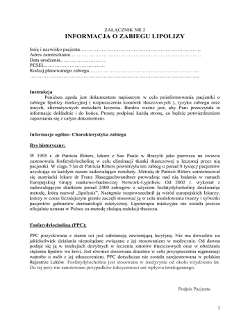 ZAŁĄCZNIK NR 2 INFORMACJA O ZABIEGU LIPOLIZY Imię i nazwisko pacjenta……………………………………………………………… Adres zamieszkania…………………………………………………………………… Data urodzenia……………………… PESEL……………………………… Rodzaj planowanego zabiegu………………………………………………………… ………………………………………………………………………………………... Instrukcja Poniższa zgoda jest dokumentem napisanym w celu poinformowania pacjentki o zabiegu lipolizy iniekcyjnej ( rozpuszczenia komórek tłuszczowych ), ryzyku zabiegu oraz innych, alternatywnych metodach leczenia. Bardzo ważne jest, aby Pani przeczytała te informacje dokładnie i do końca. Proszę podpisać każdą stronę, co będzie potwierdzeniem zapoznania się z całym dokumentem. Informacje ogólne- Charakterystyka zabiegu Rys historyczny: W 1995 r. dr Patricia Ritters, lekarz z Sao Paulo w Brazylii jako pierwsza na świecie zastosowała fosfatydylocholinę w celu eliminacji tkanki tłuszczowej u leczonej przez nią pacjentki. W ciągu 5 lat dr Patricia Ritters powtórzyła ten zabieg u ponad 8 tysięcy pacjentów uzyskując za każdym razem zadowalające rezultaty. Metodą dr Patricii Ritters zainteresował się austriacki lekarz dr Franz Haseggschwandtner prowadząc nad nią badania w ramach Europejskiej Grupy naukowo-badawczej Network-Lypolisis. Od 2002 r. wykonał z zadowalającym skutkiem ponad 2400 zabiegów z użyciem fosfatydylocholiny doskonaląc metodę, którą nazwał „lipolysis”. Następnie rozpowszechnił ją wśród europejskich lekarzy, którzy w coraz liczniejszym gronie zaczęli stosować ją w celu modelowania twarzy i sylwetki pacjentów gabinetów dermatologii estetycznej. Lipoterapia iniekcyjna nie została jeszcze oficjalnie uznana w Polsce za metodę służącą redukcji tłuszczu. Fosfatydylocholina (PPC): PPC pozyskiwana z ziaren soi jest substancją zawierającą lecytynę. Nie ma dowodów na jakiekolwiek działania niepożądane związane z jej stosowaniem w medycynie. Od dawna podaje się ją w iniekcjach dożylnych w leczeniu zatorów tłuszczowych oraz w obniżaniu stężenia lipidów we krwi. Jest również stosowana doustnie w celu przyspieszenia regeneracji wątroby u osób z jej stłuszczeniem. PPC dotychczas nie została zarejestrowana w polskim Rejestrze Leków. Fosfatydylocholina jest stosowana w medycynie od około trzydziestu lat. Do tej pory nie zanotowano przypadków toksycznosci ani wpływu teratogennego. Podpis Pacjenta 1 Metoda Lipoterapii iniekcyjnej: Patricia Ritters i Franz Haseggschwandtner udowodnili, że stosowana przez nich Lipoterapia iniekcyjna może stanowić konkurencyjną alternatywę wobec dotychczas stosowanej chirurgicznej metody liposukcji (odsysania) tłuszczu dla szerokiego grona pacjentów odczuwających dyskomfort wynikający z nadmiaru tkanki tłuszczowej. Lipoterapia iniekcyjna pozwala na eliminację małych, miejscowych nagromadzeń tłuszczu na twarzy i w innych rejonach ciała (brzuch, pośladki) a także znajduje zastosowanie w leczeniu tłuszczaków. Stosuje się ją u pacjentów, którzy nie chcą lub nie mogą poddać się zabiegowi chirurgicznemu. PPC jest wstrzykiwana w ściśle ustalonej przez lekarza dawce bezpośrednio do tkanki tłuszczowej. Znieczulenie z reguły nie jest konieczne. Nie uszkadza błon komórkowych, tylko rozpuszcza nagromadzony w komórkach tłuszcz. – Tłuszcz jest usuwany z ciała naczyniami limfatycznymi, przechodzi przez wątrobę i zostaje wydalony z kałem. Nie dostaje się natomiast bezpośrednio do krwi Zjawisko przedawkowania lub intoksykacji PPC nie jest znane. Okres pomiędzy zabiegami zależy od cech osobniczych pacjenta i miejsca (regionu) zabiegu i wynosi od 6 do 8 tygodni. Podobnie jest z liczbą zabiegów, które trzeba będzie wykonać. Zazwyczaj jest to od 2 do 5 sesji leczenia. U 2% pacjentów nie uzyskuje się odpowiedzi na PPC. Podkreślić trzeba, że lipoliza nie jest metodą odchudzania całego ciała, ale jedynie delikatnie działającym zabiegiem modelującym wybrane, niewielkie obszary. Zabiegi przynoszą najlepsze efekty u osób szczupłych i z niewielkimi otłuszczeniami. Osoby z dużą nadwagą prawdopodobnie nie przejdą kwalifikacji do tego zabiegu, zaproponujemy wtedy inne rodzaje terapii, prowadzące do utraty masy ciała. Organizm posiada zdolność ponownego wchłaniania tłuszczu, uwolnionego z adypocytów, czyli komórek tłuszczowych w wyniku wykonanego zabiegu. Proces ten występuje przez wiele dni po zabiegu z różnym nasileniem i możemy wpływać by ograniczyć go do minimum. Podczas konsultacji przed zabiegiem ustalamy indywidualne zalecenia zabezpieczające przed tym zjawiskiem. Zabieg lipolizy nie jest zarejestrowany jako metoda redukcji tkanki tłuszczowej, a stosowanie tej terapii określa się jako “off-label use”, czyli zastosowanie leku poza zarejestrowanymi wskazaniami, na życzenie i ze świadomą zgodą pacjenta. Lipoliza a liposukcja Lipoliza nie zastępuje liposukcji, ale jest dla niej wartościową alternatywą. Jest zabiegiem znacznie łagodniejszym, wyróżnia się nieoperacyjnym postępowaniem, znacznie mniejszą urazowością dla organizmu i nie wyłącza pacjenta z codziennego funkcjonowania. Unikamy także znieczulenia. Zdecydowanie bardziej widoczne efekty przyniesie natomiast operacyjna liposukcja - chirurgiczna procedura polegająca na operacyjnym odessaniu tkanki tłuszczowej. Obie terapie można stosować łącznie, celem pogłębienia i udoskonalenia efektu estetycznego. Podpis Pacjenta 2 Wskazania do lipolizy 1. 2. 3. 4. 5. Ginekomastia Podbródek Tłuszczaki Sylwetka gynoidalna Występowanie miejscowych otłuszczeń, przez odchudzanie bądź aktywność fizyczną, 6. brak możliwości wykonania liposukcji nie poddających się redukcji Bezwzględne przeciwwskazania: 1. 2. 3. 4. 5. 6. 