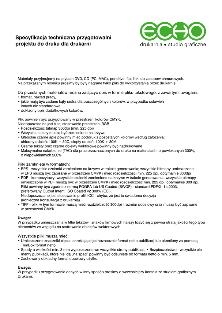 Specyfikacja techniczna przygotowalni projektu do druku dla drukarni