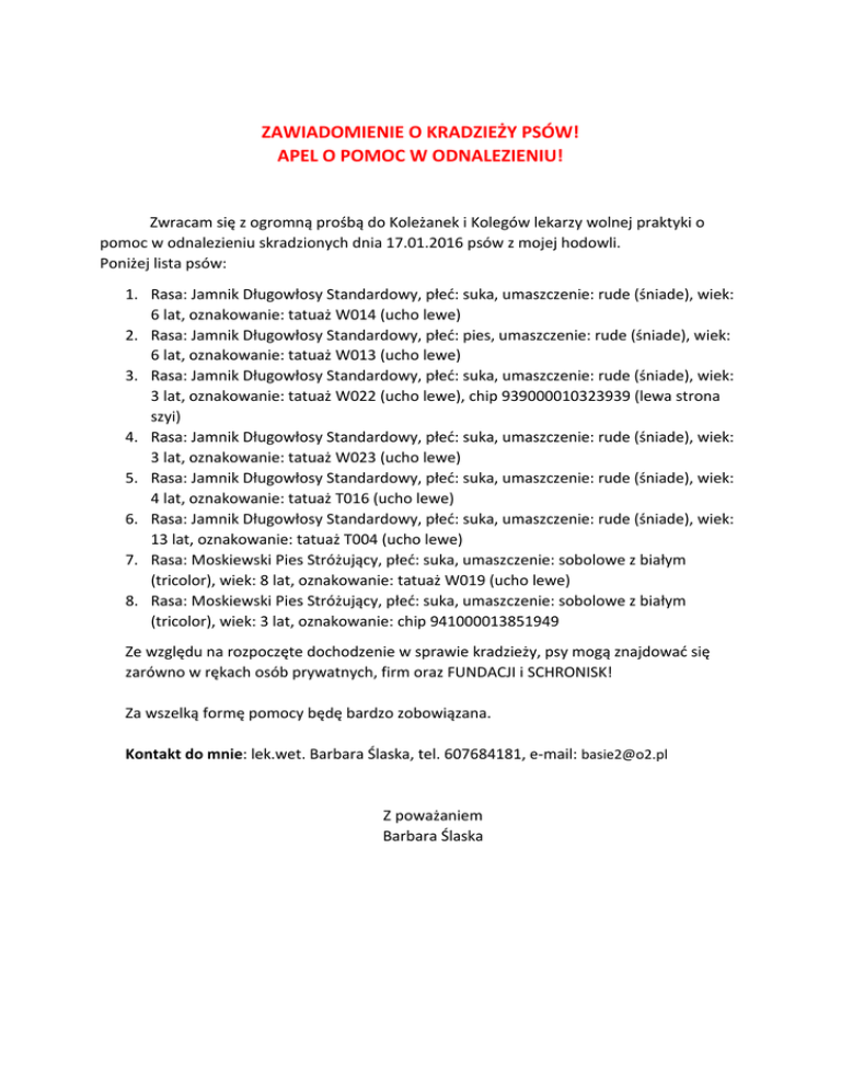 ZAWIADOMIENIE O KRADZIEŻY PSÓW! APEL O POMOC W ODNALEZIENIU! Zwracam się z ogromną prośbą do Koleżanek i Kolegów lekarzy wolnej praktyki o pomoc w odnalezieniu skradzionych dnia 17.01.2016 psów z mojej hodowli. Poniżej lista psów: 1. Rasa: Jamnik Długowłosy Standardowy, płeć: suka, umaszczenie: rude (śniade), wiek: 6 lat, oznakowanie: tatuaż W014 (ucho lewe) 2. Rasa: Jamnik Długowłosy Standardowy, płeć: pies, umaszczenie: rude (śniade), wiek: 6 lat, oznakowanie: tatuaż W013 (ucho lewe) 3. Rasa: Jamnik Długowłosy Standardowy, płeć: suka, umaszczenie: rude (śniade), wiek: 3 lat, oznakowanie: tatuaż W022 (ucho lewe), chip 939000010323939 (lewa strona szyi) 4. Rasa: Jamnik Długowłosy Standardowy, płeć: suka, umaszczenie: rude (śniade), wiek: 3 lat, oznakowanie: tatuaż W023 (ucho lewe) 5. Rasa: Jamnik Długowłosy Standardowy, płeć: suka, umaszczenie: rude (śniade), wiek: 4 lat, oznakowanie: tatuaż T016 (ucho lewe) 6. Rasa: Jamnik Długowłosy Standardowy, płeć: suka, umaszczenie: rude (śniade), wiek: 13 lat, oznakowanie: tatuaż T004 (ucho lewe) 7. Rasa: Moskiewski Pies Stróżujący, płeć: suka, umaszczenie: sobolowe z białym (tricolor), wiek: 8 lat, oznakowanie: tatuaż W019 (ucho lewe) 8. Rasa: Moskiewski Pies Stróżujący, płeć: suka, umaszczenie: sobolowe z białym (tricolor), wiek: 3 lat, oznakowanie: chip 941000013851949 Ze względu na rozpoczęte dochodzenie w sprawie kradzieży, psy mogą znajdować się zarówno w rękach osób prywatnych, firm oraz FUNDACJI i SCHRONISK! Za wszelką formę pomocy będę bardzo zobowiązana. Kontakt do mnie: lek.wet. Barbara Ślaska, tel. 607684181, e-mail: [email protected] Z poważaniem Barbara Ślaska