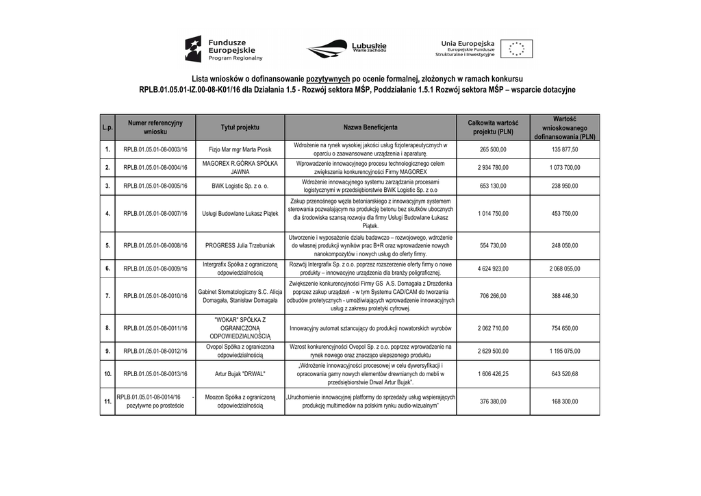 Lista wniosków o dofinansowanie pozytywnych po ocenie formalnej, złożonych w ramach konkursu RPLB.01.05.01-IZ.00-08-K01/16 dla Działania 1.5 - Rozwój sektora MŚP, Poddziałanie 1.5.1 Rozwój sektora MŚP – wsparcie dotacyjne L.p. Numer referencyjny wniosku Tytuł projektu Nazwa Beneficjenta Całkowita wartość projektu (PLN) Wartość wnioskowanego dofinansowania (PLN) 1. RPLB.01.05.01-08-0003/16 Fizjo Mar mgr Marta Piosik Wdrożenie na rynek wysokiej jakości usług fizjoterapeutycznych w oparciu o zaawansowane urządzenia i aparaturę. 265 500,00 135 877,50 2. RPLB.01.05.01-08-0004/16 MAGOREX R.GÓRKA SPÓŁKA JAWNA Wprowadzenie innowacyjnego procesu technologicznego celem zwiększenia konkurencyjności Firmy MAGOREX 2 934 780,00 1 073 700,00 3. RPLB.01.05.01-08-0005/16 BWK Logistic Sp. z o. o. Wdrożenie innowacyjnego systemu zarządzania procesami logistycznymi w przedsiębiorstwie BWK Logistic Sp. z o.o 653 130,00 238 950,00 1 014 750,00 453 750,00 4. RPLB.01.05.01-08-0007/16 Usługi Budowlane Łukasz Piątek Zakup przenośnego węzła betoniarskiego z innowacyjnym systemem sterowania pozwalającym na produkcję betonu bez skutków ubocznych dla środowiska szansą rozwoju dla firmy Usługi Budowlane Łukasz Piątek. 5. RPLB.01.05.01-08-0008/16 PROGRESS Julia Trzebuniak Utworzenie i wyposażenie działu badawczo – rozwojowego, wdrożenie do własnej produkcji wyników prac B+R oraz wprowadzenie nowych nanokompozytów i nowych usług do oferty firmy. 554 730,00 248 050,00 6. RPLB.01.05.01-08-0009/16 Intergrafix Spółka z ograniczoną odpowiedzialnością Rozwój Intergrafix Sp. z o.o. poprzez rozszerzenie oferty firmy o nowe produkty – innowacyjne urządzenia dla branży poligraficznej. 4 624 923,00 2 068 055,00 706 266,00 388 446,30 Zwiększenie konkurencyjności Firmy GS A.S. Domagała z Drezdenka Gabinet Stomatologiczny S.C. Alicja poprzez zakup urządzeń - w tym Systemu CAD/CAM do tworzenia Domagała, Stanisław Domagała odbudów protetycznych - umożliwiających wprowadzenie innowacyjnych usług z zakresu protetyki cyfrowej. 7. RPLB.01.05.01-08-0010/16 8. RPLB.01.05.01-08-0011/16 "WOKAR" SPÓŁKA Z OGRANICZONĄ ODPOWIEDZIALNOŚCIĄ Innowacyjny automat sztancujący do produkcji nowatorskich wyrobów 2 062 710,00 754 650,00 9. RPLB.01.05.01-08-0012/16 Ovopol Spółka z ograniczona odpowiedzialnością Wzrost konkurencyjności Ovopol Sp. z o.o. poprzez wprowadzenie na rynek nowego oraz znacząco ulepszonego produktu 2 629 500,00 1 195 075,00 10. RPLB.01.05.01-08-0013/16 Artur Bujak "DRWAL" „Wdrożenie innowacyjności procesowej w celu dywersyfikacji i opracowania gamy nowych elementów drewnianych do mebli w przedsiębiorstwie Drwal Artur Bujak”. 1 606 426,25 643 520,68 Moozon Spółka z ograniczoną odpowiedzialnością „Uruchomienie innowacyjnej platformy do sprzedaży usług wspierających produkcję multimediów na polskim rynku audio-wizualnym” 376 380,00 168 300,00 11. RPLB.01.05.01-08-0014/16 pozytywne po prosteście - 12. RPLB.01.05.01-08-0016/16 Przedsiębiorstwo ProdukcyjnoUsługowo-Handlowe "KOMA" Spółka z ograniczoną odpowiedzialnością Wdrożenie innowacji produktowej w PPUH „KOMA” Sp. z o.o. 735 139,50 328 720,90 13. RPLB.01.05.01-08-0017/16 ANDRZEJ MEDYCKI Nowa generacja materiałooszczędnych, aerodynamicznych i uniwersalnych osłon dedykowanych do zaawansowanych zabudów samochodowych 3 646 560,00 1 657 825,00 14. RPLB.01.05.01-08-0018/16 KDVmobile Sp. z o.o. Uruchomienie produkcji unikalnego w skali globalnej ogniwa fotowoltaicznego NanoSolar i wdrożenie nowych usług w oparciu o innowacyjne technologie 12 293 677,80 5 497 173,00 15. RPLB.01.05.01-08-0019/16 EKO-PAK S.C. Wytwórnia Opakowań Tekturowych Sylwia Kwiatkowska Wprowadzenie innowacyjnego rozwiązania technologicznego w Firmie Eko-Pak s.c. z Drezdenka, pozwalającego na zmianę procesu produkcyjnego i wprowadzenie nowych produktów w przedsiębiorstwie. 980 310,00 438 349,99 16. RPLB.01.05.01-08-0020/16 Firma "Węgier Glass" Wojciech Węgier „Wdrożenie własnych rozwiązań technologicznych i produktowych w zakresie kształtowania i obróbki szkła dla różnych gałęzi przemysłu” 3 268 430,00 1 478 850,00 17. RPLB.01.05.01-08-0021/16 Zakład Usługowo-Handlowy "Womar" Wojciech Krawczyk Innowacyjne Technologie Bezwykopowe 1 832 700,00 834 500,00 18. RPLB.01.05.01-08-0022/16 PRAEFA SPÓŁKA Z OGRANICZONĄ ODPOWIEDZIALNOŚCIĄ Innowacyjny proces produkcji domów z wielowymiarowych elementów prefabrykowanych. 14 637 000,00 4 500 000,00 19. RPLB.01.05.01-08-0023/16 NBTA Sp. z o.o. Zastosowanie nowatorskiej technologii produkcji wyrobów absorpcyjnych przez firmę NBTA Sp. z o.o. na terenie powiatu zielonogórskiego. 3 855 927,00 1 803 695,00 RPLB.01.05.01-08-0024/16 LONTEX SPÓŁKA Z OGRANICZONĄ ODPOWIEDZIALNOŚCIĄ SPÓŁKA KOMANDYTOWA Innowacyjne centrum diagnostyki i serwisu pojazdów transportu międzynarodowego wraz z centrum doskonalenia kadr, oparte o zastosowanie najnowszych rozwiązań poprawiających zarządzanie i monitorowanie przewozu osób i towarów. 5 279 424,90 2 124 567,63 21. RPLB.01.05.01-08-0025/16 Przedsiębiorstwo Wielobranżowe "MASTERCHEM" Marcin Wiśniewski, Piotr Wasilewski Spółka jawna Uruchomienie produkcji zamknięć 8 899 788,00 2 693 520,00 22. RPLB.01.05.01-08-0026/16 Narzędziownia- Przylep Nowakowski, Wasilewski, Wiśniewski Spółka jawna Podniesienie konkurencyjności Spółki "Narzędziownia- Przylep". 3 861 031,50 1 398 982,50 23. RPLB.01.05.01-08-0027/16 GMG Sp. z o.o. "Pierwsze wdrożenie wyników badań w zakresie innowacyjnej instalacji do termicznego rozkładu odpadów wielocząsteczkowych” 6 527 069,00 2 946 765,00 24. RPLB.01.05.01-08-0028/16 DEGEN Spółka z organiczoną odpowiedzialnością Wejście na rynek przedsiębiorstwa DEGEN Sp. z o.o. oddział w Gliśnie dzięki wprowadzeniu do oferty innowacyjnych usług w branży sprzątającej 783 510,00 300 850,00 25. RPLB.01.05.01-08-0029/16 SPAW-KON Tomasz Burak „Bud