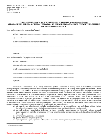 PRODUCENT AUDYCJI TV PT. „MUST BE THE MUSIC. TYLKO MUZYKA” FIRMA JAKE VISION SP. Z O.O. Ul. Europejska 14e 02-964 Warszawa NIP: 521 362 24 78 Warszawa, dn. ………………………….…………2014 rok OŚWIADCZENIE - ZGODA NA WYKORZYSTANIE WIZERUNKU osoby niepełnoletniej (UPOWAŻNIENIE RODZICA/OPIEKUNA PRAWNEGO1 NA UDZIAŁ DZIECKA W AUDYCJI TELEWIZYJNEJ „MUST BE THE MUSIC. TYLKO MUZYKA”) * Dane osobowe dziecka - uczestnika Audycji a) imię i nazwisko: ………………………………………………………………................................... b) rok urodzenia: ……………………………………………………………………………………....…. c) adres zamieszkania (na terytorium Polski): …………………………………………………………………………………………………………………….. …………………………………………………………………………………………………………………….. d) PESEL ………………………………………………………………....................................................... Dane osobowe rodziców/opiekuna prawnego2: a) imię i nazwisko: ………………………………………………………………................................... b) rok urodzenia:……………………………………………………………………………………....…. c) adres zamieszkania (na terytorium Polski): …………………………………………………………………………………………………………………….. …………………………………………………………………………………………………………………….. d) PESEL ………………………………………………………………....................................................... Niniejszym oświadczam, iż ja, niżej podpisany, jestem rodzicem z pełnią praw rodzicielskich/opiekunem prawnym3 wyżej wskazanego dziecka i w związku z udziałem mojego dziecka w audycji telewizyjnej pod tytułem „MUST BE THE MUSIC. TYLKO MUZYKA”, wyrażam nieodpłatnie nieodwołalną zgodę na to, aby wizerunek mojego dziecka i/lub jego głos oraz jego wypowiedź (wraz z imieniem i nazwiskiem, jeżeli Producent ww. audycji telewizyjnej uzna to za stosowne) – w całości lub w postaci dowolnych fragmentów, zostały wykorzystane w ww. audycji tworzonej przez Producenta – firmę Jake Vision Sp. z o.o. i/lub emitowanej przez Telewizję Polsat oraz innych nadawców rozpowszechniających program telewizyjny Telewizji Polsat, jak również w przygotowywanych przez te podmioty materiałach promocyjnych lub reklamowych. Nieodpłatne zezwolenie (upoważnienie), o którym mowa powyżej odnosi się do wielokrotnego (nieograniczonego ilościowo, czasowo i terytorialnie) korzystania z wizerunku mojego dziecka, głosu oraz wypowiedzi na wszystkich znanych polach eksploatacji, a w szczególności: a) utrwalanie na jakimkolwiek nośniku audiowizualnym, a w szczególności na: nośnikach wideo, taśmie światłoczułej, magnetycznej i dysku komputerowym, w sieci multimedialnej (w tym Internet); b) zwielokrotnienie jakąkolwiek techniką, w tym: techniką magnetyczną na kasetach wideo, dyskach audiowizualnych, techniką światłoczułą, cyfrową, techniką zapisu komputerowego, w sieci multimedialnej (w tym Internet); c) wyświetlanie, publiczne odtwarzanie; d) prawo obrotu w kraju i za granicą; e) wypożyczanie, najem, użyczenie lub wymiana nośników, na których audycję utrwalono; 1, 2, 3 (niepotrzebne skreślić) *Proszę wypełniać formularz drukowanymi literami. PRODUCENT AUDYCJI TV PT. „MUST BE THE MUSIC. TYLKO MUZYKA” FIRMA JAKE VISION SP. Z O.O. Ul. Europejska 14e 02-964 Warszawa NIP: 521 362 24 78 f) g) h) i) j) k) l) m) nadawanie za pomocą wizji lub fonii przewodowej i bezprzewodowej przez stację naziemną; nadawanie za pośrednictwem satelity; retransmisja audycji; sporządzanie wersji obcojęzycznych; wprowadzanie do pamięci komputera i do sieci multimedialnej; wykorzystanie w utworach multimedialnych; wykorzystanie na stronach internetowych, w tym na stronach Telewizji Polsat; wprowadzanie do obrotu przy użyciu Internetu i innych technik przekazu danych, wykorzystujących sieci telekomunikacyjne, informatyczne i bezprzewodowe; n) publiczne udostępnianie audycji w taki sposób, aby każdy mógł mieć do niego dostęp w miejscu i w czasie przez siebie wybranym; o) wykorzystanie fragmentów audycji do celów promocyjnych i reklamy audycji, jej producentów oraz dystrybutorów, jak również promocji imprez Telewizji Polsat, opartych na tytule audycji, oraz promocji Telewizji Polsat jako takiej, z wyłączeniem promocji politycznej; p) umieszczenie i wykorzystanie przekazanych przez Producenta fotosów we własnych materiałach promocyjnych, na stronach internetowych, w prasie, w reklamie mało- i wielkoformatowej, na okładkach ewentualnych nośników i na nich samych oraz przekazanie tego prawa kontrahentom krajowym i zagranicznym, z wyłączeniem promocji politycznej; q) komercyjne wykorzystanie audycji oraz/lub jej odcinków/elementów/fragmentów w ramach Internetu (w tym dystrybuowanej w Internecie telewizji interaktywnej); r) równoczesnego i integralnego nadawania dzieła nadawanego przez inną organizację radiową lub telewizyjną. Producentowi i Telewizji Polsat oraz innym podmiotom, o których mowa w niniejszym oświadczeniu przysługuje wyłączne prawo decydowania o formie i czasie wykorzystywania wizerunku mojego dziecka, głosu oraz wypowiedzi – w całości lub w postaci dowolnych fragmentów. Producentowi i Telewizji Polsat przysługuje prawo do zestawiania wypowiedzi mojego dziecka oraz jego/jej wykonania artystycznego z innymi utworami, skracania, wprowadzania zmian ze względów programowych – w zakresie pól eksploatacji wymienionych powyżej, z zastrzeżeniem poszanowania je