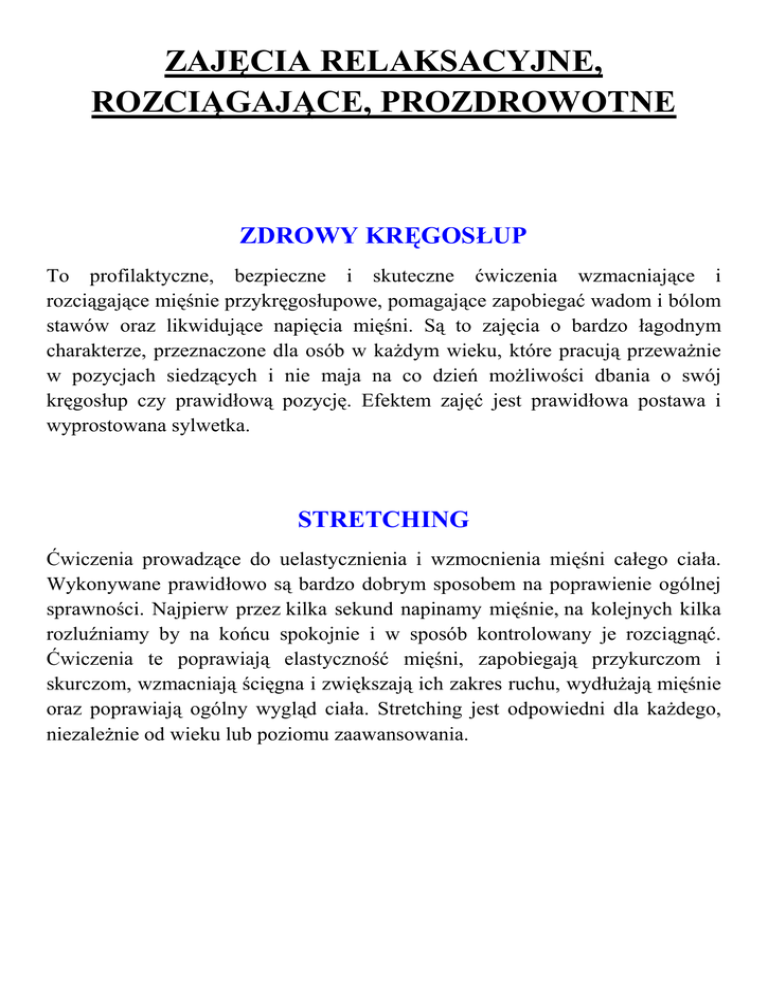 ZAJĘCIA RELAKSACYJNE, ROZCIĄGAJĄCE, PROZDROWOTNE ZDROWY KRĘGOSŁUP To profilaktyczne, bezpieczne i skuteczne ćwiczenia wzmacniające i rozciągające mięśnie przykręgosłupowe, pomagające zapobiegać wadom i bólom stawów oraz likwidujące napięcia mięśni. Są to zajęcia o bardzo łagodnym charakterze, przeznaczone dla osób w każdym wieku, które pracują przeważnie w pozycjach siedzących i nie maja na co dzień możliwości dbania o swój kręgosłup czy prawidłową pozycję. Efektem zajęć jest prawidłowa postawa i wyprostowana sylwetka. STRETCHING Ćwiczenia prowadzące do uelastycznienia i wzmocnienia mięśni całego ciała. Wykonywane prawidłowo są bardzo dobrym sposobem na poprawienie ogólnej sprawności. Najpierw przez kilka sekund napinamy mięśnie, na kolejnych kilka rozluźniamy by na końcu spokojnie i w sposób kontrolowany je rozciągnąć. Ćwiczenia te poprawiają elastyczność mięśni, zapobiegają przykurczom i skurczom, wzmacniają ścięgna i zwiększają ich zakres ruchu, wydłużają mięśnie oraz poprawiają ogólny wygląd ciała. Stretching jest odpowiedni dla każdego, niezależnie od wieku lub poziomu zaawansowania. JOGA Hatha Joga to system ćwiczeń fizyczno-psychicznych, jak również system osobistego rozwoju polegający na jednoczesnym doskonaleniu ciała, umysłu i ducha. Regularne ćwiczenia poprawiają ogólną sprawność fizyczną układów i narządów organizmu, ale także, poprzez swoje działanie terapeutyczne, przywracają równowagę psychiczną. Hatha joga, prowadzoną wg metody B.K.S. Iyengara nadaje się dla każdego, nawet nieco mniej sprawnych osób. Metoda ta wykorzystuje przyrządy pomocnicze: maty, klocki, wałki, paski. Nie koncentruje się wyłącznie na ćwiczeniach fizycznych, niezwykle ważnym jej elementem jest także nauka oddychania. Joga: uelastycznia ścięgna i mięśnie, podnosi odporność, poprawia postawę, usprawnia pracę płuc, dba o serce, spowalnia i pogłębia oddech, dotlenia, wzmacnia kości, podnosi cyrkulację limfy, promuje właściwą wagę ciała, działa uspokajająco, stabilizuje układ nerwowy, usprawnia pracę mózgu, obniża poziom hormonu stresu, obniża poziom cukru w krwi, obniża wysokie ciśnienie, wpływa korzystnie na poziom cholesterolu i trójglicerydów, uwalnia od bólu, wywołuje efekt placebo, wpływa na samouzdrawianie, podnosi poziom entuzjazmu. ZAJĘCIA SIŁOWE, KONDYCYJNE, WZMACNIAJĄCE TRENING FUNKCJONALNY To trening imitujący ruchy wykonywane przez nas w życiu codziennym. Każdego dnia nasze ciało narażone jest na gwałtowne przeciążenia, jeśli odczuwamy podczas nich ból lub chcemy go uniknąć to trening funkcjonalny jest na to doskonałą receptą. Trening ten poprawia praktycznie wszystkie parametry, między innymi wytrzymałość siłową, koordynację ruchową , równowagę ciała oraz gibkość mięśni. W odróżnieniu od typowego treningu siłowego zajęcia te pozwalają na popracowanie nad mięśniami głębokimi oraz aktywują większą liczbę włókien mięśniowych. Regularne zajęcia pozwalają w krótkim czasie osiągnąć zamierzone przez nas efekty. Praca w grupie, motywująca muzyka oraz instruktor czuwający nad techniką ćwiczeń sprawiają, że nie popadniemy w rutynę. Do ćwiczeń używa się różnego rodzaju sprzętu jak: sztangi, piłki lekarskie, kettle, jak również wykonuje się ćwiczenia wykorzystujące własny ciężar ciała. Wyczerpujący trening poprzedzany jest zawsze solidną rozgrzewką natomiast kończy się 10minutową sesją rozciągania. Na zajęciach nie ma limitu wiekowego, przyjść może każdy kto świadomie chce poprawić swoją formę, gdyż intensywność oraz obciążenie regulowane jest według możliwości ćwiczącego. PŁASKI BRZUCH Zajęcia przeznaczone dla osób, którym szczególnie zależy na wyrzeźbieniu mięśni brzucha i talii. Pierwsza część zajęć to krótka rozgrzewka, druga część poświęcona jest specjalistycznemu treningowi ukierunkowanemu na wzmocnienie i ukształtowanie mięśni brzucha. Trening gwarantuje zmniejszenie obwodu talii. Zajęcia przeznaczone dla wszystkich. TABATA To czterominutowy trening, który polega na naprzemiennym wykonywaniu dwóch rodzajów ćwiczeń: anaerobowego, czyli intensywnego treningu interwałowego, podczas którego ćwiczymy wytrzymałość beztlenową. Kiedy wykonujemy ćwiczenia anaerobowe, nasze mięśnie pracują tak intensywnie, że krew nie nadąża z dostarczeniem do nich odpowiedniej ilości tlenu. Wtedy w mięśniach odbywa się proces spalania bez udziału tlenu. aerobowego (tlenowego), czyli umiarkowanego treningu, podczas którego mięśnie nie są obciążone nadmiernym wysiłkiem, co pozwala dostarczyć do nich tlen. Tabata opiera się na 4 podstawowych zasadach: trening trwa 4 minuty, przez 20 sekund wykonujemy jak najwięcej powtórzeń danego ćwiczenia (np. pompek), 10 sekund odpoczynku po każdych 20 sekundach treningu, sesje ćwiczeń powtarzamy 8 razy. PERFECT BODY Intensywne zajęcia modelujące. Trening ukierunkowany na poprawę kondycji, sprawności, wytrzymałości mięśniowej, spalanie tłuszczu, modelowanie sylwetki. Główną cechą zajęć jest połączenie ćwiczeń dynamicznych i statycznych w taki sposób, aby zaangażować jak najwięcej grup mięśniowych. TBC Trening kondycyjny, ogólnorozwojowy, ukierunkowany na wzmocnienie i ujędrnienie całego ciała poprzez odpowiednio dobrane ćwiczenia aerobowe wykonywane w rytmie szybkiej muzyki. Dzięki tym ćwiczeniom zwiększysz wydolność fizyczną organizmu, wzmocnisz mięsnie i poprawisz koordynację ciała. Zajęcia dla osób w każdym wieku i na każdym poziomie zaawansowania. BODY SHAPE Trening, którego celem jest kształtowanie całej sylwetki. Rozpoczyna się 25 minutowymi ćwiczeniami aerobowymi, następnie wykonywane są ćwiczenia na poszczególne partie mięśniowe, tj. ramiona, klatka piersiowa, grzbiet, uda, pośladki, brzuch z wykorzystanie doda