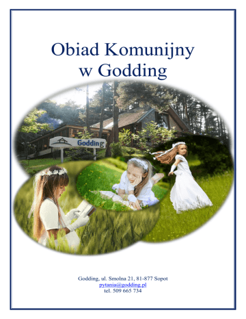 Obiad Komunijny w Godding Godding, ul. Smolna 21, 81-877 Sopot [email protected] tel. 509 665 734 Propozycja I Przystawka zimna Pomidory z mozzarellą i grillowaną cukinią z oliwą bazyliową i ciepłą ciabattą Zupa Bulion z pieczonej kaczki z warzywami i pierożkami borowikowymi Danie główne Pierś kurczaka faszerowana camembertem na sosie gruszkowym z puree z marchwii z zieloną fasolką szparagową z prażonym sezamem Deser Kokosowy krem brulle w marynowanym ananasie z sorbetem limonkowym Napoje ciepłe /zimne Kawa /Herbata Woda niegazowana z cytryną Sok jabłkowy 0,2l / osobę Cena: 100,00 zł /osoby Propozycja II Przystawka zimna Plastry pieczonej kaczki na marynowanej pomarańczy z żurawiną w czerwonym winie podanej w ciastku francuskim Zupa Zupa borowikowa z warzywami i kluseczkami Danie główne (podane na półmiskach) po 1 por./osobę Sola pieczona z warzywami i białą mozzarellą na sosie koperkowym Roladka drobiowa ze szpinakiem i pomidorami suszonymi na sosie bazyliowym Zrazy z karkówki w sosie własnym z suszonym podgrzybkiem Ziemniaki gotowane z koperkiem, buraczki glazurowane z jabłkiem i majerankiem, surówki sezonowe Deser Sorbet owocowy (3smaki) Napoje ciepłe /zimne Kawa /Herbata Woda niegazowana b/ ograniczeń Sok jabłkowy 0,2l / osobę Cena: 125,00 zł /osoby Kolacje Komunie ( przekąski zimne) Zestaw I (1 por./osobę) Roladka z pstrąga ze szpinakiem Klopsiki z dorsza w zalewie octowej, z marchwią, z czerwoną cebulą, z gorczycą Śledź w śmietanie z jabłkiem i chrzanem Roladka drobiowa z kolorowymi paprykami Schab pieczony w czosnku i majeranku z sosem kaparowym Tradycyjny pasztet pieczony w cieście z żurawinami Pieczona karkówka z delikatnym sosem musztardowym Plastry grillowanej piersi kurczaka na sałacie rzymskiej z dresingiem anchovies Marynaty (pieczarka, ogórek, papryka) Zimne sosy (tatarski, koktajlowy, chrzanowy z zielonym pieprzem) Masło smakowe, pieczywo Cena: 35,00 zł /osoby Zestaw II (1 por./osobę) Tatar z pstrąga wędzonego z zielonym ogórkiem w kruchym cieście Filet sandacza marynowany w oliwie borowikowej Pasta z wędzonej makreli i szczypioru w ciastkach francuskich Roladka z polędwiczki wieprzowej faszerowana warzywami zapiekana w wiejskim boczku Szynka pieczona w czosnku z majerankiem z sosem chrzanowym Roladka drobiowa z karmelizowanymi gruszkami i serem pleśniowym Pomidorki cherry i mini mozzarella na kruchych sałatach z ziołową oliwą Deska serów z owocami i krakersami Marynaty (pieczarka, ogórek, papryka, patison, dynia) Zimne sosy (czosnkowy, żurawinowy, ziołowy) Masło smakowe, pieczywo Cena: 45,00zł /osoby Ważne informacje: - propozycje menu, nie mogą ulec zmianie, - możliwość ułożenia odrębnego menu dla dzieci,menu dziecięce to koszt 50,00 zł/osoby, - do lokalu nie można wnosić własnych napoi oraz alkoholi, -możliwość zamówienia wyrobów cukierniczych w Godding- odrębna wycena, - możliwość wniesienia własnych wyrobów cukierniczych- podpisane opakowania (nazwisko rezerwacji) z wyrobami przyjmujemy w dniu komunii, - lokal czynny do godziny 19:00, - rozliczenie dobranych napoi, alkoholi w dniu komunii, - w jednym terminie może odbywać się kilka komunii, na jednej Sali, sala nie jest oddzielana parawanami, - Dwa tygodnie przed uroczystością ustalany jest harmonogram komunii wraz z menu, do 7 dni przed uroczystością, podawana jest ostateczna liczba gości według której następuje ostateczne rozliczenie. - cena menu zawiera: obsługę kelnerską, pełne nakrycie stołów wraz z dekoracją kwiatową.
