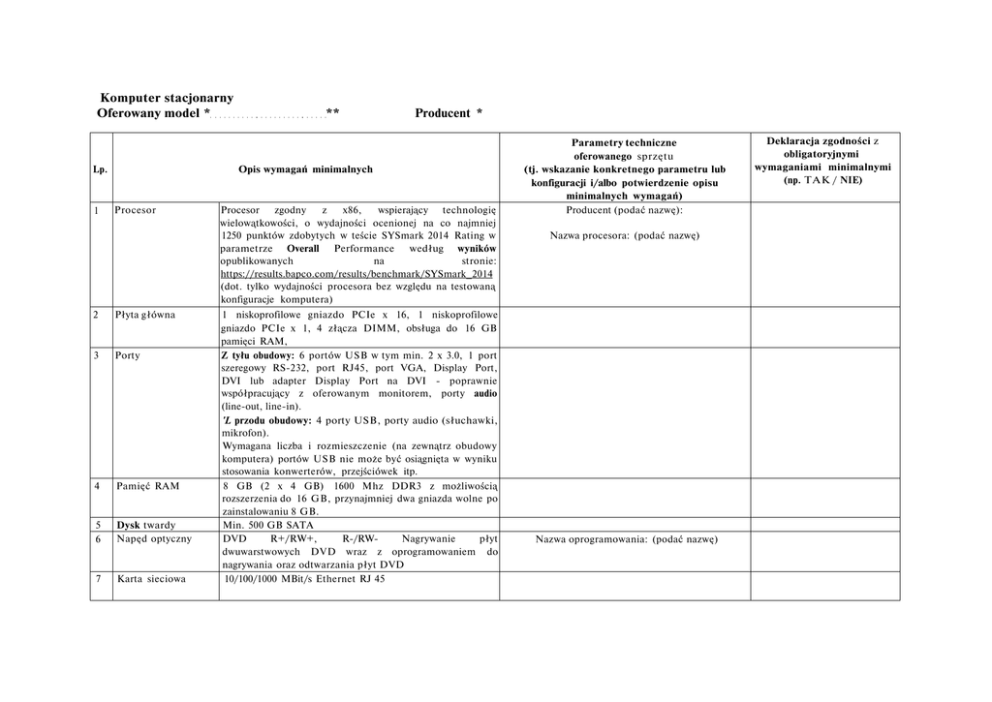 Komputer stacjonarny Oferowany model * Lp. 1 ** Producent * Opis wymagań minimalnych Procesor 2 Płyta główna 3 Porty 4 Pamięć RAM 5 6 Dysk twardy Napęd optyczny 7 Karta sieciowa Procesor zgodny z x86, wspierający technologię wielowątkowości, o wydajności ocenionej na co najmniej 1250 punktów zdobytych w teście SYSmark 2014 Rating w parametrze Overall Performance według wyników opublikowanych na stronie: https://results.bapco.com/results/benchmark/SYSmark_2014 (dot. tylko wydajności procesora bez względu na testowaną konfiguracje komputera) 1 niskoprofilowe gniazdo PCIe x 16, 1 niskoprofilowe gniazdo PCIe x 1, 4 złącza DIMM, obsługa do 16 GB pamięci RAM, Z tyłu obudowy: 6 portów USB w tym min. 2 x 3.0, 1 port szeregowy RS-232, port RJ45, port VGA, Display Port, DVI lub adapter Display Port na DVI - poprawnie współpracujący z oferowanym monitorem, porty audio (line-out, line-in). 'L przodu obudowy: 4 porty USB, porty audio (słuchawki, mikrofon). Wymagana liczba i rozmieszczenie (na zewnątrz obudowy komputera) portów USB nie może być osiągnięta w wyniku stosowania konwerterów, przejściówek itp. 8 GB (2 x 4 GB) 1600 Mhz DDR3 z możliwością rozszerzenia do 16 GB, przynajmniej dwa gniazda wolne po zainstalowaniu 8 GB. Min. 500 GB SATA DVD R+/RW+, R-/RWNagrywanie płyt dwuwarstwowych DVD wraz z oprogramowaniem do nagrywania oraz odtwarzania płyt DVD 10/100/1000 MBit/s Ethernet RJ 45 Parametry techniczne oferowanego sprzętu (tj. wskazanie konkretnego parametru lub konfiguracji i/albo potwierdzenie opisu minimalnych wymagań) Producent (podać nazwę): Nazwa procesora: (podać nazwę) Nazwa oprogramowania: (podać nazwę) Deklaracja zgodności z obligatoryjnymi wymaganiami minimalnymi (np. T A K / NIE) 8 Karta graficzna 9 Karta dźwiękowa 10 11 12 Klawiatura Mysz Obudowa 13 Zasilanie 14 Oprogramowanie Zintegrowana, karta musi umożliwiać pracę z dwoma monitorami. Zintegrowana, wbudowany głośnik audio do odtwarzania plików multimedialnych, nie dopuszcza się głośników instalowanych na złączu USB oraz głośników zewnętrznych. Na złączu USB, 104 klawisze QWERTY.. Optyczna z rolerem na złączu USB, podkładka • Moduł konstrukcji obudowy w jednostce centralnej komputera musi pozwalać na montaż/demontaż kart rozszerzeń i napędów bez konieczności użycia narzędzi (wyklucza się użycia wkrętów, śrub motylkowych); • Uniwersalna - przygotowana fabrycznie do pracy w pozycji poziomej i pionowej. Wszystkie niezbędne elementy typu nóżki, podstawki, mocowania itp. zapewniające ustawienia w pozycji poziomej lub pionowej w zależności od potrzeb użytkownika. • Obudowa w jednostce centralnej musi być otwierana bez konieczności użycia narzędzi (wyklucza się użycie standardowych wkrętów, śrub motylkowych) oraz musi posiadać czujnik otwarcia obudowy współpracujący z oprogramowaniem zarządzającym komputerem. • Obudowa musi posiadać przycisk włącznika na przednim panelu oraz wizualny lub dźwiękowy system diagnostyczny Zasilacz o mocy niezbędnej do zasilenia komputera oraz zainstalowanych akcesoriów o wydajności minimum 85% (przy 50% obciążenia). Oferowany zasilacz musi spełniać wymogi specyfikacji technicznej Energy Star lub równoważnej. Microsoft Windows 8.1 Professional wersja językowa PL 64 bit lub równoważny, preinstalowany fabrycznie przez producenta nie wymagający wpisywania klucza podczas ponownej instalacji, zainstalowany system operacyjny niewymagający aktywacji za pomocą telefonu w firmie Microsoft. Dołączony oryginalny nośnik z spełnia/nie spełnia Podać proponowane rozwiązanie 15 Inne wymagania 16 Dodatkowe wymagania oprog ramowaniem. 1. Do stacji musi być dołączony czytnik kart typu SmartCard stykowy na kablu USB. Wsparcie dla protokołów T=0, T = l . Obsługa kart procesorowych ISO 7816 Class A i AB. Zgodność z systemami operacyjnymi: min. Windows 8/8.1, Linux. Certyfikat ISO 7816 1/2/3/4. Do każdego czytnika typu SmartCard należy dostarczyć dwie karty mikroprocesorowe i niezbędne sterowniki oraz oprogramowanie. Karty mikroprocesorowe muszą współpracować z systemem operacyjnym Microsoft Windows 8/8.1 lub nowszym oraz Linux. Karta mikroprocesorowa musi realizować algorytm RS A o długości klucza min 1024 bitów oraz musi być zgodna z interfejsem PKCS#11. Karta musi mieć obszar pamięci na klucze prywatne, certyfikaty i inne obiekty nie mniejszy niż 32 kB. Karta musi umożliwiać przechowywanie co najmniej trzech kluczy prywatnych o długości co najmniej 1024 bity wraz z ich certyfikatami. Karta musi posiadać certyfikat bezpieczeństwa układu mikroprocesorowego na poziomic ITSEC E3 lub FIPS140-2 Level 3 lub Common Criteria EAL4+. Musi istnieć możliwość komunikacji z kartą z poziomu aplikacji pracującej w środowisku Java lub .NET. 2. Wszystkie niezbędne przewody do podłączenia i poprawnej pracy komputera, kabel łączący komputer z gniazdkiem UTP (linka) o długości 5 m kat. 6, wszystkie niezbędne i aktualne sterowniki i Service Pack-i do zainstalowanych urządzeń na oddzielnych nośnikach CD, instrukcja obsługi komputera. 3. Zdalny upgrade BIOS komputera - przez Internet lub za pomocą fabrycznego oprogramowania. 1. Możliwość blokowania portów wejścia/ wyjścia- funkcja w BlOS-ie komputera. 2. Wszystkie niezbędne elementy do prawidłowej pracy komputera. Oprogramowanie pozwalające na zarządzanie komputerem w sieci oraz umożliwiające min.: • automatyczną rejestrację temperatury pracy Nazwa oprogramowania: (podać nazwę) Wersja: (podać wersję) procesora, zdalne zablokowanie portów szeregowych i równoległych, • zdalną konfiguracje i uaktualnienia BIOS-u [Update BIOS], zdalne wyłączanie komputera w sieci, • zdalny restart komputera w sieci, • kontrola czujnika otwarcia obudowy. Wykonawca w kolumnie Uwagi/Różnice/Oferowany sprzęt musi podać nazwę i wersję tego oprogramowania Głośność jednostki centralnej mierzona
