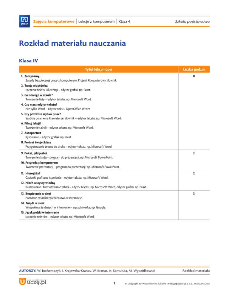 Zajęcia komputerowe | Lekcje z komputerem | Klasa 4 Szkoła podstawowa Rozkład materiału nauczania Klasa IV Tytuł lekcji i opis Liczba godzin 1.Zaczynamy... Zasady bezpiecznej pracy z komputerem. Projekt Komputerowy słownik. 2.Twoja wizytówka Łączenie tekstu i ilustracji – edytor grafiki, np. Paint. 3.Co nowego w szkole? Tworzenie listy – edytor tekstu, np. Microsoft Word. 4.Czy masz edytor tekstu? Nie tylko Word – edytor tekstu OpenOffice Writer. 5.Czy potrafisz szybko pisać? Szybkie pisanie na klawiaturze, słownik – edytor tekstu, np. Microsoft Word. 6.Pilnuj lekcji! Tworzenie tabeli – edytor tekstu, np. Microsoft Word. 7.Autoportret Rysowanie – edytor grafiki, np. Paint. 8.Portret twojej klasy Przygotowanie tekstu do druku – edytor tekstu, np. Microsoft Word. 8 9.Pokaż, jaki jesteś Tworzenie slajdu – program do prezentacji, np. Microsoft PowerPoint. 10.Przyroda z komputerem Tworzenie prezentacji – program do prezentacji, np. Microsoft PowerPoint. 2 11.Hieroglify? Czcionki graficzne i symbole – edytor tekstu, np. Microsoft Word. 12.Niech wszyscy wiedzą Ilustrowanie i formatowanie tabeli – edytor tekstu, np. Microsoft Word, edytor grafiki, np. Paint. 2 13. Bezpiecznie w sieci Poznanie zasad bezpieczeństwa w internecie. 14.Znajdź w sieci Wyszukiwanie danych w internecie – wyszukiwarka, np. Google. 15. Język polski w internecie Łączenie tekstów – edytor tekstu, np. Microsoft Word. 3 AutorZy: W. Jochemczyk, I. Krajewska-Kranas, W. Kranas, A. Samulska, M. Wyczółkowski 1 Rozkład materiału © Copyright by Wydawnictwa Szkolne i Pedagogiczne sp. z o.o., Warszawa 2015 Zajęcia komputerowe | Lekcje z komputerem | Klasa 4 Tytuł lekcji i opis Szkoła podstawowa Liczba godzin 16.Czyj to zamek? Pisanie i ilustrowanie opowiadania – edytor tekstu, np. Microsoft Word. 17. Książka z obrazkami Przygotowanie wspólnego dokumentu (książki) – edytor tekstu, np. Microsoft Word. 18.Goście mile widziani Projektowanie i drukowanie zaproszeń – edytor tekstu, np. Microsoft Word. 19. Sprawdź słówko Wstawianie obrazków do tabeli – edytor tekstu, np. Microsoft Word. 20.Czy znasz ikony programów? Tworzenie własnej ikony – edytor grafiki, np. Paint. 5 21. Co to jest Logomocja? Pokazy w Logomocji. 22.Steruj żółwiem Rysowanie prostych figur – język Logo. 23.Naucz żółwia nowych słów Definiowanie procedur bez parametrów – język Logo. 24.Kolorowe kwadraty Definiowanie procedur z parametrem – język Logo. 4 25.Liczby w komórkach Wprowadzanie i analiza danych – arkusz kalkulacyjny, np. Microsoft Excel. 26.Kolorowe słupki Pierwsze wykresy w arkuszu – arkusz kalkulacyjny, np. Microsoft Excel. 27.Czy masz arkusz kalkulacyjny? Nie tylko Excel – arkusz kalkulacyjny OpenOffice Calc. 28.A ty rośniesz... Tworzenie wykresu kolumnowego, analiza wyników – arkusz kalkulacyjny, np. Microsoft Excel. 29.Matematyka z komputerem Tworzenie formuł – arkusz kalkulacyjny, np. Microsoft Excel. 30.O czym mówią dane? Porządkowanie danych w tabelach i na wykresach – arkusz kalkulacyjny, np. Microsoft Excel. 6 31.Projekt Komputerowy słownik Podsumowanie pracy nad całorocznym projektem. 1 32.Podsumowanie i ocenianie 1 Razem 32 AutorZy: W. Jochemczyk, I. Krajewska-Kranas, W. Kranas, A. Samulska, M. Wyczółkowski 2 Rozkład materiału © Copyright by Wydawnictwa Szkolne i Pedagogiczne sp. z o.o., Warszawa 2015