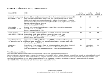 CENNIK WYPOŻYCZALNI SPRZĘTU OGRODOWEGO URZĄDZENIE OPIS Stawka Stawka Kaucja godzinowa w zł dobowa w zł zwrotna w zł maszyna do wysiewu trawy SEMBDNER RS 50 H II proste w obsłudze urządzenie ręczne, szer. robocza 50 cm, cztery czynności w jednym cyklu roboczym - maszyna wyrównuje powierzchnię, sieje, zasypuje wysiane nasiona, wałuje zasianą powierzchnię, maszyna umożliwia wysiew podczas wietrznej pogody; wysiew jest równomierny co daje gwarancję równomiernych wschodów nasion; regulacja ilości wysiewu daje oszczędność z materiału siewnego dł/szer/wys bez rączki 88/61/57 cm 50 150 500 glebogryzarka HUSQVARNA TF 224 poręczny kultywator, posiada silnik Subaru o mocy 5 KM, 4 zęby, kółko transportowe, szer. robocza 60 cm, waga 52 kg dł/szer/wys bez rączki 95/64/75cm 50 120 400 kosiarka spalinowa kosiarka z napędem własnym o prędkości do 7,4 km/h, do wyboru: zbieranie lub PARTNER P53-675 DWAR rozdrabnianie, silnik Briggs & Stratton o mocy 4 KM, szer. cięcia 53cm wys. cięcia 30–80mm, 5 stopni, pojemność kosza 71 litrów, waga 37 kg dł/szer/wys bez rączki 95/58/45cm 30 100 400 wertykulator spalinowy wyposażony w silnik Briggs&Stratton o mocy 2,5 KM, szer. robocza 42 cm, regulacja CASTELGARDEN SC 42 B głębokości pracy, liczba noży – 15, pojemność kosza na trawę - 45 litrów, waga 34 kg dł/szer/wys bez rączki 75/58/53 cm 50 120 400 walec do trawy WAMET 10 40 bez kolcy 50 z kolcami 100 szer. robocza - 52 cm, średnica - 40 cm, na walec można nałożyć aerator (kolce - komplet 5 szt.), jedna obręcz posiada 8 kolców o wysokości 6 cm, które nakłuwają trawnik, waga bez wypełnienia 14 kg, pojemność walca 66 l, waga z wypełnieniem wodą 80 kg Wszystkie ceny są cenami brutto. Przed przyjazdem prosimy o kontakt celem upewnienia się, czy wypożyczenie danego sprzętu będzie możliwe. Sprzęt wypożyczamy na podstawie umowy najmu. Aby wypożyczyć sprzęt musicie Państwo posiadać dokument tożsamości oraz gotówkę na wpłacenie kaucji zwrotnej (kaucji nie przyjmujemy kartami płatniczymi). Zwrot kaucji nastąpi po zwróceniu w stanie nieuszkodzonym i niezabrudzonym sprzętu będącego przedmiotem najmu. Sprzętu nie mogą obsługiwać nieletni. Jednocześnie informujemy, że nie sprawdzamy kwalifikacji wynajmujących do pracy z danym sprzętem i nie ponosimy odpowiedzialności za ewentualne straty bądź obrażenia związane z jego użytkowaniem. Abyś mógł cieszyć się ogrodem www.babkawogrodzie.pl tel. + 48 609 951 632 [email protected]