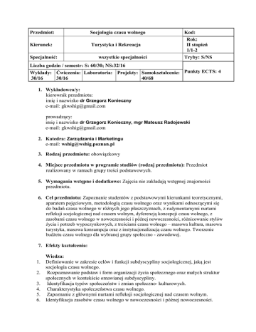 Przedmiot: Socjologia czasu wolnego Kod: Kierunek: Turystyka i