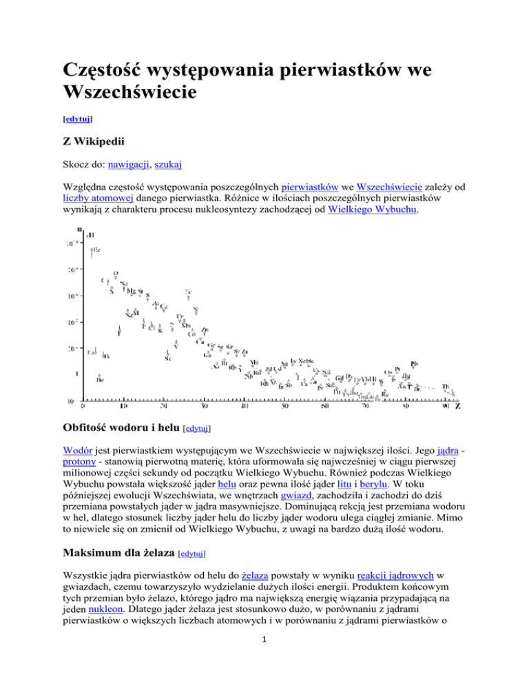 Częstość występowania pierwiastków we Wszechświecie [edytuj] Z Wikipedii Skocz do: nawigacji, szukaj Względna częstość występowania poszczególnych pierwiastków we Wszechświecie zaleŜy od liczby atomowej danego pierwiastka. RóŜnice w ilościach poszczególnych pierwiastków wynikają z charakteru procesu nukleosyntezy zachodzącej od Wielkiego Wybuchu. Obfitość wodoru i helu [edytuj] Wodór jest pierwiastkiem występującym we Wszechświecie w największej ilości. Jego jądra protony - stanowią pierwotną materię, która uformowała się najwcześniej w ciągu pierwszej milionowej części sekundy od początku Wielkiego Wybuchu. RównieŜ podczas Wielkiego Wybuchu powstała większość jąder helu oraz pewna ilość jąder litu i berylu. W toku późniejszej ewolucji Wszechświata, we wnętrzach gwiazd, zachodziła i zachodzi do dziś przemiana powstałych jąder w jądra masywniejsze. Dominującą rekcją jest przemiana wodoru w hel, dlatego stosunek liczby jąder helu do liczby jąder wodoru ulega ciągłej zmianie. Mimo to niewiele się on zmienił od Wielkiego Wybuchu, z uwagi na bardzo duŜą ilość wodoru. Maksimum dla Ŝelaza [edytuj] Wszystkie jądra pierwiastków od helu do Ŝelaza powstały w wyniku reakcji jądrowych w gwiazdach, czemu towarzyszyło wydzielanie duŜych ilości energii. Produktem końcowym tych przemian było Ŝelazo, którego jądro ma największą energię wiązania przypadającą na jeden nukleon. Dlatego jąder Ŝelaza jest stosunkowo duŜo, w porównaniu z jądrami pierwiastków o większych liczbach atomowych i w porównaniu z jądrami pierwiastków o 1 trochę mniejszych liczbach atomowych. Jądra masywniejsze od jąder Ŝelaza powstały podczas wybuchu supernowych, w warunkach ekstremalnie wysokich temperatur i ciśnień. Źródła informacji o składzie izotopowym Wszechświata [edytuj] Głównym źródłem informacji o ilości poszczególnych pierwiastków tworzących Wszechświat są badania składu skorupy ziemskiej. W niewielkim stopniu istnieje moŜliwość bezpośredniego badania minerałów z KsięŜyca, meteorytów i pośrednio - powierzchni Marsa. Głównym źródłem informacji na temat składu bardziej odległych obiektów są metody spektroskopii promieniowania elektromagnetycznego. Badając światło zarówno emitowane jak i odbijane, rozpraszane i pochłaniane przez róŜne obiekty kosmiczne, moŜna określić skład atmosfer planet, gwiazd, moŜna ustalić z czego zbudowane są inne galaktyki i jaki jest skład zimnych obłoków gazu i pyłu kosmicznego. Badanie składu izotopowego Wszechświata dostarcza równocześnie narzędzia do weryfikacji teorii dotyczących nukleosyntezy. Zobacz równieŜ [edytuj] • • • • • Nukleosynteza Energia wiązania Spektroskopia Cykl protonowy Cykl węglowo-azotowo-tlenowy Źródło: "http://pl.wikipedia.org/wiki/Cz%C4%99sto%C5%9B%C4%87_wyst%C4%99powania_pier wiastk%C3%B3w_we_Wszech%C5%9Bwiecie" Kategoria: Astrofizyka Abundance of the chemical elements From Wikipedia, the free encyclopedia • Interested in contributing to Wikipedia? • Jump to: navigation, search See also: Abundances of the elements (data page). The abundance of a chemical element measures how relatively common the element is, or how much of the element there is by comparison to all other elements. Abundance may be variously measured by the mass-fraction (the same as weight fraction), or mole-fraction (fraction of atoms, or sometimes fraction of molecules, in gases), or by volume fraction. Measurement by volume-fraction is a common abundance measure in mixed gases such as atmospheres, which is close to molecular mole-fraction for ideal gas mixtures (i.e., gas mixtures at relatively low densities and pressures). 2 For example, the mass-fraction abundance of oxygen in water is about 89%, because that is the fraction of water's mass which is oxygen. However, the mole-fraction abundance of oxygen in water is only 33% because only 1 atom in 3 in water is an oxygen atom. In the universe as a whole, and in the atmospheres of gas-giant planets such as Jupiter, the massfraction abundances of hydrogen and helium are about 74% and 23-25% respectively, while the (atomic) mole-fractions of these elements are closer to 92% and 8%. However, since hydrogen is diatomic while helium is not in the conditions of Jupiter's outer atmosphere, the molecular mole-fraction (fraction of total gas molecules, or fraction of atmosphere by volume) of hydrogen in the outer atmosphere of Jupiter is about 86%, and for helium, 13%. Most abundances in this article are given as mass-fraction abundances. Contents [hide] • • • • • 1 Abundance of elements in the Universe 2 Abundance of elements on Earth o 2.1 Abundance of elements in Earth's crust 2.1.1 "Rare earth" element abundances o 2.2 Ocean o 2.3 Atmosphere o 2.4 Human body 3 See also 4 Footnotes and references 5 External links [edit] Abundance of elements in the Universe The elements - namely ordinary (baryonic) matter made out of protons and neutrons (as well as electrons) - are only a small part of the content of the Universe. Cosmological observations suggest that about 73% of the universe consists of dark energy, 23% is composed of dark matter and only 4% corresponds to the visible baryonic matter which constitutes stars, planets and living beings. Dark matter has not yet been detected in a particle physics detector, and the nature of the dark energy is not yet understood. Most standard (baryonic) matter is found in the form of atoms or plasma, although there are many other unusual kinds of matter. Other forms of baryonic matter include white dwarfs, neutron stars and black holes. Standard matter also exists as photons (mostly in the cosmic microwave background) and neutrons. Hydrogen is the most abundant element in the known Universe; helium is second. However, after this, the rank of abundance does not continue to correspond to the atomic number; oxygen has abundance rank
