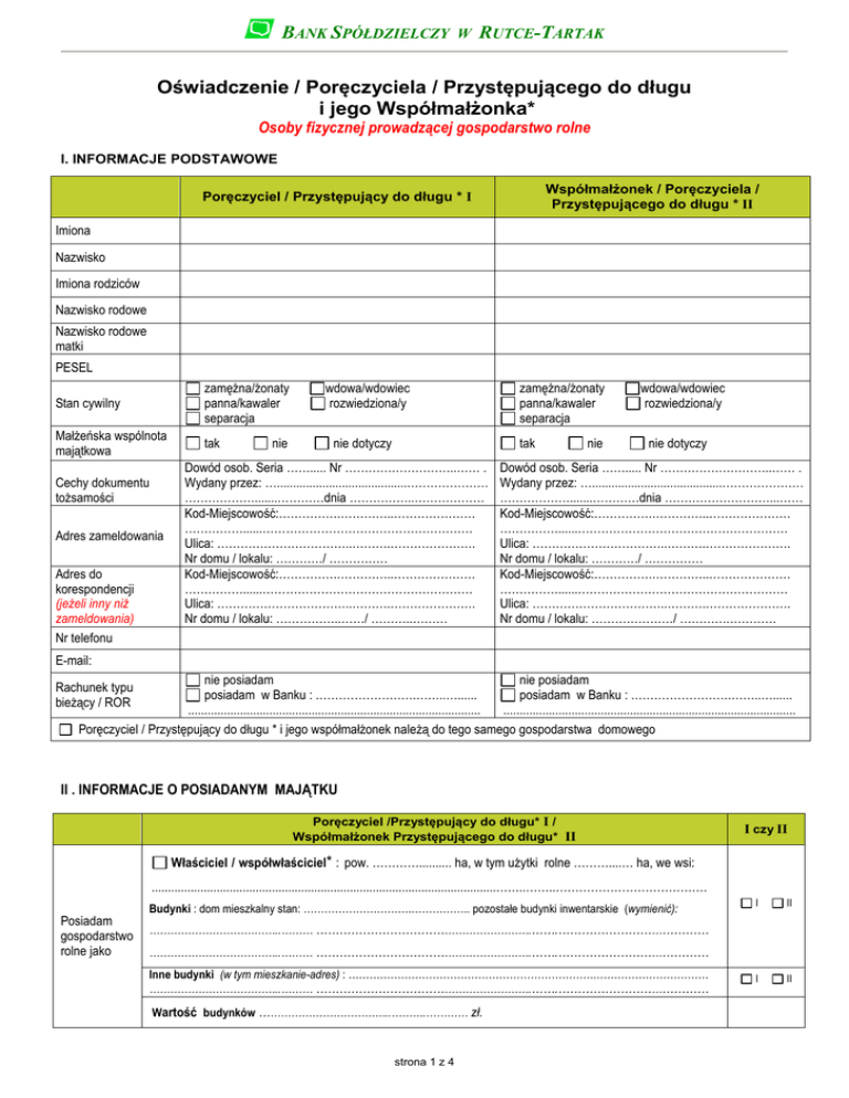 BANK SPÓŁDZIELCZY W RUTCE-TARTAK Oświadczenie / Poręczyciela / Przystępującego do długu i jego Współmałżonka* Osoby fizycznej prowadzącej gospodarstwo rolne I. INFORMACJE PODSTAWOWE Współmałżonek / Poręczyciela / Przystępującego do długu * II Poręczyciel / Przystępujący do długu * I Imiona Nazwisko Imiona rodziców Nazwisko rodowe Nazwisko rodowe matki PESEL Stan cywilny zamężna/żonaty panna/kawaler separacja Małżeńska wspólnota majątkowa tak Cechy dokumentu tożsamości Adres zameldowania Adres do korespondencji (jeżeli inny niż zameldowania) Nr telefonu nie wdowa/wdowiec rozwiedziona/y nie dotyczy zamężna/żonaty panna/kawaler separacja tak Dowód osob. Seria ……..... Nr ………………………..…… . Wydany przez: …........................................………………… ……………….......…………dnia ……………..……………… Kod-Miejscowość:…………….…………..………………… ……………......……………………………………………… Ulica: ……………………………..……….…………………. Nr domu / lokalu: …………/ …………… Kod-Miejscowość:…………….…………..………………… ……………......……………………………………………… Ulica: ……………………………..……….…………………. Nr domu / lokalu: ……………..……/ ………..……… nie wdowa/wdowiec rozwiedziona/y nie dotyczy Dowód osob. Seria ……..... Nr ………………………..…… . Wydany przez: …........................................………………… ……………….......…………dnia ………………………...…… Kod-Miejscowość:…………….…………..………………… ……………......……………………………………………… Ulica: ……………………………..……….…………………. Nr domu / lokalu: …………/ …………… Kod-Miejscowość:…………….…………..………………… ……………......……………………………………………… Ulica: ……………………………..……….…………………. Nr domu / lokalu: …………………/ ………….………… E-mail: nie posiadam nie posiadam posiadam w Banku : .…………………….……..…...... posiadam w Banku : .…………………….……..…...... .......................................................................................... .......................................................................................... Poręczyciel / Przystępujący do długu * i jego współmałżonek należą do tego samego gospodarstwa domowego Rachunek typu bieżący / ROR II . INFORMACJE O POSIADANYM MAJĄTKU Poręczyciel /Przystępujący do długu* I / Współmałżonek Przystępującego do długu* II I czy II Właściciel / współwłaściciel* : pow. ………….......... ha, w tym użytki rolne ………....… ha, we wsi: ..........................................................................................................……..……..………………………………… Posiadam gospodarstwo rolne jako Budynki : dom mieszkalny stan: ………………………….…………….. pozostałe budynki inwentarskie (wymienić): I II I II ………………………………..……… ………………………………………………….…….………………………………… ………………………………..……… ………………………………………………….…….………………………………… Inne budynki (w tym mieszkanie-adres) : …………………………………………………………….…………………………… ………………………………..……… ………………………………………………….…….………………………………… Wartość budynków ………………………………..……….………… zł. strona 1 z 4 Poręczyciel /Przystępujący do długu* I / Współmałżonek Przystępującego do długu* II I czy II Maszyny i urządzenia (w szt.): kombajn ….., ciągnik ….., agregat uprawowy ….., rozrzutnik obornika….., paszowóz….., ładowacz …..., prasa…...,owijarka bel …...., przyczepa samozb. ….., opryskiwacz ….., dojarka/hala udojowa* (liczba stanowisk ………), chłodnia mleka (pojemn. litry) ………….…, silosy paszowe szt./ton ………, przyczepa transportowa …..., samochód osobowy/ciężarowy ( marka) …………………….….. ………………………………………….pozostały sprzęt uprawowy / inne ……………………………….………….. .................................................................................................................................................. . ……………………………………………szacunkowa wartość maszyn i urządzeń ......................... zł. Inwentarz żywy (w szt.): krowy......., jałówki ......., opasy ......., cielęta ......., maciory …...., tuczniki ......., warchlaki …...., prosięta .........., inne szacunkowa ……………………..………………………………. wartość …………….…………….zł. Dzierżawca ……..... ha., w tym użytki rolne ………… ha , we wsi ………….………………………………. I II ...................................................................................na okres ...........lat umowa zawarta do .................. r. Uprawy(w ha): zboża .........., łąki/pastwiska ............, kukurydza......., inne ........................................................................ Inne składniki (nieruchomości, lokaty, papiery wartościowe)……………… …………………………………… ……………………………………………………………………………