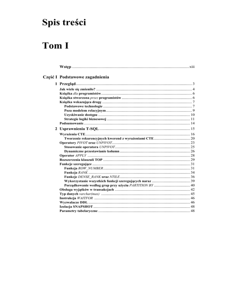 Spis treści Tom I Wstęp ........................................................................................................................ xiii Część I Podstawowe zagadnienia 1 Przegląd....................................................................................................................... 3 Jak wiele się zmieniło? .................................................................................................. 4 KsiąŜka dla programistów ............................................................................................. 6 KsiąŜka stworzona przez programistów ........................................................................ 6 KsiąŜka wskazująca drogę ............................................................................................ 7 Podstawowe technologie ........................................................................................... 7 Poza modelem relacyjnym ........................................................................................ 9 Uzyskiwanie dostępu .............................................................................................. 10 Strategie logiki biznesowej ..................................................................................... 11 Podsumowanie ............................................................................................................. 14 2 Usprawnienia T-SQL ............................................................................................. 15 WyraŜenia CTE ........................................................................................................... 16 Tworzenie rekurencyjnych kwerend z wyraŜeniami CTE ..................................... 20 Operatory PIVOT oraz UNPIVOT................................................................................ 23 Stosowanie operatora UNPIVOT............................................................................. 25 Dynamiczne przestawianie kolumn ........................................................................ 26 Operator APPLY ......................................................................................................... 28 Rozszerzenia klauzuli TOP ......................................................................................... 29 Funkcje szeregujące .................................................................................................... 31 Funkcja ROW_NUMBER......................................................................................... 31 Funkcja RANK ........................................................................................................ 34 Funkcje DENSE_RANK oraz NTILE........................................................................ 36 Wykorzystanie wszystkich funkcji szeregujących naraz ....................................... 39 Porządkowanie według grup przy uŜyciu PARTITION BY ..................................... 40 Obsługa wyjątków w transakcjach ............................................................................. 42 Typ danych varchar(max) ........................................................................................... 45 Instrukcja WAITFOR .................................................................................................. 46 Wyzwalacze DDL ........................................................................................................ 46 Izolacja SNAPSHOT ................................................................................................... 48 Parametry tabelaryczne .............................................................................................. 48 Więcej niŜ kolejny typ tabeli tymczasowej ............................................................. 49 Praca ze zbiorem zawierającym wiele wierszy ....................................................... 51 Wykorzystanie parametrów TVP do wykonywania masowych operacji INSERT oraz UPDATE ..................................................................................................... 52 Obsługa pojedynczych wierszy danych .................................................................. 55 Tworzenie parametrów TVP pełniących rolę słownika ......................................... 58 Przekazywanie parametrów TVP przy uŜyciu ADO.NET ..................................... 60 Ograniczenia paramentów TVP ............................................................................ 63 Nowe typy danych daty i godziny ................................................................................ 63 Rozdzielenie dat i godzin ........................................................................................ 63 Łatwiejsze przenoszenie danych daty i godziny ..................................................... 64 Obsługa stref czasowych ......................................................................................... 65 Precyzja, rozmiar i format typów daty i godziny ................................................... 67 Nowe i zmodyfikowane funkcje .............................................................................. 69 Instrukcja MERGE ..................................................................................................... 72 Definiowanie obiektu źródłowego i docelowego instrukcji MERGE ....................... 75 Klauzula WHEN MATCHED ................................................................................... 76 Klauzula WHEN NOT MATCHED BY TARGET ....................................................... 77 Wykorzystanie instrukcji MERGE do replikacji tabeli .......................................... 78 Klauzula WHEN NOT MATCHED BY SOURCE ...................................................... 79 Dane wyjściowe MERGE ......................................................................................... 81 Wybór metody złączania ...................................................................................