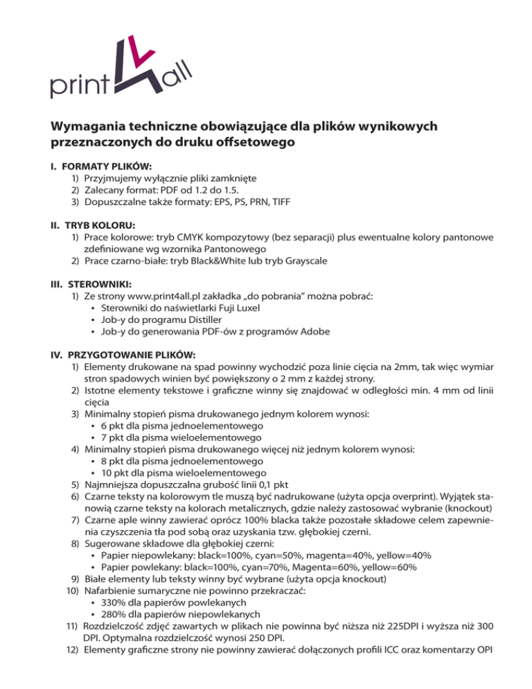 Wymagania techniczne obowiązujące dla plików wynikowych przeznaczonych do druku offsetowego I. FORMATY PLIKÓW: 1) Przyjmujemy wyłącznie pliki zamknięte 2) Zalecany format: PDF od 1.2 do 1.5. 3) Dopuszczalne także formaty: EPS, PS, PRN, TIFF II. TRYB KOLORU: 1) Prace kolorowe: tryb CMYK kompozytowy (bez separacji) plus ewentualne kolory pantonowe zdefiniowane wg wzornika Pantonowego 2) Prace czarno-białe: tryb Black&White lub tryb Grayscale III. STEROWNIKI: 1) Ze strony www.print4all.pl zakładka „do pobrania” można pobrać: • Sterowniki do naświetlarki Fuji Luxel • Job-y do programu Distiller • Job-y do generowania PDF-ów z programów Adobe IV. PRZYGOTOWANIE PLIKÓW: 1) Elementy drukowane na spad powinny wychodzić poza linie cięcia na 2mm, tak więc wymiar stron spadowych winien być powiększony o 2 mm z każdej strony. 2) Istotne elementy tekstowe i graficzne winny się znajdować w odległości min. 4 mm od linii cięcia 3) Minimalny stopień pisma drukowanego jednym kolorem wynosi: • 6 pkt dla pisma jednoelementowego • 7 pkt dla pisma wieloelementowego 4) Minimalny stopień pisma drukowanego więcej niż jednym kolorem wynosi: • 8 pkt dla pisma jednoelementowego • 10 pkt dla pisma wieloelementowego 5) Najmniejsza dopuszczalna grubość linii 0,1 pkt 6) Czarne teksty na kolorowym tle muszą być nadrukowane (użyta opcja overprint). Wyjątek stanowią czarne teksty na kolorach metalicznych, gdzie należy zastosować wybranie (knockout) 7) Czarne aple winny zawierać oprócz 100% blacka także pozostałe składowe celem zapewnienia czyszczenia tła pod sobą oraz uzyskania tzw. głębokiej czerni. 8) Sugerowane składowe dla głębokiej czerni: • Papier niepowlekany: black=100%, cyan=50%, magenta=40%, yellow=40% • Papier powlekany: black=100%, cyan=70%, Magenta=60%, yellow=60% 9) Białe elementy lub teksty winny być wybrane (użyta opcja knockout) 10) Nafarbienie sumaryczne nie powinno przekraczać: • 330% dla papierów powlekanych • 280% dla papierów niepowlekanych 11) Rozdzielczość zdjęć zawartych w plikach nie powinna być niższa niż 225DPI i wyższa niż 300 DPI. Optymalna rozdzielczość wynosi 250 DPI. 12) Elementy graficzne strony nie powinny zawierać dołączonych profili ICC oraz komentarzy OPI 13) Jeżeli zlecenie obejmuje usługi typu: wykrawanie, perforacja, falcowanie w nietypowym miejscu, należy dołączać plik podglądowy z umiejscowieniem tych elementów. 14) W wypadku publikacji foliowanych lub lakierowanych miejscowo należy dołączyć maskę na lakier – bądź jako piąty kolor, bądź jako osobny plik w kolorze 100%. 15) Wykrojnik można także nałożyć na pracę główną jako piąty kolor, należy jednak zadbać aby nie czyścił on tła pod sobą (ma być użyta opcja overprint). Zasada ta tyczy także masek na lakier wybiórczy. 16) Dla opraw klejonych i szyto-klejonych należy pamiętać, że 2 i 3 strona okładki oraz pierwsza i ostatnia strona wkładu będą miały zaklejone 4-5 mm od strony grzbietu przez klejenie boczne, wskutek czego zmniejsza się efektywny format rozkładówek. Jeżeli nie wprowadzona jest korekta to pojawia się zjawisko „wycięcia” fragmentu obrazu spowodowanego zaklejeniem. Format strony powinien zostać ten sam, zmianie podlega jedynie wielkość obrazu na stronie. 17) W przypadku maszynowego klejenie składki w grzbiecie (na złamywarce) minimalna odległość tekstu i innych elementów graficznych od grzbietu winna wynosić 6mm z powodu zjawiska opisanego w punkcie poprzednim. V. ODWZOROWANIE KOLORU 1) W celu weryfikacji kolorystyki publikacji zaleca się dołączenie do każdej publikacji proofa cyfrowego. Proof winien zawierać pasek kontrolny i certyfikację. 2) Proofy winny być wykonane z plików ostatecznych przekazanych Drukarni do druku 3) Do wykonania proofów należy stosować profil ICC zgodny z normą ISO 12647-2. W wypadku papierów powlekanych jest to profil ISO-Coated lub Fogra-Coated, a w przypadku papierów niepowlekanych ISO-Uncoated lub Fogra-Uncoated. 4) Proofy kolorystyczne można zlecić jako usługę dodatkową do wykonania przez Drukarnię. 5) Jeżeli Klient nie dostarczy proofów, druk odbywa się wg standartowych gęstości optycznych przyjętych przez drukarnię. VI. ZASADY KOŃCOWE 1) Drukarnia nie bierze odpowiedzialności za poprawność naświetlenia i druku plików przygotowanych niezgodnie z powyższymi zasadami. 2) Wszystkie dodatkowe operacje mające na celu dostosowanie plików do zgodności ze specyfikacją i wszystkie zmiany dokonane przez Drukarnię mogą się odbyć jedynie na zlecenie Klienta i traktowane będą jako dodatkowa płatna usługa. 3) Za termin dostarczenia materiałów do druku uważa się czas dostarczenia kompletnych, nie wymagających poprawy plików. 4) Niedotrzymanie terminu dostarczenia plików do druku może spowodować opóźnienie w terminie realizacji produktu końcowego, za co Drukarnia nie ponosi odpowiedzialności.