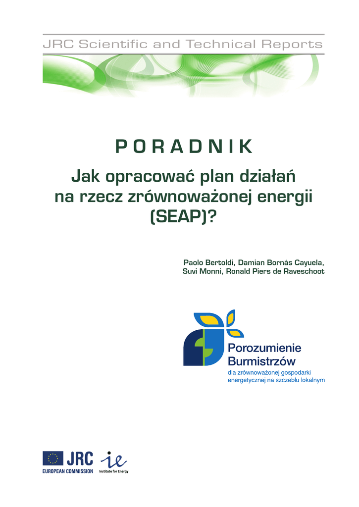 JRC Scientific and Technical Reports PORADNIK Jak opracować plan działań na rzecz zrównoważonej energii (SEAP)? Paolo Bertoldi, Damian Bornás Cayuela, Suvi Monni, Ronald Piers de Raveschoot Misją Instytutu ds. Energii Wspólnego Centrum Badawczego jest wspieranie unijnej polityki w zakresie energetyki jądrowej i niejądrowej, w celu zapewnienia zrównoważonej, bezpiecznej i efektywnej produkcji, dystrybucji i wykorzystania energii. Komisja Europejska Wspólne Centrum Badawcze Instytut ds. Energii Kontakt Adres: TP-450 Via Enrico Fermi 2749, 21027 Ispra (Włochy) E-mail: [email protected] Tel.: +39 0332 78 9299 Faks: +39 0332 78 9992 http://ie.jrc.ec.europa.eu/ http://www.jrc.ec.europa.eu/ Zastrzeżenie Komisja Europejska ani jakakolwiek osoba działająca w jej imieniu nie bierze odpowiedzialności za wykorzystanie niniejszej publikacji. Wyłączna odpowiedzialność za treść polskiej wersji Poradnika spoczywa na Stowarzyszeniu Gmin Polska Sieć „Energie Cités”. Nie wyraża ona opinii Unii Europejskiej. Komisja Europejska, Biuro Porozumienia Burmistrzów oraz sieci tworzące Biuro Porozumienia Burmistrzów nie ponoszą odpowiedzialności za niniejsze tłumaczenie. Należy zwrócić uwagę, iż podstawowym źródłem informacji jest wersja angielska. W przypadku rozbieżności pomiędzy wersją angielską a jej tłumaczeniem, znaczenie nadrzędne ma wersja angielska. Europe Direct jest usługą umożliwiającą uzyskanie odpowiedzi na pytania dotyczące Unii Europejskiej Bezpłatny numer telefonu (*): 00 800 6 7 8 9 10 11 (*) W przypadku niektórych operatorów telefonii komórkowej dostęp do numerów zaczynających się na 00 800 jest niemożliwy lub naliczane są opłaty za połączenie. Wiele dodatkowych informacji na temat Unii Europejskiej można znaleźć w Internecie na serwerze: http://europa.eu/. Tytuł oryginału: “How to develop a Sustainable Energy Action Plan – Guidebook” Luksemburg, Urząd Publikacji Unii Europejskiej, © Unia Europejska, 2010 JRC 57789 / EUR 24360 EN / ISBN 978-92-79-15782-0 / ISSN 1018-5593 / DOI 10.2790/20638 Tłumaczenie: Stowarzyszenie Gmin Polska Sieć „Energie Cités” – 2012 r. Skład i druk: Agencja Reklamowo-Wydawnicza „Ostoja”, tel. 601 41 01 01 Wydawca: Stowarzyszenie Gmin Polska Sieć „Energie Cités” ul. Sławkowska 17, 31-016 Kraków tel. + 48 12 429 17 95; fax +48 12 429 17 93 ISBN: 978-83-924306-7-4 Kopiowanie jest dozwolone pod warunkiem podania źródła. Spis treści Wstęp – o niniejszym poradniku........................................................................... 7 Podziękowania.................................................................................................. 9 CZĘŚĆ I Jak opracować Plan działań na rzecz zrównoważonej energii (SEAP)?.... 11 Rozdział 1. Plan działań na rzecz zrównoważonej energii – sposób na wykroczenie poza cele unijne . ........................................ 13 1.1. 1.2. 1.3. 1.4. 1.5. 1.6. 1.7. 1.8. 1.9. 1.10. Co to jest SEAP?.........................................................................................13 Zakres SEAP..............................................................................................13 Horyzont czasowy........................................................................................14 Proces opracowania i wdrażania SEAP............................................................15 Zasoby ludzkie i finansowe.............................................................................16 Szablon SEAP i procedura składania SEAP........................................................16 Zalecana struktura SEAP..............................................................................17 Poziom szczegółowości.................................................................................18 Podstawowe elementy udanego SEAP.............................................................18 Dekalog zasad, o których należy pamiętać przygotowując SEAP............................18 Rozdział 2. Zobowiązanie polityczne.................................................................. 23 Rozdział 3. Adaptacja struktur administracyjnych............................................... 27 3.1. Jak dostosować struktury administracyjne?......................................................27 3.2. Przykłady z miast-sygnatariuszy......................................................................29 3.3. Wsparcie zewnętrzne..................................................................................30 Rozdział 4. Budowanie wsparcia ze strony interesariuszy..................................... 33 4.1. Kim są interesariusze?.................................................................................33 4.2. Jak zaangażować interesariuszy?...................................................................35 4.3. Komunikacja...............................................................................................37 Rozdział 5. Ocena aktualnej sytuacji: Gdzie jesteśmy?.......................................... 39 5.1. Analiza przepisów........................................................................................39 5.2. Ocena sytuacji wyjściowej i bazowa inwentaryzacja emisji.....................................39 5.3. Analiza SWOT.............................................................................................41 Rozdział 6. Sformułowanie długoterminowej wizji z jasno określonymi celami........... 43 6.1. Wizja: w stronę zrównoważonej energetycznie przyszłości...................................43 6.2. Wyznaczenie celów strategicznych i szczegółowych............................................44 6.3. Przykłady celów zgodnych z koncepcją SMART..................................................44 Rozdział 7. Opracowanie SEAP......................................................................... 47 Rozdział 8. Strategie oraz działania i środki możliwe