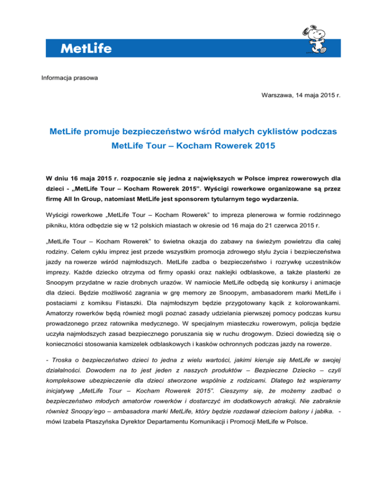 Informacja prasowa Warszawa, 14 maja 2015 r. MetLife promuje bezpieczeństwo wśród małych cyklistów podczas MetLife Tour – Kocham Rowerek 2015 W dniu 16 maja 2015 r. rozpocznie się jedna z największych w Polsce imprez rowerowych dla dzieci - „MetLife Tour – Kocham Rowerek 2015”. Wyścigi rowerkowe organizowane są przez firmę All In Group, natomiast MetLife jest sponsorem tytularnym tego wydarzenia. Wyścigi rowerkowe „MetLife Tour – Kocham Rowerek” to impreza plenerowa w formie rodzinnego pikniku, która odbędzie się w 12 polskich miastach w okresie od 16 maja do 21 czerwca 2015 r. „MetLife Tour – Kocham Rowerek” to świetna okazja do zabawy na świeżym powietrzu dla całej rodziny. Celem cyklu imprez jest przede wszystkim promocja zdrowego stylu życia i bezpieczeństwa jazdy na rowerze wśród najmłodszych. MetLife zadba o bezpieczeństwo i rozrywkę uczestników imprezy. Każde dziecko otrzyma od firmy opaski oraz naklejki odblaskowe, a także plasterki ze Snoopym przydatne w razie drobnych urazów. W namiocie MetLife odbędą się konkursy i animacje dla dzieci. Będzie możliwość zagrania w grę memory ze Snoopym, ambasadorem marki MetLife i postaciami z komiksu Fistaszki. Dla najmłodszym będzie przygotowany kącik z kolorowankami. Amatorzy rowerków będą również mogli poznać zasady udzielania pierwszej pomocy podczas kursu prowadzonego przez ratownika medycznego. W specjalnym miasteczku rowerowym, policja będzie uczyła najmłodszych zasad bezpiecznego poruszania się w ruchu drogowym. Dzieci dowiedzą się o konieczności stosowania kamizelek odblaskowych i kasków ochronnych podczas jazdy na rowerze. - Troska o bezpieczeństwo dzieci to jedna z wielu wartości, jakimi kieruje się MetLife w swojej działalności. Dowodem na to jest jeden z naszych produktów – Bezpieczne Dziecko – czyli kompleksowe ubezpieczenie dla dzieci stworzone wspólnie z rodzicami. Dlatego też wspieramy inicjatywę „MetLife Tour – Kocham Rowerek 2015”. Cieszymy się, że możemy zadbać o bezpieczeństwo młodych amatorów rowerków i dostarczyć im dodatkowych atrakcji. Nie zabraknie również Snoopy’ego – ambasadora marki MetLife, który będzie rozdawał dzieciom balony i jabłka. mówi Izabela Ptaszyńska Dyrektor Departamentu Komunikacji i Promocji MetLife w Polsce. Organizatorzy przewidują, że w każdym z 12 wyścigów udział weźmie około 5,5 tysiąca dzieci w wieku od 3 do 10 lat. Uczestnicy zostaną podzieleni na osiem kategorii wiekowych. Zwieńczeniem wyścigu będzie uroczyste wręczenie nagród młodym zawodnikom. Każdy uczestnik stanie na podium, otrzyma dyplom oraz upominek, bez względu na zajęte miejsce. Tegoroczna edycja wyścigów rowerkowych MetLife Tour – Kocham Rowerek odbędzie się w 12 miastach Polski: 16.05 Opole, ul. Pużaka, przy Miasteczku Ruchu Drogowego 17.05 Wrocław, Park Tołpy 23.05 Łódź, Motodrom w Parku 3 maja 24.05 Poznań, Park Jana Pawła II 30.05 Warszawa, Kępa Potocka 31.05 Kielce, Skwer Szarych Szeregów 06.06 Zielona Góra, Centrum Rekreacyjno-Sportowe, przy ul. Sulechowskiej 07.06 Lublin, błonia Areny Lublin 13.06 Katowice, Dolina 3 Stawów (od ul. Murckowskiej) 14.06 Kraków, ul. Podwale 11 20.06 Toruń, Stadion Miejski 21.06 Gdynia, Skwer Kościuszki Więcej szczegółów i informacji dotyczących MetLife Tour – Kocham Rowerek dostępnych jest na stronie http://wyscigirowerkowe.pl/ Dodatkowe informacje: Małgorzata Morańska , tel. +48 518 021 186; [email protected] Ewa Skrzypko , tel. +48 661 104 534; [email protected] *** MetLife TUnŻiR S.A. należy do grupy MetLife Inc., wiodącej światowej firmy oferującej ubezpieczenia, renty kapitałowe i programy świadczeń pracowniczych. Poprzez swoje spółki zależne i stowarzyszone MetLife zajmuje czołową pozycję na rynkach w Stanach Zjednoczonych, Japonii, Ameryce Łacińskiej, Azji Wschodniej, Europie i na Bliskim Wschodzie. W Polsce MetLife oferuje szeroki zakres ubezpieczeń na życie, zarówno indywidualnych, jak i grupowych, fundusze emerytalne oraz fundusze inwestycyjne. Więcej informacji na stronie www.metlife.pl