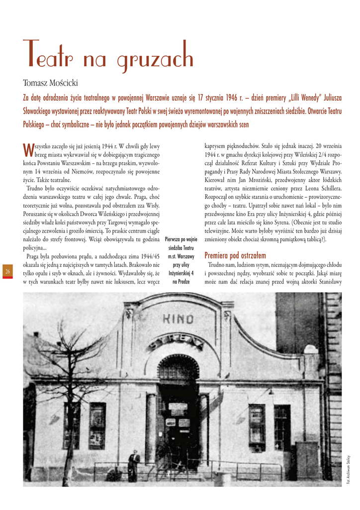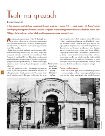 Teatr na gruzach IdbVhoBdÐX^X`^ JQ TQd _Tb_TjU^YQ ëiSYQ dUQdbQ\^UW_ g `_g_ZU^^UZ GQbcjQgYU ej^QZU cY !' cdiSj^YQ !)$& b ¿ TjYU³ `bU]YUbi Ñ<Y\\Y GU^UTiÁ :e\YecjQ C§_gQS[YUW_gicdQgY_^UZ`bjUjbUQ[dig_gQ^iDUQdb@_\c[YgcgUZÔgYUë_gibU]_^d_gQ^UZ`_g_ZU^^iSXj^YcjSjU^YQSXcYUTjYRYU?dgQbSYUDUQdbe @_\c[YUW_¿SX_|ci]R_\YSj^U¿^YURi§_ZUT^Q[`_Sjwd[YU]`_g_ZU^^iSXTjYUZggQbcjQgc[YSXcSU^ G 6_d1bSXYge]Cd_\YSi 26 kaprysem pięknoduchów. Stało się jednak inaczej. 20 września szystko zaczęło się już jesienią 1944 r. W chwili gdy lewy 1944 r. w gmachu dyrekcji kolejowej przy Wileńskiej 2/4 rozpobrzeg miasta wykrwawiał się w dobiegającym tragicznego czął działalność Referat Kultury i Sztuki przy Wydziale Prokońca Powstaniu Warszawskim – na brzegu praskim, wyzwolopagandy i Prasy Rady Narodowej Miasta Stołecznego Warszawy. nym 14 września od Niemców, rozpoczynało się powojenne Kierował nim Jan Mroziński, przedwojenny aktor łódzkich życie. Także teatralne. teatrów, artysta niezmiernie ceniony przez Leona Schillera. Trudno było oczywiście oczekiwać natychmiastowego odroRozpoczął on szybkie starania o uruchomienie – prowizorycznedzenia warszawskiego teatru w całej jego chwale. Praga, choć go choćby – teatru. Upatrzył sobie nawet nań lokal – było nim teoretycznie już wolna, pozostawała pod obstrzałem zza Wisły. przedwojenne kino Era przy ulicy Inżynierskiej 4, gdzie później Poruszanie się w okolicach Dworca Wileńskiego i przedwojennej przez całe lata mieściło się kino Syrena. (Obecnie jest tu studio siedziby władz kolei państwowych przy Targowej wymagało spetelewizyjne. Może warto byłoby wyróżnić ten bardzo już dzisiaj cjalnego zezwolenia i groziło śmiercią. To praskie centrum ciągle należało do strefy frontowej. Wciąż obowiązywała tu godzina @YUbgcjQ`_g_Z^YU zmieniony obiekt chociaż skromną pamiątkową tablicą?). policyjna... cYUTjYRQDUQdbe Praga była pozbawiona prądu, a nadchodząca zima 1944/45 ]cdGQbcjQgi @bU]YUbQ`_T_cdbjQ§U] okazała się jedną z najcięższych w tamtych latach. Brakowało nie Trudno nam, ludziom sytym, nieznającym dojmującego chłodu `bjie\YSi tylko opału i szyb w oknach, ale i żywności. Wydawałoby się, że 9^ëi^YUbc[YUZ$ i powszechnej nędzy, wyobrazić sobie te początki. Jakąś miarę w tych warunkach teatr byłby nawet nie luksusem, lecz wręcz może nam dać relacja znanej przed wojną aktorki Stanisławy ^Q@bQTjU skład mienia zagrożonego szabrem, mieszczący się w magazynie Kawińskiej: Byłam głodna. Przyszłam dowiedzieć się, czy to prawmebli „Wróblewski i S-ka” naprzeciwko teatru. To przedstawienie da, że w dyrekcji kolejowej jest chleb. Zobaczyłam po drodze na cieszyło się ogromnym powodzeniem i jako pierwsze doczekało filarze kartkę z zawiadomieniem, że artyści dramatyczni, artyści się prasowej recenzji. Spektakl został przyjęty życzliwie przez muzycy i personel techniczny winni zgłaszać się do pracy. Mroziński publiczność, która burzliwymi oklaskami reagowała na mocniejsze przywitał mnie z radością: od następnego dnia miałam już talerz akcenty sztuki. „Moralność pani Dulskiej” stanowi bez wątpienia zupy, bochenek chleba i próby. W takich właśnie warunkach: poważną pozycję w historii odrodzonego teatru warszawskiego głodu, zimna i powszechnego niedostatku – powstawało pierwi wkrótce już, mamy nadzieję, dorośnie do wymaganej odeń roli sze powojenne przedstawienie w Warszawie. Była to stara sztuka ważnego czynnika w odbudowie psychicznej narodu. Autorem Józefa Korzeniowskiego „Mistrz i czeladnik” w reżyserii Janusza tego tekstu zamieszczonego 12 grudnia w „Życiu Warszawy” Strachockiego i z dekoracjami Stanisławy Nowickiej, wówczas był Krzysztof Gruszczyński, w późniejszych latach autor socnoszącej jeszcze nazwisko Mrozińska. Dekoracje te mogły realistycznych dramatów i tekstu znanej pieśni masowej „Tysiąpowstać tylko dlatego, że ofiarni pracownicy teatru znaleźli na pobliskim Dworcu Wileńskim skład farb, których nie zdążono =QbcjQ§[_gc[Q(! ce rąk”. wywieźć z Warszawy. 23 listopada 1944 r. już o godz. 15 (ze g!)$%b względu na godzinę policyjną) odbyła się premiera przedstawie- De]YUÔSY§QcY <Ug_RbjUë^iDUQdb=Q§i nia. W drugiej części wieczoru złożona z powracających muzy- `YUbgcjQcSU^Q Dzieje tego pierwszego praskiego budynku teatralnego są barków Orkiestra m.st. Warszawy dała koncert, któremu towarzyszydzo krótkie. Nie przetrwał nawet miesiąca od pierwszej premiery. \Ug_RbjUë^UZ ły występy artystów baletu. Sztuka była grana wielokrotnie przy Około 18 grudnia niemiecki pocisk trafił w kamienicę przy GQbcjQgi pełnej widowni, pomimo wciąż gęsto padających pocisków, pomimo Wileńskiej 23, której gruzy przygniotły dach Syreny. Przepadły ¿DUQdb=Q§i skromnych środków artystycznych – wspominał to pierwsze przedstawienie Janusz Strachocki. 4e\c[Q^Q@bQTjU nr 1-2, styczeń-luty 2010 27 6_d;@SXUbc[Y Zespół Teatru m.st. Warszawy – bo tak nazwano ten pierwszy warszawski teatr – nie spoczął na laurach i jeszcze przed premierą „Mistrza i czeladnika” rozpoczął próby do następnej sztuki. Tym razem miała to być „Moralność pani Dulskiej” Gabrieli Zapolskiej, wystawiana według jedynego dostępnego wówczas egzemplarza tekstu, dostarczonego przez Kawińską. Reżyserował Zygmunt Bończa-Tomaszewski, przedstawienie powstawało w warunkach trudnych dziś do wyobrażenia. Na Pradze wciąż pozbawionej elektryczności jedynym źródłem światła były świeczki i szczyt ówczesnego luksusu – karbidówki. Zima tamtego roku była sroga. W prymitywnej, nieogrzewanej sali Syreny nie sposób było prowadzić prób, dlatego też najczęściej organizowano je w ocalałych mieszkaniach. Premiera odbyła się w mroźne sobotnie popołudnie 9 grudnia 1944 r. Pod szlafrokami czy sukienkami noszono swetry, flanele, co kto miał. Kostiumy w tej sztu