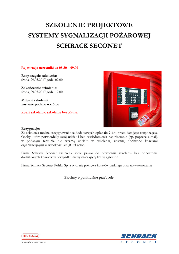 SZKOLENIE PROJEKTOWE SYSTEMY SYGNALIZACJI POŻAROWEJ SCHRACK SECONET Rejestracja uczestników: 08.30 – 09.00 Rozpoczęcie szkolenia: środa, 29.03.2017 godz. 09.00. Zakończenie szkolenia: środa, 29.03.2017 godz. 17.00. Miejsce szkolenia: zostanie podane wkrótce Koszt szkolenia: szkolenie bezpłatne. Rezygnacje: Ze szkolenia można zrezygnować bez dodatkowych opłat do 7 dni przed datą jego rozpoczęcia. Osoby, które potwierdziły swój udział i bez zawiadomienia nas pisemnie (np. poprzez e-mail) w podanym terminie nie wezmą udziału w szkoleniu, zostaną obciążone kosztami organizacyjnymi w wysokości 300,00 zł netto. Firma Schrack Seconet zastrzega sobie prawo do odwołania szkolenia bez ponoszenia dodatkowych kosztów w przypadku niewystarczającej liczby zgłoszeń. Firma Schrack Seconet Polska Sp. z o. o. nie pokrywa kosztów parkingu oraz zakwaterowania. Prosimy o punktualne przybycie. PROGRAM I ZAKRES SZKOLENIA Około godz. 13.00 do 13.30 zaplanowana jest przerwa obiadowa, podczas której uczestnicy bezpłatnie otrzymują 2-daniowy obiad. 1. Omówienie organizacji firmy i zakres oferty Schrack Seconet. Dźwiękowy System Ostrzegawczy 2. Możliwości i podstawowe funkcje Dźwiękowego Systemu Ostrzegawczego APS-APROSYS firmy G+M. 3. Dobór komponentów składowych systemu DSO. 4. Przykładowe konfiguracje systemu. System Sygnalizacji Pożarowej i Sterowania Stałymi Urządzeniami Gaszenia (SUG) 5. Przepisy i wytyczne projektowania systemów sygnalizacji pożarowej – podstawowe informacje. 6. Możliwości i podstawowe funkcje systemu Integral IP. Oprogramowanie systemowe w odniesieniu do realizacji założeń scenariusza rozwoju pożaru. 7. Konfiguracja central sygnalizacji pożarowej: a. Integral IP MXF, b. Integral IP CXF, c. Integral IP BXF. 8. Konfiguracja central sygnalizacji pożarowej/sterowania Stałymi Urządzeniami Gaszenia (SUG): a. Integral IP MXF/MXE, b. Integral IP CXF/CXE. 9. Urządzenia peryferyjne – magistrala urządzeń zewnętrznych MMI-BUS i EPI-BUS: a. Wyniesione panele wskazań i obsługi Integral MAP, b. Panel wskazań dla 8 stref gaszenia B3-MMI-IPEL, c. Panel wskazań dla 64 grup ostrzegaczy/instalacji tryskaczowych B3-MMIEAT64, d. Panele wskazań B5-MMI-PIP, e. Karty we/wy do sterowania tablicami synoptycznymi B3-MMI–UIO, f. Panel wskazań B5-EPI-PIC. 10.Praca central w sieci, stosowane konfiguracje i dobór kart sieciowych: a. Integral LAN, b. SecoNET. 11.Modernizacja systemu i rozbudowy istniejących instalacji. 12.Integracja z systemami BMS, SMS, systemami zarządzającymi. 13.System wizualizacji zdarzeń pożarowych SecoLOG IP 14.Zintegrowany system zarządzania bezpieczeństwem pożarowym SIS-FIRE 15.Zdalny dostęp do systemu - Integral over IP. 16.Technika linii pętlowych X-LINE. Parametry techniczne i schematy podłączeń najważniejszych elementów peryferyjnych. 17. Narzędzia do projektowania: a. Kalkulator pętli X-LINE, b. Bilans prądowy dla CSP Integral IP MX, c. Bilans prądowy dla CSP Integral IP CX, d. Konfigurator systemu, e. Narzędzie do projektowania Schrack Design Tool, f. Program do obliczania orurowania dla systemu zasysającego ASD 535/ASD 531 zgodnie z EN 54-20, 18.Elementy i urządzenia do zastosowań specjalnych: a. Czujki liniowe dymu, b. Czujki płomienia, c. System wczesnej detekcji dymu (system zasysający), d. Czujki liniowe ciepła, e. Urządzenia do stref EX. 19. Rozdanie zaświadczeń po odbyciu szkolenia.