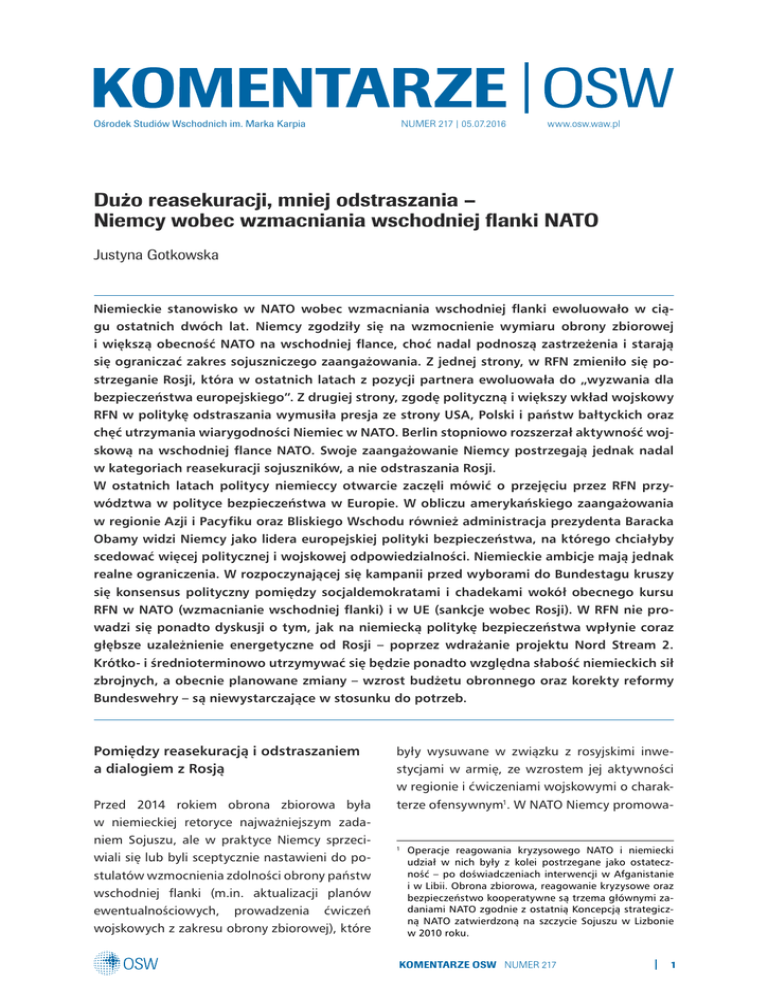 Ośrodek Studiów Wschodnich im. Marka Karpia NUMER 217 | 05.07.2016 www.osw.waw.pl Dużo reasekuracji, mniej odstraszania – Niemcy wobec wzmacniania wschodniej flanki NATO Justyna Gotkowska Niemieckie stanowisko w NATO wobec wzmacniania wschodniej flanki ewoluowało w ciągu ostatnich dwóch lat. Niemcy zgodziły się na wzmocnienie wymiaru obrony zbiorowej i większą obecność NATO na wschodniej flance, choć nadal podnoszą zastrzeżenia i starają się ograniczać zakres sojuszniczego zaangażowania. Z jednej strony, w RFN zmieniło się postrzeganie Rosji, która w ostatnich latach z pozycji partnera ewoluowała do „wyzwania dla bezpieczeństwa europejskiego”. Z drugiej strony, zgodę polityczną i większy wkład wojskowy RFN w politykę odstraszania wymusiła presja ze strony USA, Polski i państw bałtyckich oraz chęć utrzymania wiarygodności Niemiec w NATO. Berlin stopniowo rozszerzał aktywność wojskową na wschodniej flance NATO. Swoje zaangażowanie Niemcy postrzegają jednak nadal w kategoriach reasekuracji sojuszników, a nie odstraszania Rosji. W ostatnich latach politycy niemieccy otwarcie zaczęli mówić o przejęciu przez RFN przywództwa w polityce bezpieczeństwa w Europie. W obliczu amerykańskiego zaangażowania w regionie Azji i Pacyfiku oraz Bliskiego Wschodu również administracja prezydenta Baracka Obamy widzi Niemcy jako lidera europejskiej polityki bezpieczeństwa, na którego chciałyby scedować więcej politycznej i wojskowej odpowiedzialności. Niemieckie ambicje mają jednak realne ograniczenia. W rozpoczynającej się kampanii przed wyborami do Bundestagu kruszy się konsensus polityczny pomiędzy socjaldemokratami i chadekami wokół obecnego kursu RFN w NATO (wzmacnianie wschodniej flanki) i w UE (sankcje wobec Rosji). W RFN nie prowadzi się ponadto dyskusji o tym, jak na niemiecką politykę bezpieczeństwa wpłynie coraz głębsze uzależnienie energetyczne od Rosji – poprzez wdrażanie projektu Nord Stream 2. Krótko- i średnioterminowo utrzymywać się będzie ponadto względna słabość niemieckich sił zbrojnych, a obecnie planowane zmiany – wzrost budżetu obronnego oraz korekty reformy Bundeswehry – są niewystarczające w stosunku do potrzeb. Pomiędzy reasekuracją i odstraszaniem a dialogiem z Rosją Przed 2014 rokiem obrona zbiorowa była w niemieckiej retoryce najważniejszym zadaniem Sojuszu, ale w praktyce Niemcy sprzeciwiali się lub byli sceptycznie nastawieni do postulatów wzmocnienia zdolności obrony państw wschodniej flanki (m.in. aktualizacji planów ewentualnościowych, prowadzenia ćwiczeń wojskowych z zakresu obrony zbiorowej), które były wysuwane w związku z rosyjskimi inwestycjami w armię, ze wzrostem jej aktywności w regionie i ćwiczeniami wojskowymi o charakterze ofensywnym1. W NATO Niemcy promowa- Operacje reagowania kryzysowego NATO i niemiecki udział w nich były z kolei postrzegane jako ostateczność – po doświadczeniach interwencji w Afganistanie i w Libii. Obrona zbiorowa, reagowanie kryzysowe oraz bezpieczeństwo kooperatywne są trzema głównymi zadaniami NATO zgodnie z ostatnią Koncepcją strategiczną NATO zatwierdzoną na szczycie Sojuszu w Lizbonie w 2010 roku. 1 KOMENTARZE OSW NUMER 217 1 ły wzmacnianie filaru bezpieczeństwa kooperatywnego – rozwijania politycznego dialogu i współpracy dla utrzymania bezpieczeństwa w wymiarze regionalnym i globalnym. W RFN panowało przekonanie, że Niemcy i Europa powinny prowadzić wobec Rosji politykę dialogu i współpracy, ponieważ „bezpieczeństwo w Europie jest możliwe tylko z Rosją, a nie przeciw niej”2. Niemcy nadal postrzegają zaangażowanie na wschodniej flance bardziej w kategoriach reasekuracji sojuszników i wkładu w spójność Sojuszu niż odstraszania Rosji. Niemiecki rząd nie dostrzegał militarnego zagrożenia ze strony Moskwy i był zdania, że zwiększona aktywność NATO będzie jedynie wspierać rosyjskie tezy o jej rzekomym okrążeniu. Nie popierał więc ani nie uczestniczył w takich działaniach, które mogłyby być przedstawiane przez Rosję i interpretowane przez niemieckie społeczeństwo jako powrót do zimnowojennej konfrontacji3. Stanowisko RFN najlepiej pokazał minimalny udział Bundeswehry w ważnych dla wschodnich sojuszników natowskich ćwiczeniach Steadfast Jazz 2013 w Polsce i państwach bałtyckich. Były to pierwsze ćwiczenia Sojuszu4 oparte na scenariuszu obrony zbiorowej, które miały miejsce po zakończeniu zimnej wojny i rozszerzeniu NATO na Wschód. Niemieckie stanowisko w NATO wobec wzmacniania wschodniej flanki ewoluowało w ciągu ostatnich dwóch lat, po wybuchu konfliktu rosyjsko-ukraińskiego. Niemcy zgodziły się na Umowa koalicyjna CDU, CSU i SPD, Deutschlands Zukunft gestalten, 16.12.2013, https://www.cdu.de/sites/ default/files/media/dokumente/koalitionsvertrag.pdf 3 Justyna Gotkowska, Słabe ogniwo? Niemcy w zachodnim systemie bezpieczeństwa, Punkt Widzenia OSW, 15.01.2015, http://www.osw.waw.pl/pl/publikacje/ punkt-widzenia/2015-01-15/slabe-ogniwo-niemcy-w-zachodnim-systemie-bezpieczenstwa 4 Więcej zob.: Wojciech Lorenz, „Steadfast Jazz 2013” – NATO odzyskuje równowagę, Biuletyn PISM nr 62, 11.06.2013, http://www.pism.pl/publikacje/biuletyn/nr62-1038 2 wzmocnienie wymiaru obrony zbiorowej i większe zaangażowanie NATO na wschodniej flance, choć nadal podnoszą zastrzeżenia i starają się ograniczać zakres sojuszniczej obecności. Z jednej strony, wpłynęła na to zmiana postrzegania Rosji, która w ostatnich latach z pozycji partnera ewoluowała do strategicznego problemu i „wyzwania dla bezpieczeństwa europejskiego”5. Z drugiej strony, presja ze strony USA, Polski i państw bałtyckich wymusiły konieczność zmiany niemieckiego stanowiska i wkład RFN w politykę „odstraszania” – w celu utrzymania wiarygodności RFN w NATO i spójności Sojuszu. Niemcy nadal jednak postrzegają zaangażowanie na wschodniej flance bardziej w kate