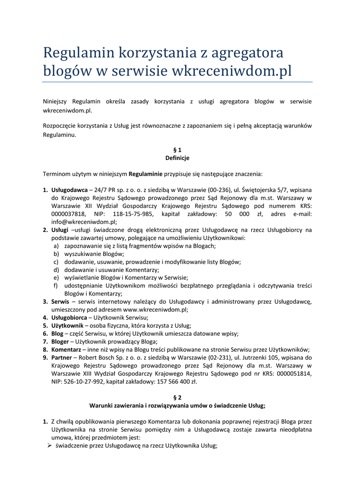 Regulamin korzystania z agregatora blogów w serwisie wkreceniwdom.pl Niniejszy Regulamin określa zasady korzystania z usługi agregatora blogów w serwisie wkreceniwdom.pl. Rozpoczęcie korzystania z Usług jest równoznaczne z zapoznaniem się i pełną akceptacją warunków Regulaminu. §1 Definicje Terminom użytym w niniejszym Regulaminie przypisuje się następujące znaczenia: 1. Usługodawca – 24/7 PR sp. z o. o. z siedzibą w Warszawie (00-236), ul. Świętojerska 5/7, wpisana do Krajowego Rejestru Sądowego prowadzonego przez Sąd Rejonowy dla m.st. Warszawy w Warszawie XII Wydział Gospodarczy Krajowego Rejestru Sądowego pod numerem KRS: 0000037818, NIP: 118-15-75-985, kapitał zakładowy: 50 000 zł, adres e-mail: [email protected]; 2. Usługi –usługi świadczone drogą elektroniczną przez Usługodawcę na rzecz Usługobiorcy na podstawie zawartej umowy, polegające na umożliwieniu Użytkownikowi: a) zapoznawanie się z listą fragmentów wpisów na Blogach; b) wyszukiwanie Blogów; c) dodawanie, usuwanie, prowadzenie i modyfikowanie listy Blogów; d) dodawanie i usuwanie Komentarzy; e) wyświetlanie Blogów i Komentarzy w Serwisie; f) udostępnianie Użytkownikom możliwości bezpłatnego przeglądania i odczytywania treści Blogów i Komentarzy; 3. Serwis – serwis internetowy należący do Usługodawcy i administrowany przez Usługodawcę, umieszczony pod adresem www.wkreceniwdom.pl; 4. Usługobiorca – Użytkownik Serwisu; 5. Użytkownik – osoba fizyczna, która korzysta z Usług; 6. Blog – część Serwisu, w której Użytkownik umieszcza datowane wpisy; 7. Bloger – Użytkownik prowadzący Bloga; 8. Komentarz – inne niż wpisy na Blogu treści publikowane na stronie Serwisu przez Użytkowników; 9. Partner – Robert Bosch Sp. z o. o. z siedzibą w Warszawie (02-231), ul. Jutrzenki 105, wpisana do Krajowego Rejestru Sądowego prowadzonego przez Sąd Rejonowy dla m.st. Warszawy w Warszawie XIII Wydział Gospodarczy Krajowego Rejestru Sądowego pod nr KRS: 0000051814, NIP: 526-10-27-992, kapitał zakładowy: 157 566 400 zł. §2 Warunki zawierania i rozwiązywania umów o świadczenie Usług; 1. Z chwilą opublikowania pierwszego Komentarza lub dokonania poprawnej rejestracji Bloga przez Użytkownika na stronie Serwisu pomiędzy nim a Usługodawcą zostaje zawarta nieodpłatna umowa, której przedmiotem jest: świadczenie przez Usługodawcę na rzecz Użytkownika Usług; zobowiązanie Blogera do umieszczenia na swoim Blogu oznaczenia w postaci dedykowanego banera i linku do strony głównej wkreceniwdom.pl. 2. Umowa wygasa w przypadku: a) wypowiedzenia przez Usługobiorcę dokonanego w każdym czasie poprzez wyrejestrowanie się z Serwisu; b) niekorzystania przez Usługobiorcę z Serwisu trwającego dłużej niż 12 miesięcy; c) wypowiedzenia przez Usługodawcę dokonanego poprzez wyrejestrowanie Użytkownika z Serwisu z powodu naruszenia przez Użytkownika istotnych postanowień niniejszego Regulaminu; d) zaprzestania prowadzenia Serwisu. §3 Licencja Z chwilą zawarcia umowy Użytkownik udziela Usługodawcy nieodpłatnie nieograniczonej w czasie i terytorialnie licencji na korzystanie z treści Bloga w zakresie: a) publicznego wyświetlania i odtwarzania poprzez wszelkie środki publicznego udostępniania w sposób umożliwiający każdemu odbiorcy dostęp w miejscu i w czasie przez siebie wybranym; b) udzielania sublicencji na wyżej wymienionych polach eksploatacji. §4 Warunki świadczenia Usług 1. Usługi świadczone są Usługobiorcom, którzy dysponują urządzeniem mającym dostęp do sieci Internet. 2. Zakazane jest dostarczanie i publikowanie przez Usługobiorcę w Serwisie jakichkolwiek treści o charakterze: a) bezprawnym; b) niezgodnym z zasadami Netykiety; c) reklamy lub informacji handlowej; 3. Treść Bloga powinna pozostawać w związku z tematyką Serwisu. 4. Wszelkie treści publikowane w Serwisie zamieszczane są na wyłączną odpowiedzialność Użytkowników. 5. Usługodawca dołoży należytej staranności w celu zapewnienia prawidłowego działania Serwisu, bezawaryjności i dostępności oraz udzielania Użytkownikom pomocy w rozwiązywaniu problemów dotyczących jego funkcjonowania. Jednocześnie Usługodawca uprawniony jest do czasowego wstrzymywania dostępu do Serwisu ze względów technicznych i konserwacyjnych. §5 Postępowanie reklamacyjne 1. Reklamacje dotyczące Usług, Usługobiorca może składać w formie pisemnej lub w formie elektronicznej na adres Usługodawcy wskazany w niniejszym Regulaminie. 2. Reklamacja powinna zawierać imię, nazwisko i adres Reklamującego oraz podstawę reklamacji wraz z uzasadnieniem. Reklamacje będą rozpatrywane w terminie 30 dni od dnia otrzymania. 1. 2. 3. 4. 5. §6 Dane osobowe Dane osobowe Użytkowników będą przetwarzane przez Usługodawcę w zakresie: imię i nazwisko oraz adres e-mail, zgodnie z warunkami określonymi w ogólnie obowiązujących przepisach, w tym zgodnie z ustawą o ochronie danych osobowych, w celach związanych ze świadczeniem Usług i korzystaniem z Serwisu, w tym w celach związanych z przeprowadzeniem konkursów i akcji organizowanych w Serwisie oraz otrzymywaniem informacji o tych konkursach i akcjach. Po wyrażeniu odrębnej zgody przez Użytkownika jego dane osobowe będą przetwarzane przez Usługodawcę również w celach marketingowych, w tym w celu przesyłania informacji handlowych pochodzących od Usługodawcy lub Partnera, w zakresie i na zasadach określonych w ustępie powyżej. Użytkownikowi przysługuje prawo wglądu do swoich danych osobowych, do ich poprawiania oraz do żądania zaprzestania ich przetwarzania, a podanie danych osobowych ma charakter dobrowolny. Administratorem danych osobowych Użytkowników jest Usługodawca. Po wygaśnięciu umowy Usługodawca nie będzie przetwarzać danych osobowych Usługobiorcy poza przypadkami dozwolonego użytku, określonymi przez powszechnie obowiązujące przepisy prawa. §7 Postanowieni