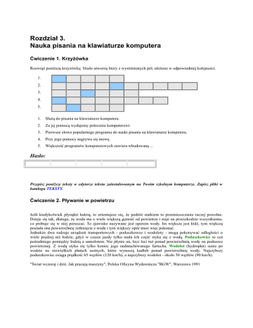 Rozdział 3. Nauka pisania na klawiaturze komputera Ćwiczenie 1. Krzyżówka Rozwiąż poniższą krzyżówkę. Hasło utworzą litery z wyróżnionych pól, ułożone w odpowiedniej kolejności. 1. 2. 3. 4. 5. 1. Służą do pisania na klawiaturze komputera. 2. Za jej pomocą wydajemy polecenia komputerowi. 3. Pierwsze słowo popularnego programu do nauki pisania na klawiaturze komputera. 4. Przy jego pomocy nagrywa się mowę. 5. Większość programów komputerowych zawiera wbudowaną ... Hasło: Przepisz poniższe teksty w edytorze tekstu zainstalowanym na Twoim szkolnym komputerze. Zapisz pliki w katalogu TEKSTY. Ćwiczenie 2. Pływanie w powietrzu Jeśli kiedykolwiek płynąłeś łodzią, to orientujesz się, że podróż statkiem to przemieszczanie raczej powolne. Dzieje się tak, dlatego, że woda ma o wiele większą gęstość od powietrza i staje na przeszkodzie wszystkiemu, co próbuje się w niej poruszać. To zjawisko nazywane jest oporem wody. Im większa jest łódź, tym większą posiada ona powierzchnię zetknięcia z woda i tym większy opór musi więc pokonać. Jednakże dwa rodzaje urządzeń transportowych - poduszkowce i wodoloty - mogą pokonywać odległości o wiele prędzej niż łodzie, gdyż w czasie jazdy tylko mała ich część styka się z wodą. Poduszkowiec to coś pośredniego pomiędzy łodzią a samolotem. Nie płynie on, lecz leci tuż ponad powierzchnią wody na poduszce powietrznej. Z wodą styka się tylko koniec jego nadmuchiwanego fartucha. Wodolot (hydropłat) sunie po wodzie na niewielkich płatach nośnych, które wynoszą kadłub ponad powierzchnię wody. Najszybszy poduszkowiec osiąga prędkość 65 węzłów (120 km/h), a najszybszy wodolot - około 50 węzłów (90 km/h). "Świat wczoraj i dziś. Jak pracują maszyny", Polska Oficyna Wydawnicza "BGW", Warszawa 1991 Ćwiczenie 3. Pierwsze dinozaury Przed około 220 milionami lat istniały na Ziemi liczne grupy dużych gadów. Jedną z tych grup były tekodonty. Miały one bardziej proste nogi niż inne gady oraz ostre zęby, którymi rozdzierały zdobycz; chętnie przebywały w wodzie. Wiele z nich było podobnych do dzisiejszych krokodyli, a ich przodkowie również byli przodkami krokodyli. Z tekodontów wywodzi się jeszcze jedna grupa gadów - dinozaury. Przed 205 milionami lat z tekodontów rozwinęły się dinozaury. Ich nogi były ustawione pionowo pod tułowiem, a niektóre z nich biegały na tylnych kończynach. Osiągały znaczną szybkość i utrzymywały równowagę przy pomocy ogona. Stosunkowo szybko wytworzyły się obydwie duże grupy dinozaurów: gadzio- i ptasiomiedniczne. Gadziomiedniczne (Saurischia), które pojawiły się wcześniej, dzieliły się na dwie grupy. Jedna z nich, do której należały prozauropody, takie jak np. plateozaur (Plateosaurus), była prawdopodobnie spokrewniona z olbrzymimi zauropodami, które były roślinożerne i poruszały się na czterech nogach. Drugą grupę stanowiły drapieżne teropody takie jak celofyz (Coelophysis), które biegały na dwóch nogach. "Świat wczoraj i dziś. Jak żyły dinozaury", Polska Oficyna Wydawnicza "BGW", Warszawa 1991 Ćwiczenie 4. Niebo w nocy W 1609 r. uczony Galileusz zbudował małą lunetę i użył jej do obserwacji nieba. Zdumiało go, jak dużo wówczas zobaczył: widział Księżyc pokryty kraterami i odkrył inne księżyce krążące wokół planety Jowisz. Dostrzegł więcej gwiazd niż ktokolwiek przedtem. W miarę, jak naukowcy budowali większe i lepsze teleskopy, przez które mogli zajrzeć dalej w Kosmos, uświadomili sobie, że wszystkie gwiazdy widziane z Ziemi tworzą ogromną grupę gwiazd zwaną galaktyką. Później daleko za nią zobaczyli inne galaktyki, a potem jeszcze dalej - tajemnicze kwazary, które wyglądają jak gwiazdy, lecz mogą być młodymi galaktykami. Pomiędzy gwiazdami obserwowali też jarzące się chmury pyłu i gazu, zwane mgławicami, oraz wybuchy gwiazd. Nowoczesne teleskopy działają niemal tak samo jak luneta Galileusza. Teraz, gdy teleskopy wysyła się w przestrzeń, a sondy kosmiczne odwiedzają różne planety, ciągle dowiadujemy się coraz więcej o niezbadanym jeszcze Kosmosie. "Świat wczoraj i dziś. Budowa wszechświata", Polska Oficyna Wydawnicza "BGW", Warszawa 1991 Ćwiczenie 5. Siedem cudów świata antycznego Grecki poeta Antypater z Sydonu ponad 2000 lat temu sporządził listę najsłynniejszych budowli i dzieł sztuki tamtych czasów. Budowle te stały się później znane na całym świecie pod nazwą "Siedmiu cudów świata". Nie wiemy dokładnie, dlaczego Antypater sporządził takie zestawienie. Możliwe, że posłużyło ono jako rodzaj przewodnika po wschodnim obszarze Morza Śródziemnego. Liczba tych cudów ma też przypuszczalnie swoje znaczenie. Już od dawien dawna liczbę siedem uznawano za świętą, a w zwyczajach ludowych i w religii wiązano ją ze szczególnymi lub tajemniczymi zdarzeniami. Jak należało oczekiwać, niektóre z tych cudów zawaliły się w ciągu stuleci i rozpadły w gruzy, a późniejsi pisarze sporządzali swoje własne listy "cudów świata". Cuda świata antycznego wyróżniały się wśród innych budowli różnych epok swoją wyjątkowością i niepowtarzalnością. Mogły to być ich niebywałe rozmiary, szczególny sposób budowy albo, po prostu, niezwykłe piękno. Wszystkie te budowle miały jedną cechę wspólną - samo ich istnienie wprowadzało ludzi każdorazowo w osłupienie i podziw. Lista siedmiu cudów świata antycznego: 1. Posąg Zeusa w Olimpii 2. Świątynia Artemidy w Efezie 3. Kolos Rodyjski 4. Latarnia morska w Aleksandrii 5. Mauzoleum w Halikarnasie 6. Wielkie piramidy w Egipcie 7. Wiszące Ogrody w Babilonie "Świat wczoraj i dziś. Siedem cudów świata", Polska Oficyna Wydawnicza "BGW", Warszawa 1990 Ćwiczenie 6. Lewiatan Nazwa lewiatan pochodzi z biblijnego Starego Testamentu. Oznacza wielkiego potwora morskiego, a później używano jej też do opisywania wszelkich du
