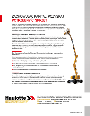 ZACHOWUJĄC KAPITAŁ, POZYSKAJ POTRZEBNY CI SPRZĘT Kapitał jest Ci potrzebny, by rozpocząć działalność firmy i pomnażać jej zyski. Środki trwałe takie jak sprzęt, maszyny, urządzenia są Ci potrzebne, by działać bardziej skutecznie i mieć przewagę konkurencyjną. Jedno i drugie ma ogromne znaczenie. Ale utrzymanie obydwu często wymaga znacznych wysiłków i właściwie dobranych rozwiązań finansowych. Sprawdź, czy możesz zachować swój kapitał i pozyskać potrzebne Ci wyposażenie i sprzęt – skontaktuj się z Haulotte Financial Services. Interesująca alternatywa do zakupu na własność Dzięki Haulotte Financial Services płacisz za użytkowany sprzęt / wyposażenie z budżetu operacyjnego, nie sięgając do rezerw kapitałowych. A na koniec okresu finansowania możesz wykupić sprzęt, często za ułamek jego pierwotnej wartości, wymienić go na model nowszej technologii, przedłużyć okres finansowania lub zwrócić go do Haulotte Financial Services. Znakomita większość firm, również tych największych i najlepiej sobie radzących na rynkach światowych, wykorzystuje jedną z dostępnych form finansowania zakupu sprzętu czy maszyn. Ta liczba będzie tylko rosnąć, ponieważ coraz więcej firm odkrywa szeroki wachlarz elastycznych rozwiązań finansowych dostępnych na rynku. Czy finansowanie Haulotte Financial Services jest właściwym rozwiązaniem dla Ciebie? Co jest lepsze dla prowadzenia Twojej działalności: elastyczne sposoby finansowania czy jednorazowy zakup za gotówkę? Kiedy będziesz podejmować decyzję, pomyśl o następujących kwestiach: Jaka będzie wartość sprzętu / maszyn na koniec ich cyklu życia? Czy będą w pełni funkcjonalne czy staną się przestarzałe przed końcem ich cyklu życia? C zy Twój kapitał lub linia kredytowa nie mogłyby być spożytkowane na co innego, stając się dźwignią finansową? Które rozwiązanie zapewniłoby Ci największe korzyści podatkowe? Dlaczego wybrać właśnie Haulotte i DLL? Z pewnością dlatego, że nasi doradcy finansowi mają świetną znajomość sektora, któremu oferują swoje usługi, służą Ci poradą i pomocą w wyborze produktów i usług oraz dopasują elastyczne rozwiązania finansowe, które zapewnią Ci osiągnięcie celów biznesowych i utrzymanie konkurencyjnej pozycji na rynku. Nasi specjaliści od finansowania zakupu sprzętu i maszyn gotowi są w każdej chwili odpowiedzieć na Twoje ewentualne pytania i wesprzeć Cię przy dokonywaniu transakcji. Jeśli chcesz dowiedzieć się więcej o korzyściach pozyskania sprzętu / maszyn za pośrednictwem Haulotte Financial Services, skontaktuj się z dedykowanym Ci przedstawicielem: Łukasz Puławski, Regionalny Kierownik Sprzedaży +48 22 279 47 47 +48 604 610 538 [email protected] 15HAUL005_Polish 11/15 DLACZEGO WARTO SKORZYSTAĆ Z NASZYCH ROZWIĄZAŃ FINANSOWYCH ISTNIEJE WIELE ISTOTNYCH POWODÓW, DLA KTÓRYCH WARTO WYBRAĆ HAULOTTE FINANCIAL SERVICES Twoje maszyny i sprzęt oraz to, w jaki sposób je finansujesz, są nierozłącznymi elementami, które przyczyniają się do sukcesu Twojej firmy. Mógłbyś cieszyć się dodatkowo udogodnieniem, jakie możemy Ci zapewnić, wyręczając Cię w obu tych obszarach. Haulotte, dzięki partnerskiej współpracy z DLL – jednym ze światowych liderów oferujących profesjonalne usługi finansowe, proponuje liczne rozwiązania finansowe dostosowane do Twoich potrzeb. Zapewnia dostęp do innowacyjnych maszyn i sprzętu, jakich potrzebujesz, a na które już nie będziesz musiał przeznaczać własnego kapitału czy też uciekać się do alternatywnych źródeł finansowania. Oto kilka powodów, dla których warto wybrać Haulotte Financial Services: Nie wydawaj gotówki Kup potrzebne Ci maszyny i urządzenia bez ponoszenia nakładów pieniężnych. W większości przypadków będziesz musiał dokonać jedynie opłaty wstępnej lub zaliczki. Bądź rezolutny – bądź elastyczny Nasze rozwiązania są dostosowane do praktycznie każdej możliwej sytuacji biznesowej, poczynając od elastycznych harmonogramów płatności a kończąc na finansowaniu dodatkowego wyposażenia, jakie może być wymagane w całym cyklu życia finansowanego urządzenia czy maszyny. Zdobądź przewagę technologiczną Zastosowanie najnowszych technologii czy innowacyjnego wyposażenia może dać Ci poważną przewagę konkurencyjną. Ale to, co dziś jest nowoczesne, jutro może okazać się przestarzałe. Dzięki Haulotte Financial Services możesz po zakończeniu umowy pozyskać nowszy i lepszy sprzęt. Ciesz się z korzyści podatkowych Przy odpowiednio wybranym modelu finansowania Twoje płatności mogą być w pełni zaliczane w koszty uzyskania przychodu. Dostosuj raty do przepływów pieniężnych Nasze elastyczne opcje finansowania pozwalają tak zaplanować płatności, aby pasowały do zmian następujących w Twoim cash flow. Jeśli Twoje źródło przychodów jest zmienne, Twoje płatności mogą być mniejsze gdy przychody spadają i większe gdy firma świetnie prosperuje i zarabia. Wybierz jedną z elastycznych opcji na koniec umowy leasingowej Wybór odpowiedniego produktu finansowego pozwoli Ci na koniec okresu leasingowania zdecydować, czy chcesz kontynuować leasing danego urzadzenia/maszyny, zwrócić je i podpisać umowę na całkiem nowe urządzenie, czy dokonać wykupu. Wybór należy do Ciebie. A jaki jest najważniejszy powód, dla którego powinieneś wybrać usługi finansowe proponowane przez Haulotte Financial Services? Finansowanie z nami jest proste i szybkie! Oferujemy Państwu liczne korzyści i wygodę korzystania z przystępnej formy finansowania oferowanej w jednym przejrzystym pakiecie. W większości przypadków wystarczy jeden telefon do rozpoczęcia stosownej procedury. W zależności od kwoty transakcji, zatwierdzenie kredytu może nastąpić jeszcze w dniu złożenia wniosku. A jeśli już masz przyznaną linię kredytową, może się to odbyć jeszcze 
